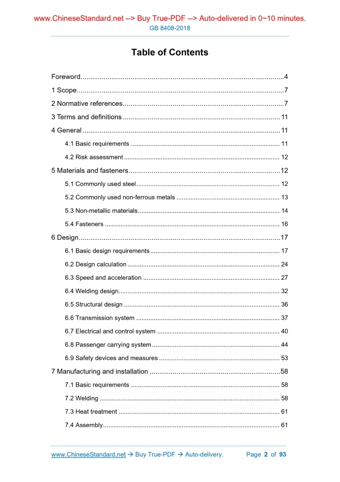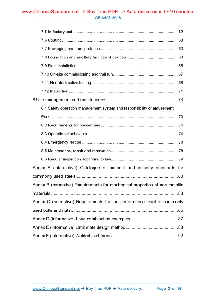 GB 8408-2018: Large-scale amusement device safety code---This is an excerpt. Full copy of true-PDF in English version (including equations, symbols, images, flow-chart, tables, and figures etc.), auto-downloaded/delivered in 9 seconds, can be purchased online: https://www.ChineseStandard.net/PDF.aspx/GB8408-2018GB NATIONAL STANDARD OF THE PEOPLE’S REPUBLIC OF CHINA ICS 97.200.40 Y 57 Replacing GB 8408-2008 Large-scale amusement device safety code Issued on: MAY 14, 2018 Implemented on: DECEMBER 01, 2018 Issued by. General Administration of Quality Supervision, Inspection and Quarantine of the People's Republic of China; Standardization Administration of the People's Republic of China. Table of ContentsForeword... 4 1 Scope... 7 2 Normative references... 7 3 Terms and definitions... 11 4 General... 11 5 Materials and fasteners... 12 6 Design... 17 7 Manufacturing and installation... 58 8 Use management and maintenance... 73 8.1 Safety operation management system and responsibility of amusement Annex A (informative) Catalogue of national and industry standards for commonly used steels... 80 Annex B (normative) Requirements for mechanical properties of non-metallic materials... 83 Annex C (normative) Requirements for the performance level of commonly used bolts and nuts... 85 Annex D (informative) Load combination examples... 87 Annex E (informative) Limit state design method... 88 Annex F (informative) Welded joint forms... 921 ScopeThis Standard specifies the basic safety requirements for the general rules, materials and fasteners, design, manufacturing and installation, use management and maintenance of large-scale amusement devices (hereinafter referred to as amusement devices). This Standard applies to large-scale amusement devices. This Standard does not apply to competitive sport devices and fitness devices.2 Normative referencesThe following referenced documents are indispensable for the application of this document. For dated references, only the edition cited applies. For undated references, the latest edition of the referenced document (including any amendments) applies. GB/T 699 Quality carbon structure steels GB/T 709-2006 Dimension, shape, weight and tolerances for hot-rolled steel plates and sheets GB/T 715 Hot-rolled round carbon steel bars for standard parts GB/T 983 Covered electrodes for manual metal arc welding of stainless and heat-resisting steels GB/T 985.1 Recommended joint preparation for gas welding, manual metal arc welding, gas-shield arc welding and beam welding GB/T 985.2 Recommended joint preparation for submerged arc welding GB/T 1173 Casting aluminium alloys3 Terms and definitionsFor the purpose of this document, the terms and definitions defined in GB/T 20306 apply.4 General4.1 Basic requirements 4.2 Risk assessment5 Materials and fasteners5.1 Commonly used steel 5.1.1 The steel used in amusement devices shall comply with the specifications 5.2 Commonly used non-ferrous metals 5.3 Non-metallic materials 5.4 Fasteners6 Design6.1 Basic design requirements 6.1.1 Basic requirements 6.1.1.1 The design of amusement devices shall have design instructions, calculation instructions, use and maintenance instructions and a full set of drawings, risk assessment reports and design verification outlines complying with the relevant national standards. The above information shall be kept until at least the amusement devices are scrapped. 6.1.1.2 The design of amusement devices and auxiliary devices shall be calculated correctly and reasonably structured to ensure passenger safety. When accurate calculation cannot be performed, it can be confirmed and verified by tests. 6.1.1.3 Operation and use organizations or design commissioners shall provide the local meteorological, power supply, seismic and geological data in written form to the design and manufacturing organizations. 6.1.1.4 The selection of materials shall be based on the consideration of structural importance, load characteristics, structural forms, stress conditions, manufacturing processes, connection methods and work environment. 6.1.1.5 The mechanical properties, heat treatment performance and welding performance of metal materials used for important mechanical parts shall meet the requirements of working conditions. 6.1.1.6 Amusement devices shall specify the design service life of the complete machine and its main components. The calculated design life of the complete machine shall be not less than 35000 hours, including the getting on/off time. 6.1.1.7 The use and maintenance instructions shall be in simplified Chinese. For multilingual versions, the simplified Chinese version shall prevail. At least the following contents shall be included. a) Device overview and structure introduction; b) Technical performance and parameters, operating conditions; c) Operational procedures and precautions; d) Notice to passengers; e) Maintenance instructions; f) Common faults and remedies; g) Design service life of the complete machine and main components; h) Requirements for management, operation, maintenance, service personnel; i) List of vulnerable parts, scrapping requirements and recommended replacement cycle; j) Passenger grooming measures and methods in abnormal conditions; k) Safety requirements such as number of passengers, height requirements, age range, physical limitations, and whether children need to be under adult supervision; l) Items and inspection requirements for daily inspections, weekly inspections, monthly inspections (including seasonal inspections and semi-annual inspections) and annual inspections (including multi-year inspections), and corresponding inspections, testing (including non- destructive testing) and test methods, and the proportion of inspections and testing, etc.; m) For travelling amusement devices, there shall be installation and commissioning methods, site requirements, etc.; n) General assembly drawings, electrical schematic diagrams, hydraulic and pneumatic schematic diagrams, 