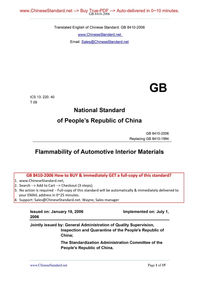 GB 8410-2006: Flammability of automotive interior materials Delivery: 9 seconds. True-PDF full-copy in English & invoice will be downloaded + auto-delivered via email. See step-by-step procedure Status: Valid GB 8410: Historical versions