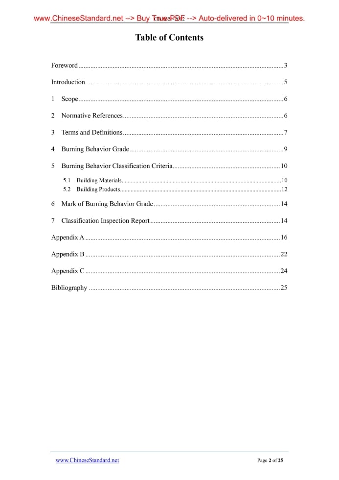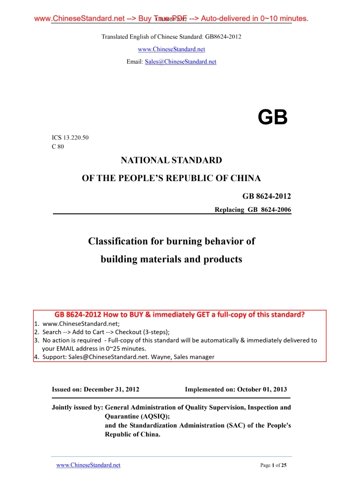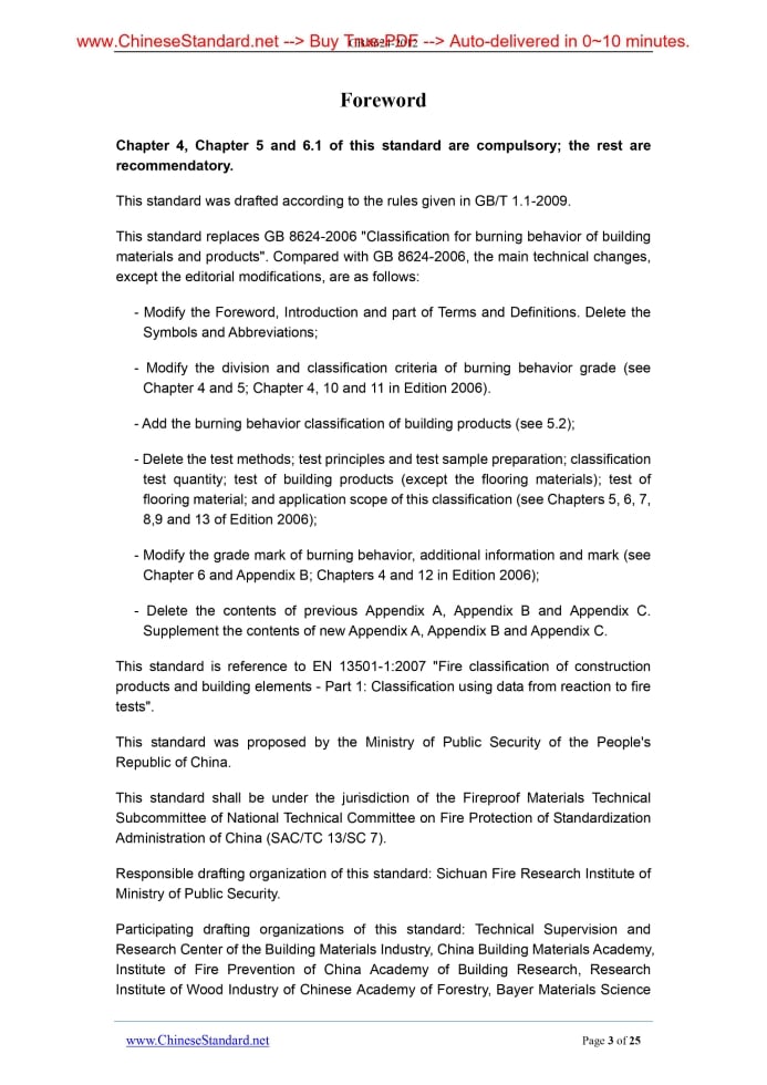 Similar standardsGB 8624-2012: Classification for burning behavior of building materials and products---This is an excerpt. Full copy of true-PDF in English version (including equations, symbols, images, flow-chart, tables, and figures etc.), auto-downloaded/delivered in 9 seconds, can be purchased online: https://www.ChineseStandard.net/PDF.aspx/GB8624-2012GB ICS 13.220.50 C 80 NATIONAL STANDARD Replacing GB 8624-2006 Classification for burning behavior of building materials and products Issued on. DECEMBER 31, 2012 Implemented on. OCTOBER 01, 2013 Jointly issued by. General Administration of Quality Supervision, Inspection and Quarantine (AQSIQ); and the Standardization Administration (SAC) of the People's Republic of China. Table of ContentsForeword... 3 Introduction... 5 1 Scope... 6 2 Normative References... 6 3 Terms and Definitions... 7 4 Burning Behavior Grade... 9 5 Burning Behavior Classification Criteria... 10 5.1 Building Materials... 10 5.2 Building Products... 12 6 Mark of Burning Behavior Grade... 14 7 Classification Inspection Report... 14 Appendix A... 16 Appendix B... 22 Appendix C... 24 Bibliography... 25ForewordChapter 4, Chapter 5 and 6.1 of this standard are compulsory; the rest are recommendatory. This standard was drafted according to the rules given in GB/T 1.1-2009. This standard replaces GB 8624-2006 "Classification for burning behavior of building materials and products". Compared with GB 8624-2006, the main technical changes, except the editorial modifications, are as follows. - Modify the Foreword, Introduction and part of Terms and Definitions. Delete the Symbols and Abbreviations; - Modify the division and classification criteria of burning behavior grade (see Chapter 4 and 5; Chapter 4, 10 and 11 in Edition 2006). - Add the burning behavior classification of building products (see 5.2); - Delete the test methods; test principles and test sample preparation; classification test quantity; test of building products (except the flooring materials); test of flooring material; and application scope of this classification (see Chapters 5, 6, 7, 8,9 and 13 of Edition 2006); - Modify the grade mark of burning behavior, additional information and mark (see Chapter 6 and Appendix B; Chapters 4 and 12 in Edition 2006); - Delete the contents of previous Appendix A, Appendix B and Appendix C. Supplement the contents of new Appendix A, Appendix B and Appendix C. This standard is reference to EN 13501-1.2007 "Fire classification of construction products and building elements - Part 1.Classification using data from reaction to fire tests". This standard was proposed by the Ministry of Public Security of the People's Republic of China. This standard shall be under the jurisdiction of the Fireproof Materials Technical Subcommittee of National Technical Committee on Fire Protection of Standardization Administration of China (SAC/TC 13/SC 7). Responsible drafting organization of this standard. Sichuan Fire Research Institute of Ministry of Public Security. Participating drafting organizations of this standard. Technical Supervision and Research Center of the Building Materials Industry, China Building Materials Academy, Institute of Fire Prevention of China Academy of Building Research, Research Institute of Wood Industry of Chinese Academy of Forestry, Bayer Materials Science (China) Co., Ltd., Armacell Thermal Insulation Materials (Guangzhou) Co., Ltd., Owens Corning (China) Investment Co., Ltd., Aeroflex International Co., Ltd. Shanghai Armstrong Building Products Co., Ltd., Huamei Group Co., Ltd., Changzhou Jingxue Insulation Technology Co., Ltd., Kingfa Science and Technology Co., Ltd., Wanhua Chemical Group Co., Ltd., and Feininger (Nanjing) Energy Saving Technology Co., Ltd. Main drafting staffs of this standard. Li Feng, Zhao Chenggang, Lu Guojian, Zeng Xubin, Deng Xiaobing, Liu Songlin, Liu Wuqiang, Liu Haibo, Ma Daozhen, and Chen Zhilin. The previous editions of this standard are. - GB 8624-1988, GB 8624-1997 and GB 8624-2006.1 ScopeThis standard specifies the terms and definitions, burning behavior grades, burning behavior grade criteria, burning behavior grade identification and inspection report of building materials and products. This standard is applicable to burning behavior classification and judgment of building materials, decoration materials and products in construction engineering.2 Normative ReferencesThe following referenced documents are indispensable for the application of this document. For dated references, only the edition cited applies. For undated references, the latest edition of the normative document (including all corrigenda) applies. GB/T 2406.2 Plastics - Determination of Burning Behavior by Oxygen Index - Part 2.Ambient-temperature Test GB/T 8408 Plastics - Determination of Burning Characteristics - Horizontal and Vertical Test GB/T 5169.16 Fire Hazard Testing for Electric and Electronic Products - Part 16. Test Flames - 50W Horizontal and Vertical Flame Test Methods GB/T 6454 Textiles - Burning Behavior - Oxygen Index Method GB/T 5455 Textiles - Burning Behavior - Vertical Method GB/T 5464 Non-combustibility Test Method of Building Materials GIB/T 5907 Fundamental Terminology of Fire Protection. Part 1 GB/T 8333 Test Method for Flammability of Rigid Cellular Plastic - Vertical Burning Method GB/T 8626 Test Method of Flammability for Building Materials GB/T 8627 Test Method for Density of Smoke from the Burning or Decomposition of Building Materials GB/T 11785 Reaction to Fire Tests for Floorings - Determination of the Burning Behavior Using a Radiant Heat Source GB/T 14402 Reaction to Fire Tests for Building Materials and Products - Determination of the Heat of Combustion GB/T 16172 Test Method for Heat Release Rate of Building Mate GB/T 17596 Textiles - Commercial Laundering Procedure for Textile Fabrics Prior to Flammability Testing GB 17927.1 Upholstered furniture - Assessment of the Resistance to Ignition of Mattress and Sofa - Part 1