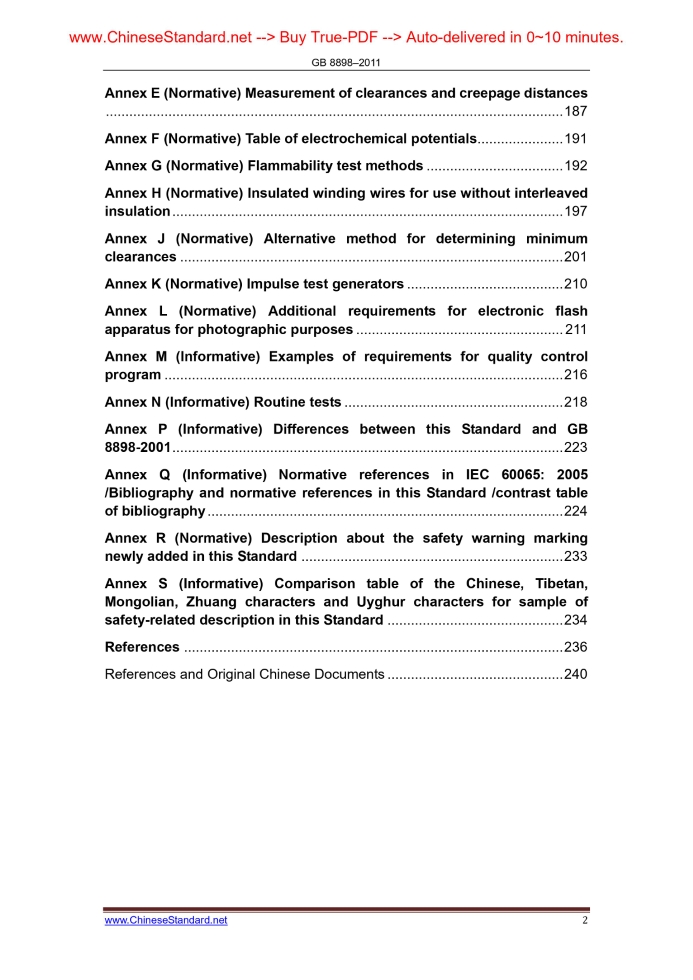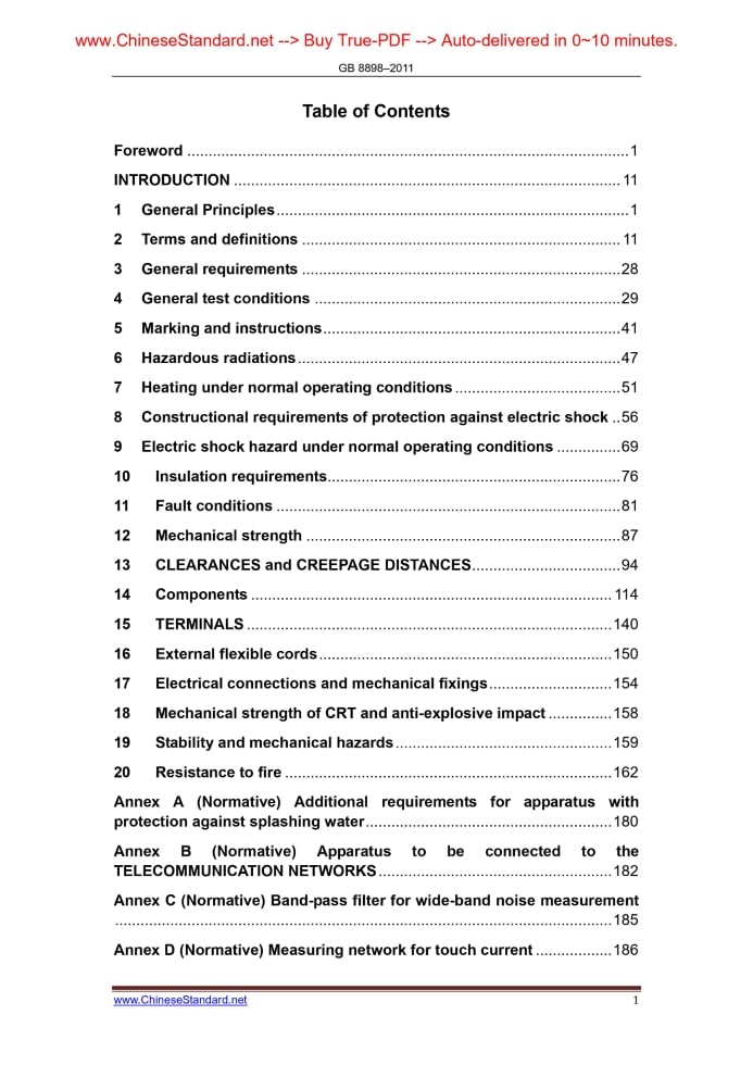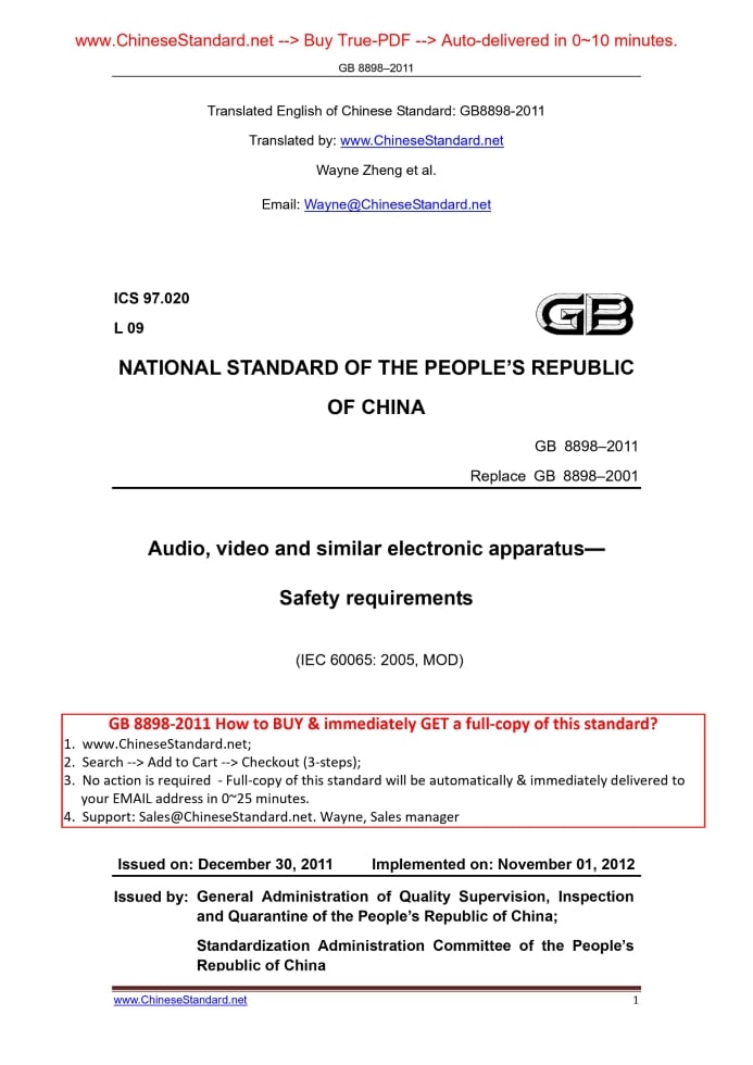Similar standardsGB 8898-2011: [Replaced by GB 4943.1-2022] Audio, video and similar electronic apparatus -- Safety requirements---This is an excerpt. Full copy of true-PDF in English version (including equations, symbols, images, flow-chart, tables, and figures etc.), auto-downloaded/delivered in 9 seconds, can be purchased online: https://www.ChineseStandard.net/PDF.aspx/GB8898-2011 ICS 97.020 L 09 NATIONAL STANDARD OF THE PEOPLE’S REPUBLIC OF CHINA Replace GB 8898–2001 Audio, video and similar electronic apparatus— Safety requirements (IEC 60065.2005, MOD) Issued on: DECEMBER 30, 2011 Implemented on: NOVEMBER 01, 2012 Issued by. General Administration of Quality Supervision, Inspection and Quarantine of the People’s Republic of China; Standardization Administration Committee of the People’s Republic of China Table of ContentsForeword... 1 INTRODUCTION... 11 1 General Principles... 1 2 Terms and definitions... 11 3 General requirements... 28 4 General test conditions... 29 5 Marking and instructions... 41 6 Hazardous radiations... 47 7 Heating under normal operating conditions... 51 8 Constructional requirements of protection against electric shock.. 56 9 Electric shock hazard under normal operating conditions... 69 10 Insulation requirements... 76 11 Fault conditions... 81 12 Mechanical strength... 87 13 CLEARANCES and CREEPAGE DISTANCES... 94 14 Components... 114 15 TERMINALS... 140 16 External flexible cords... 150 17 Electrical connections and mechanical fixings... 154 18 Mechanical strength of CRT and anti-explosive impact... 158 19 Stability and mechanical hazards... 159 20 Resistance to fire... 162 Annex A (Normative) Additional requirements for apparatus with protection against splashing water... 180 Annex B (Normative) Apparatus to be connected to the TELECOMMUNICATION NETWORKS... 182 Annex C (Normative) Band-pass filter for wide-band noise measurement ... 185 Annex D (Normative) Measuring network for touch current... 186 Annex E (Normative) Measurement of clearances and creepage distances ... 187 Annex F (Normative) Table of electrochemical potentials... 191 Annex G (Normative) Flammability test methods... 192 Annex H (Normative) Insulated winding wires for use without interleaved insulation... 197 Annex J (Normative) Alternative method for determining minimum clearances... 201 Annex K (Normative) Impulse test generators... 210 Annex L (Normative) Additional requirements for electronic flash apparatus for photographic purposes... 211 Annex M (Informative) Examples of requirements for quality control program... 216 Annex N (Informative) Routine tests... 218 Annex P (Informative) Differences between this Standard and GB 8898-2001... 223 Annex Q (Informative) Normative references in IEC 60065.2005 /Bibliography and normative references in this Standard /contrast table of bibliography... 224 Annex R (Normative) Description about the safety warning marking newly added in this Standard... 233 Annex S (Informative) Comparison table of the Chinese, Tibetan, Mongolian, Zhuang characters and Uyghur characters for sample of safety-related description in this Standard... 234 References... 236 References and Original Chinese Documents... 240ForewordAll the technical contents in this Standard are mandatory. This Standard is drafted according to the rules specified in GB/T 1.1-2009. By using redrafting-method, this Standard modifies and adopts the international standard IEC 60065.2005 Section 7.1 Safety Requirements for Audio, Video and Similar Electronic Equipment (English version). The technical differences between this Standard and IEC 60065.2005 are. a) Marking of the power rating value The marking of the rated voltage and frequency in 5.1e) and f) of IEC 60065.2005 does not clearly specify specific values, which is only expressed with example, and the voltage in the example never includes Chinese voltage. According to the power grid and power supply requirements in China, the supply voltage is 220V, 50Hz or three-phase 380V and 50Hz. Therefore, this Standard 5.1e) clearly specifies the rating of power supply. the single rated voltage shall be marked as 220V or three-phase as 380V. The rated voltage range shall include 220V or three-phase 380V. For multiple rated voltage, one of which must be 220V or three-phase 380V; and 220V or three-phase 380V must be set [Translator. as default] when leaving the factory. For multiple rated voltage ranges, 220V or three-phase 380V shall be included; and 220V voltage range or three-phase 380V voltage range shall be set [Translator. as default] when leaving the factory. Rated frequency or rated frequency range is clearly specified under 5.1f) in this Standard. rated frequency or rated frequency range shall be 50Hz or inclusive 50Hz. b) Safety instructions Safety instruction is clearly specified, the description “The language acceptable for the country where the equipment is intended for use in shall be used” in 5.4 is changed to “Standard Chinese shall be used”. In Chapter 5, safety warnings and warning signs are added for operational conditions under altitude and tropical climate. For the equipment which is only applicable to region below altitude 2,000m, “Only applicable to regions below altitude 2,000m for safe operation” or similar warning statement or marking symbols shall be provided at prominent location of the equipment. For equipment which is only applicable to non-tropical climates. “Only applicable to non-tropical climates for safe operation” or similar warning statement or marking symbols shall be provided at prominent location of the equipment. If marking symbol is used separately, the explanation of meaning shall be provided in the instructions. Safety warning statement (for example, warning statements – to be used below the altitude 2,000m; to be used in non-tropical climates) shall be in the language acceptable for the targeted market. Add Annex R, and provide instructions of new safety warning marking. Add A