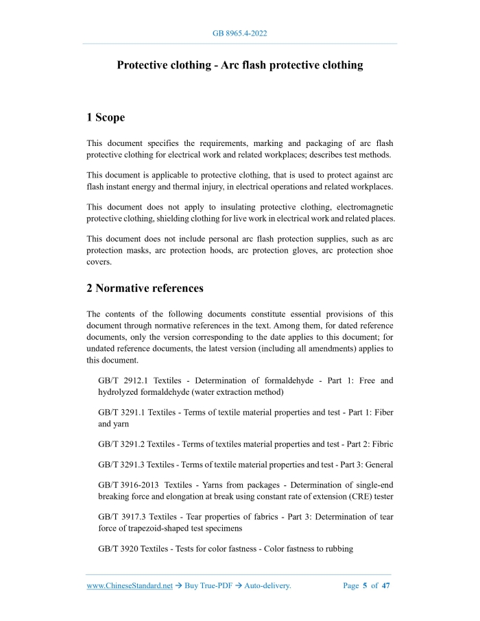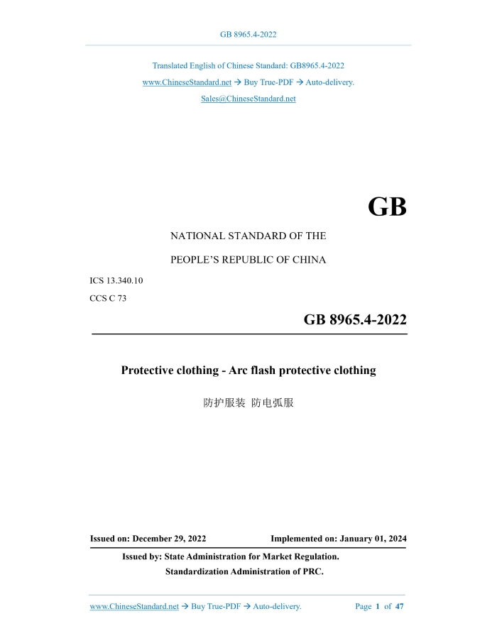 GB 8965.4-2022: Protective clothing - Arc flash protective clothing Delivery: 9 seconds. True-PDF full-copy in English & invoice will be downloaded + auto-delivered via email. See step-by-step procedure Status: Valid
