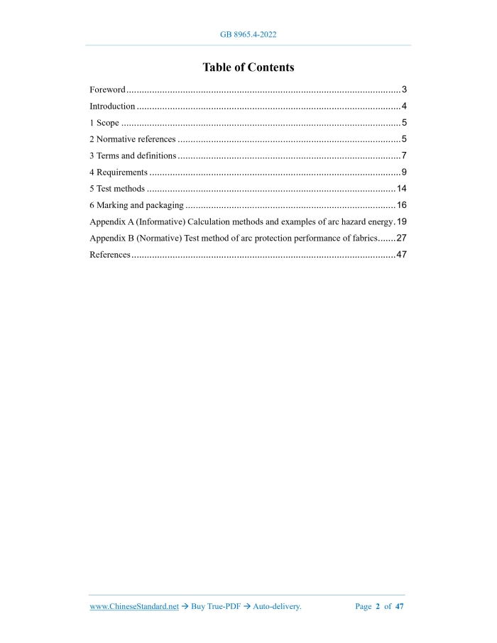 Similar standardsGB 8965.4-2022: Protective clothing - Arc flash protective clothing---This is an excerpt. Full copy of true-PDF in English version (including equations, symbols, images, flow-chart, tables, and figures etc.), auto-downloaded/delivered in 9 seconds, can be purchased online: https://www.ChineseStandard.net/PDF.aspx/GB8965.4-2022GB NATIONAL STANDARD OF THE PEOPLE’S REPUBLIC OF CHINA ICS 13.340.10 CCS C 73 Protective clothing - Arc flash protective clothing Issued on. DECEMBER 29, 2022 Implemented on. JANUARY 01, 2024 Issued by. State Administration for Market Regulation. Standardization Administration of PRC. Table of ContentsForeword... 3 Introduction... 4 1 Scope... 5 2 Normative references... 5 3 Terms and definitions... 7 4 Requirements... 9 5 Test methods... 14 6 Marking and packaging... 16 Appendix A (Informative) Calculation methods and examples of arc hazard energy. 19 Appendix B (Normative) Test method of arc protection performance of fabrics... 27 References... 47ForewordThis document is drafted in accordance with the provisions of GB/T 1.1-2020 "Directives for standardization - Part 1.Rules for the structure and drafting of standardizing documents". This document is Part 4 of GB 8965 "Protective clothing". GB 8965 has released the following parts. - GB 8965.1-2020 Protective clothing - Flame retardant protective clothing; - GB 8965.2-2022 Protective clothing - Flame-retardant protection - Part 2. Protective clothing for welders; - GB 8965.3-2022 Protective clothing - Clothing to protect against molten metal splash; - GB 8965.4-2022 Protective clothing - Arc flash protective clothing. Please note that some content in this document may be subject to patents. The publisher of this document assumes no responsibility for identifying patents. This document was proposed by AND shall be under the jurisdiction of the Ministry of Emergency Management of the People's Republic of China.1 ScopeThis document specifies the requirements, marking and packaging of arc flash protective clothing for electrical work and related workplaces; describes test methods. This document is applicable to protective clothing, that is used to protect against arc flash instant energy and thermal injury, in electrical operations and related workplaces. This document does not apply to insulating protective clothing, electromagnetic protective clothing, shielding clothing for live work in electrical work and related places. This document does not include personal arc flash protection supplies, such as arc protection masks, arc protection hoods, arc protection gloves, arc protection shoe covers.2 Normative referencesThe contents of the following documents constitute essential provisions of this document through normative references in the text. Among them, for dated reference documents, only the version corresponding to the date applies to this document; for undated reference documents, the latest version (including all amendments) applies to this document. GB/T 2912.1 Textiles - Determination of formaldehyde - Part 1.Free and hydrolyzed formaldehyde (water extraction method) GB/T 3291.1 Textiles - Terms of textile material properties and test - Part 1.Fiber and yarn GB/T 3291.2 Textiles - Terms of textiles material properties and test - Part 2.Fibric GB/T 3291.3 Textiles - Terms of textile material properties and test - Part 3.General GB/T 3916-2013 Textiles - Yarns from packages - Determination of single-end breaking force and elongation at break using constant rate of extension (CRE) tester GB/T 3917.3 Textiles - Tear properties of fabrics - Part 3.Determination of tear force of trapezoid-shaped test specimens GB/T 3920 Textiles - Tests for color fastness - Color fastness to rubbing3 Terms and definitionsThe terms and definitions as defined in GB/T 12903, GB/T 3291.1 ~ 3291.3, GB 8965.1-2020, as well as the following terms and definitions, apply to this document. 3.1 Electric arc The instantaneous sparks and energy produced by the passage of electric current through some insulating medium (such as air). Note. Arc is a gas discharge phenomenon. 3.2 Arc hazard The injury to personnel or damage to equipment, which is caused by the huge energy released by the arc flash. 3.3 Arc flash protective clothing Protective clothing used to protect the torso and limbs of persons who may be exposed to arc or related thermal hazards. 3.4 Arc hazard energy The superposition, which is obtained by multiplying the instantaneous arc voltage value by the instantaneous arc current value, then by the incremental time of arc release. 3.5 Stoll curves A standard curve, which is used to predict the relationship between time to achieve second-degree burns and thermal energy. Note. Energy values falling above the Stoll curve are likely to cause second-degree burns, whilst energy values falling below the Stoll curve are less likely to cause second-degree burns.4 Requirements4.1 Materials 4.1.1 Fabric 4.1.1.2 Flame retardancy The flame retardancy of fabrics shall meet the requirements of Table 2, before washing and after washing, according to the washing procedures specified in 5.3. 4.1.1.3 Physical and chemical properties The physical and chemical properties of the fabric shall meet the requirements in Table 3.The technical requirements for "woven fabrics" or "knitted fabrics" are not marked in the Table and are applicable to all types of fabrics. 4.1.3 Sewing thread 4.1.3.1 Strength The single thread strength of the sewing thread shall not be less than 10 N. 4.1.3.2 Thermal resistance The sewing thread has been tested for thermal resistance and shall be free of melting and scorching. 4.1.4 Supporting materials and accessories 4.4 Structural design 4.4.1 Arc flash protective clothing and accompanying protective equipment shall completely cover the exposed areas of the body; the clothing shall be long-sleeved to protect the entire upper body. 4.4.2 The design and connection parts of arc flash protective clothing shall ensure e
