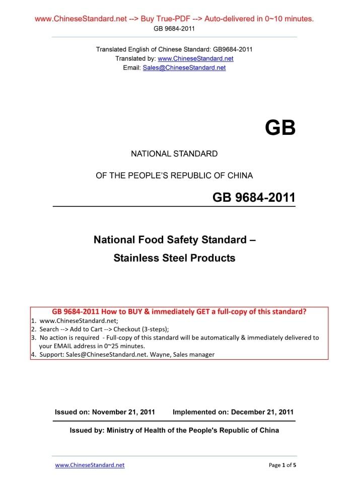 GB 9684-2011: National food safety standard -- Stainless steel products Delivery: 9 seconds. True-PDF full-copy in English & invoice will be downloaded + auto-delivered via email. See step-by-step procedure Status: Obsolete GB 9684: Historical versions