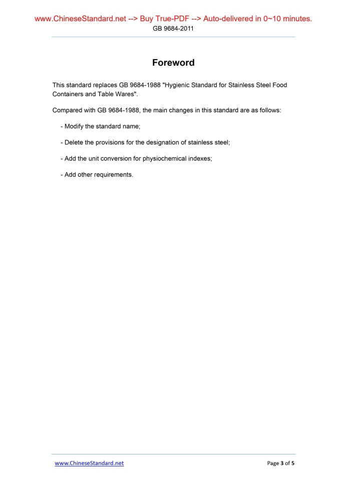 GB 9684-2011: National food safety standard -- Stainless steel products---This is an excerpt. Full copy of true-PDF in English version (including equations, symbols, images, flow-chart, tables, and figures etc.), auto-downloaded/delivered in 9 seconds, can be purchased online: https://www.ChineseStandard.net/PDF.aspx/GB9684-2011GB NATIONAL STANDARD National Food Safety Standard – Stainless Steel Products Issued on. NOVEMBER 21, 2011 Implemented on. DECEMBER 21, 2011 Issued by. Ministry of Health of the People's Republic of China Table of ContentsForeword... 3 1 Scope... 4 2 Terms and Definitions... 4 3 Technical Requirements... 4 4 Others... 5ForewordThis standard replaces GB 9684-1988 "Hygienic Standard for Stainless Steel Food Containers and Table Wares". Compared with GB 9684-1988, the main changes in this standard are as follows. - Modify the standard name; - Delete the provisions for the designation of stainless steel; - Add the unit conversion for physiochemical indexes; - Add other requirements. National Food Safety Standard – Stainless Steel Products1 ScopeThis standard is applicable to food containers, food production management tools and equipment that use the stainless steel as the main-body.2 Terms and Definitions2.1 Food containers The cooking utensils, dinnerware, tableware, and other containers that are used for producing, processing, cooking and storing foods. 2.2 Dinnerware The dinning tools such as knives, forks, spoons, and chopsticks that are used to directly contact foods. 2.3 Main-body The stainless steel part, in the stainless steel food containers and tableware, that contacts foods.3 Technical Requirements3.1 Raw material requirements 3.1.1 Main-body materials For main-body of the foods containers, food production management tools and equipment, it shall adopt stainless steel material such as Austenite stainless steel, Austenite · 3.1.2 Non-main-body materials Non-main-body that contacts food in the food containers and mechanical equipment may be made of other materials such as metal, glass, rubber and plastics. 3.3 Physiochemical indexes Physiochemical indexes shall meet those specified in Table 1.4 Others4.1 "Food Contact" shall be marked on the product or the smallest sales package. ......Source: Above contents are excerpted from the full-copy PDF -- translated/reviewed by: www.ChineseStandard.net / Wayne Zheng et al. Tips & Frequently Asked Questions:Question 1: How long will the true-PDF of English version of GB 9684-2011 be delivered?Answer: The full copy PDF of English version of GB 9684-2011 can be downloaded in 9 seconds, and it will also be emailed to you in 9 seconds (double mechanisms to ensure the delivery reliably), with PDF-invoice.Question 2: Can I share the purchased PDF of GB 9684-2011_English with my colleagues?Answer: Yes. The purchased PDF of GB 9684-2011_English will be deemed to be sold to your employer/organization who actually paid for it, including your colleagues and your employer's intranet.Question 3: Does the price include tax/VAT?Answer: Yes. Our tax invoice, downloaded/delivered in 9 seconds, includes all tax/VAT and complies with 100+ countries' tax regulations (tax exempted in 100+ countries) -- See Avoidance of Double Taxation Agreements (DTAs): List of DTAs signed between Singapore and 100+ countriesQuestion 4: Do you accept my currency other than USD?Answer: Yes. www.ChineseStandard.us -- GB 9684-2011 -- Click this link and select your country/currency to pay, the exact amount in your currency will be printed on the invoice. Full PDF will also be downloaded/emailed in 9 seconds.Question 5: Should I purchase the latest version GB 9684-2011?Answer: Yes. Unless special scenarios such as technical constraints or academic study, you should always prioritize to purchase the latest version GB 9684-2011 even if the enforcement date is in future. Complying with the latest version means that, by default, it also complies with all the earlier versions, technically.How to buy and download a true PDF of English version of GB 9684-2011?A step-by-step guide to download PDF of GB 9684-2011_EnglishStep 1: Visit website https://www.ChineseStandard.net (Pay in USD), or https://www.ChineseStandard.us (Pay in any currencies such as Euro, KRW, JPY, AUD).Step 2: Search keyword "GB 9684-2011". Step 3: Click "Add to Cart". If multiple PDFs are required, repeat steps 2 and 3 to add up to 12 PDFs to cart. Step 4: Select payment option (Via payment agents Stripe or PayPal). Step 5: Customize Tax Invoice -- Fill up your email etc. Step 6: Click "Checkout". Step 7: Make payment by credit card, PayPal, Google Pay etc. After the payment is completed and in 9 seconds, you will receive 2 emails attached with the purchased PDFs and PDF-invoice, respectively. Step 8: Optional -- Go to download PDF. Step 9: Optional -- Click Open/Download PDF to download PDFs and invoice. See screenshots for above steps: Steps 1~3 Steps 4~6 Step 7 Step 8 Step 9 |