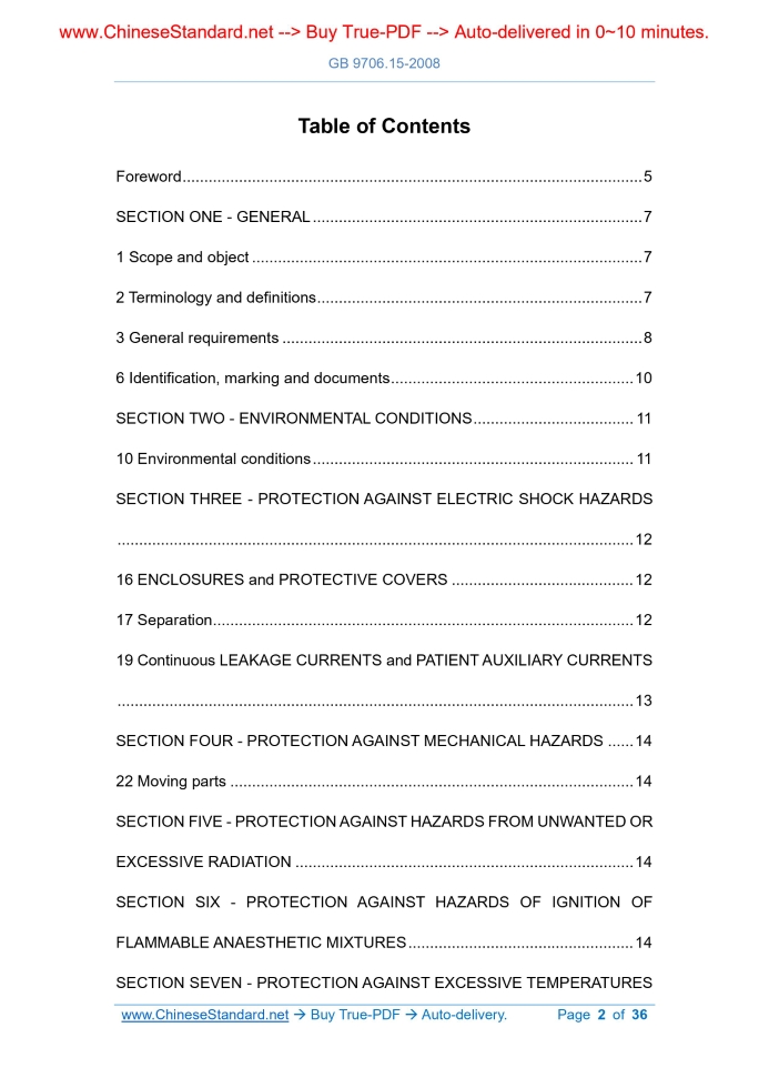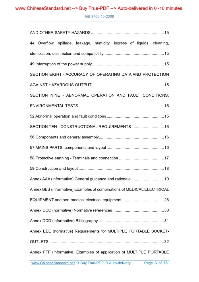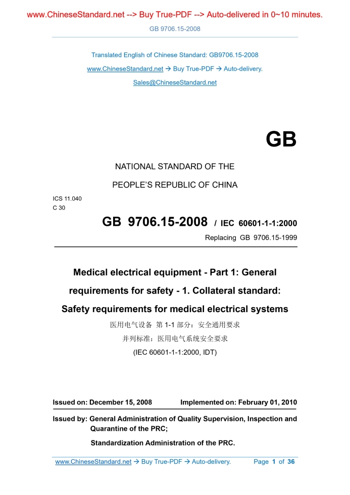 Similar standardsGB 9706.15-2008: Medical electrical equipment -- Part 1: General requirements for safety. 1 -- Collateral standard: Safety requirements for medical electrical systems---This is an excerpt. Full copy of true-PDF in English version (including equations, symbols, images, flow-chart, tables, and figures etc.), auto-downloaded/delivered in 9 seconds, can be purchased online: https://www.ChineseStandard.net/PDF.aspx/GB9706.15-2008 GB NATIONAL STANDARD OF THE PEOPLE’S REPUBLIC OF CHINA ICS 11.040 C 30 GB 9706.15-2008 / IEC 60601-1-1.2000 Replacing GB 9706.15-1999 Medical electrical equipment - Part 1.General requirements for safety - 1.Collateral standard. Safety requirements for medical electrical systems (IEC 60601-1-1.2000, IDT) Issued on. DECEMBER 15, 2008 Implemented on. FEBRUARY 01, 2010 Issued by. General Administration of Quality Supervision, Inspection and Quarantine of the PRC; Standardization Administration of the PRC. Table of ContentsForeword... 5 SECTION ONE - GENERAL... 7 1 Scope and object... 7 2 Terminology and definitions... 7 3 General requirements... 8 6 Identification, marking and documents... 10 SECTION TWO - ENVIRONMENTAL CONDITIONS... 11 10 Environmental conditions... 11 SECTION THREE - PROTECTION AGAINST ELECTRIC SHOCK HAZARDS ... 12 16 ENCLOSURES and PROTECTIVE COVERS... 12 17 Separation... 12 19 Continuous LEAKAGE CURRENTS and PATIENT AUXILIARY CURRENTS ... 13 SECTION FOUR - PROTECTION AGAINST MECHANICAL HAZARDS... 14 22 Moving parts... 14 SECTION FIVE - PROTECTION AGAINST HAZARDS FROM UNWANTED OR EXCESSIVE RADIATION... 14 SECTION SIX - PROTECTION AGAINST HAZARDS OF IGNITION OF FLAMMABLE ANAESTHETIC MIXTURES... 14 SECTION SEVEN - PROTECTION AGAINST EXCESSIVE TEMPERATURES AND OTHER SAFETY HAZARDS... 15 44 Overflow, spillage, leakage, humidity, ingress of liquids, cleaning, sterilization, disinfection and compatibility... 15 49 Interruption of the power supply... 15 SECTION EIGHT - ACCURACY OF OPERATING DATA AND PROTECTION AGAINST HAZARDOUS OUTPUT... 15 SECTION NINE - ABNORMAL OPERATION AND FAULT CONDITIONS; ENVIRONMENTAL TESTS... 15 52 Abnormal operation and fault conditions... 15 SECTION TEN - CONSTRUCTIONAL REQUIREMENTS... 16 56 Components and general assembly... 16 57 MAINS PARTS, components and layout... 16 58 Protective earthing - Terminals and connection... 17 59 Construction and layout... 18 Annex AAA (informative) General guidance and rationale... 19 Annex BBB (informative) Examples of combinations of MEDICAL ELECTRICAL EQUIPMENT and non-medical electrical equipment... 26 Annex CCC (normative) Normative references... 30 Annex DDD (informative) Bibliography... 31 Annex EEE (normative) Requirements for MULTIPLE PORTABLE SOCKET- OUTLETS... 32 Annex FFF (informative) Examples of application of MULTIPLE PORTABLE SOCKET-OUTLETS... 35 Figure 201 -- Example of PATIENT ENVIRONMENT... 18ForewordThe full technical content of this Part of GB 9706 is mandatory. “Medical electrical equipment” safety series standard consists of two parts. - Part 1.General requirements for safety; - Part 2.Particular requirements for safety. Part 1 includes, in addition to this Part, other standards. - GB 9706.1 Medical electrical equipment - Part 1.General requirements for safety; - YY 0505 Medical electrical equipment - Part 1-2.General requirements for safety - Collateral standard. Electromagnetic compatibility - Requirements and tests; - GB 9706.12 Medical electrical equipment - Part 1.General requirements for safety - 3.Collateral standard. General requirements for radiation protection in diagnostic X-ray equipment; This Part is Part 15. This Part equivalently adopts IEC 60601-1-1.2000 “Medical electrical equipment - Part 1-1.General requirements for safety - Collateral standard. Safety requirements for medical electrical systems”. The main difference between this Part and IEC 60601-1-1 is that if the international standards referenced in the standard have been converted into Chinese standards, then this Part replaces the referenced international standard number with the corresponding Chinese standard number. This Part replaces GB 9706.15-1999 “Medical electrical equipment - Part 1. General requirements for safety - 1.Collateral standard. Safety requirements for medical electrical systems”. As compared with GB 9706.15-1999, the main changes in this Part are as follows. - The terms and definitions have been adjusted accordingly; - ADD some requirements for accompanying documents of a system (6.8.201); - The contents of continuous LEAKAGE CURRENTS and PATIENT AUXILIARY CURRENTS (Clause 19) have been adjusted accordingly; - ADD some requirements for connections (56.3.201); - Delete some requirements for protection of wiring (59.201); - The contents of Annex BBB have been adjusted. Annexes CCC and EEE of this Part are normative annexes. Annexes AAA, BBB, DDD, and FFF are informative annexes. This Part was proposed by China Food and Drug Administration. This Part shall be under the jurisdiction of National Technical Committee 10 on Medical Electrical Equipment of Standardization Administration of China (SAC/TC 10). This Part was drafted by Shanghai Testing and Inspection Institute for Medical Devices. Main drafters of this Part. He Jun, Huang Jiahua, Lu E. The previous edition replaced by this Part is as follows. - GB 9706.15-1999. Medical electrical equipment Part 1.General requirements for safety - 1.Collateral standard. Safety requirements for medical electrical systems SECTION ONE - GENERAL1 Scope and objectThis Part applies to the safety of MEDICAL ELECTRICAL SYSTEMS, as defined in 2.201.It describes the safety requirements necessary to provide protection for the PATIENT, the OPERATOR and surroundings.2 Terminology and definitionsIn this Collateral Standard, terms printed in small capitals are used in accordance with their definitions in GB 9706.1. Connection, electrical or otherwise, including those intended to transfer signals and/or power and/or substance