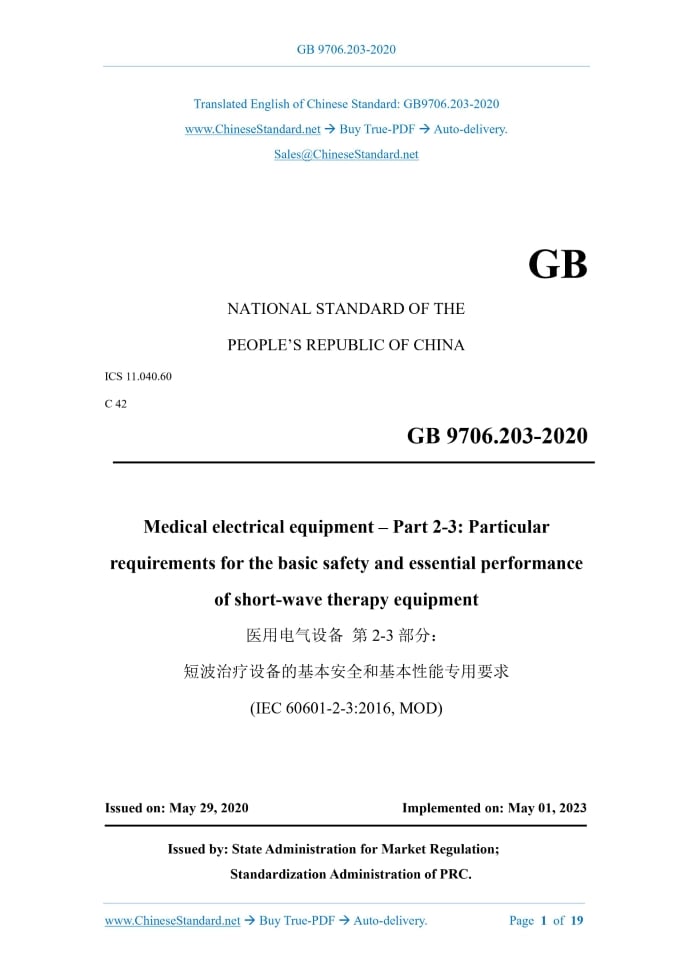 GB 9706.203-2020: Medical electrical equipment - Part 2-3: - Particular requirements for the basic safety and essential performance of short-wave therapy equipment Delivery: 9 seconds. True-PDF full-copy in English & invoice will be downloaded + auto-delivered via email. See step-by-step procedure Status: Valid