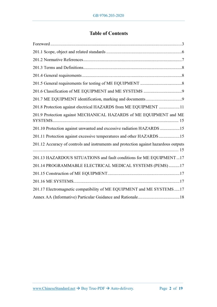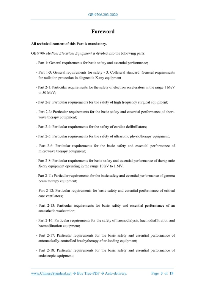 Similar standardsGB 9706.203-2020: Medical electrical equipment - Part 2-3: - Particular requirements for the basic safety and essential performance of short-wave therapy equipment---This is an excerpt. Full copy of true-PDF in English version (including equations, symbols, images, flow-chart, tables, and figures etc.), auto-downloaded/delivered in 9 seconds, can be purchased online: https://www.ChineseStandard.net/PDF.aspx/GB9706.203-2020 NATIONAL STANDARD OF THE PEOPLE’S REPUBLIC OF CHINA ICS 11.040.60 C 42 Medical electrical equipment – Part 2-3.Particular requirements for the basic safety and essential performance of short-wave therapy equipment (IEC 60601-2-3.2016, MOD) Issued on: MAY 29, 2020 Implemented on: MAY 01, 2023 Issued by. State Administration for Market Regulation; Standardization Administration of PRC. Table of ContentsForeword... 3 201.1 Scope, object and related standards... 6 201.2 Normative References... 7 201.3 Terms and Definitions... 8 201.4 General requirements... 8 201.5 General requirements for testing of ME EQUIPMENT... 8 201.6 Classification of ME EQUIPMENT and ME SYSTEMS... 9 201.7 ME EQUIPMENT identification, marking and documents... 9 201.8 Protection against electrical HAZARDS from ME EQUIPMENT... 11 201.9 Protection against MECHANICAL HAZARDS of ME EQUIPMENT and ME SYSTEMS... 15 201.10 Protection against unwanted and excessive radiation HAZARDS... 15 201.11 Protection against excessive temperatures and other HAZARDS... 15 201.12 Accuracy of controls and instruments and protection against hazardous outputs ... 15 201.13 HAZARDOUS SITUATIONS and fault conditions for ME EQUIPMENT... 17 201.14 PROGRAMMABLE ELECTRICAL MEDICAL SYSTEMS (PEMS)... 17 201.15 Construction of ME EQUIPMENT... 17 201.16 ME SYSTEMS... 17 201.17 Electromagnetic compatibility of ME EQUIPMENT and ME SYSTEMS... 17 Annex AA (Informative) Particular Guidance and Rationale... 18ForewordAll technical content of this Part is mandatory. GB 9706 Medical Electrical Equipment is divided into the following parts. - Part 1.General requirements for basic safety and essential performance; - Part 1-3.General requirements for safety - 3.Collateral standard. General requirements for radiation protection in diagnostic X-ray equipment - Part 2-1.Particular requirements for the safety of electron accelerators in the range 1 MeV to 50 MeV; - Part 2-2.Particular requirements for the safety of high frequency surgical equipment; - Part 2-3.Particular requirements for the basic safety and essential performance of short- wave therapy equipment; - Part 2-4.Particular requirements for the safety of cardiac defibrillators; - Part 2-5.Particular requirements for the safety of ultrasonic physiotherapy equipment; - Part 2-6.Particular requirements for the basic safety and essential performance of microwave therapy equipment; - Part 2-8.Particular requirements for basic safety and essential performance of therapeutic X-ray equipment operating in the range 10 kV to 1 MV; - Part 2-11.Particular requirements for the basic safety and essential performance of gamma beam therapy equipment; - Part 2-12.Particular requirements for basic safety and essential performance of critical care ventilators; - Part 2-13.Particular requirements for basic safety and essential performance of an anaesthetic workstation; - Part 2-16.Particular requirements for the safety of haemodialysis, haemodiafiltration and haemofiltration equipment; - Part 2-17.Particular requirements for the basic safety and essential performance of automatically-controlled brachytherapy after-loading equipment; - Part 2-18.Particular requirements for the basic safety and essential performance of endoscopic equipment; - Part 2-19.Particular requirements for the basic safety and essential performance of infant incubators; - Part 2-22.Particular requirements for basic safety and essential performance of surgical, cosmetic, therapeutic and diagnostic laser equipment; - Part 2-24.Particular requirements for the safety of infusion pumps and controllers; - Part 2-25.Particular requirements for the basic safety and essential performance of electrocardiographs; - Part 2-26.Particular requirements for the basic safety and essential performance of electroencephalograph; - Part 2-27.Particular requirements for the basic safety and essential performance of electrocardiographic monitoring equipment; - Part 2-28.Particular requirements for the basic safety and essential performance of X-ray tube assemblies for medical diagnosis; - Part 2-29.Particular requirements for the basic safety and essential performance of radiotherapy simulators; - Part 2-36.Particular requirements for the basic safety and essential performance of equipment for extracorporeally induced lithotripsy; - Part 2-37.Particular requirements for the basic safety and essential performance of ultrasonic medical diagnostic and monitoring equipment; - Part 2-39.Particular requirements for the safety of peritoneal dialysis equipment; - Part 2-43.Particular requirements for the safety of X-ray equipment for interventional procedures; - Part 2-44.Particular requirements for the basic safety and essential performance of X-ray equipment for computed tomography; - Part 2-45.Particular requirements for the safety of mammographic X-ray equipment and mammographic stereotactic devices; - Part 2-54.Particular requirements for the basic safety and essential performance of X-ray equipment for radiography and radioscopy; - Part 2-60.Particular requirements for the basic safety and essential performance of dental equipment; - Part 2-63.Particular requirements for the basic safety and essential performance of dental extra-oral X-ray equipment; Medical electrical equipment – Part 2-3.Particular requirements for the basic safety and essential performance of short-wave therapy equipment 201.1 Scope, object and related standards Clause 1 of the GB 9706.1-2020 applies, except as follows. 201.1.1 Scope Replacement. This Part of GB 9706 s