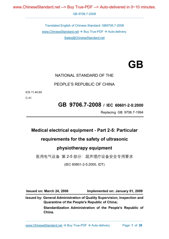 GB 9706.7-2008: Medical electrical equipment -- Part 2-5: Particular requirements for the safety of ultrasonic physiotherapy equipment Delivery: 9 seconds. True-PDF full-copy in English & invoice will be downloaded + auto-delivered via email. See step-by-step procedure Status: Obsolete GB 9706.7: Historical versions