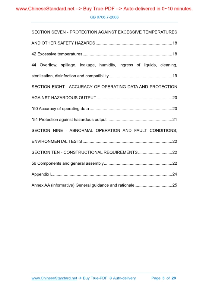 Similar standardsGB 9706.7-2008: Medical electrical equipment -- Part 2-5: Particular requirements for the safety of ultrasonic physiotherapy equipment---This is an excerpt. Full copy of true-PDF in English version (including equations, symbols, images, flow-chart, tables, and figures etc.), auto-downloaded/delivered in 9 seconds, can be purchased online: https://www.ChineseStandard.net/PDF.aspx/GB9706.7-2008 Medical electrical equipment.Part 2-5.Particular requirements for the safety of ultrasonic physiotherapy equipment ICS 11.40.60 C41 National Standards of People's Republic of China GB 9706.7-2008/IEC 60601-2-5.2000 Replacing GB 9706.7-1994 Medical electrical equipment - Part 2-5. Requirements for the safety of ultrasonic physiotherapy equipment (IEC 60601-2-5.2000, IDT) Published 2008-03-24 2009-01-01 implementation Administration of Quality Supervision, Inspection and Quarantine of People's Republic of China Standardization Administration of China issued ForewordAll technical contents of this standard is mandatory. This is equivalent to using the standard IEC 60601-2-5.2000 (English). This standard replaces GB 9706.7-1994 "Medical electrical equipment requirements for the safety of ultrasonic therapy equipment." This major change compared to the standard GB 9706.7-1994 follows. --- Standard IEC 60601-2-5 and name.2000 exactly the same; --- In the "scope and object 1" in the refinement as a "scope 1.1", "1.2 Purpose", increasing the "specific standard 1.3", "1.4 and Standard columns "," Normative References 1.5 "; --- "2 Terms and Definitions" terminology has been added; --- In the "external device or marking 6.1 Part" for the generator, increasing the treatment head marking requirements; --- In the "6.8.2 User Guide" increased use caution statements, and other information required treatment head; --- In the "acoustic energy 35 'in FIG deleted Test Method 101, the hydrophone is coupled to the side wall via a coupling agent to the treatment head; --- in "Electromagnetic Compatibility 36", increasing the predetermined value of immunity tests 3V/m of; --- In "42.3" in FIG 102 to 101, deleting the original "added 42.4", the temperature of the test generator 9 to 42.3), Added "unless it can be proven to be a particular treatment head test results obtained under the most adverse conditions, otherwise respond manufacturing Provided by each treatment head test "requirement; --- In "44.6 into the liquid" in the treatment of head and provides equipment shall meet the requirements of IPX7; --- In the "accuracy of the 50 working data", the "indicate any deviation from the actual power value should be within ± 30% of the actual value" Modify the range of ± 20%; --- the "50.101 output control means" in the output power to 20% of the rated output power to 5% or less; --- In the "51.103 Timer", the accuracy requirements are revised by a predetermined time range; --- In the "homogeneous radiation field of 51.104", the "sound intensity ratio of not more than 2" to "any treatment head manufacturer or additional Beam head unevenness factor should not exceed 8.0 "; --- increasing the informative Appendix AA, for the appropriate requirements of the more important given the principle of explanation. There are chapters explain the principles of Article marked with an asterisk before their terms of numbers. The term standard GB 9706.1 chapter 2 and defined, they appear in bold represents the standard texts. Annex AA of this standard is an informative annex. This standard was proposed by the State Food and Drug Administration. This standard by the National Standardization Technical Committee of medical ultrasound equipment. Drafted. medical ultrasound equipment Wuhan National Quality Supervision and Inspection Center. The main drafters. Ashmore busy, Wang Zhijian. This standard supersedes the previous editions are. --- GB 6386-1986; --- GB 9706.7-1994. GB 9706.7-2008/IEC 60601-2-5.2000introductionThis standard specifies the special safety requirements and test methods ultrasound therapy apparatus, is GB 9706.1-2007 (based on IEC 60601- Amendments and additions 1988 + Am1 + Am2, hereinafter referred to as Common Criteria) content. 1.This takes into account the specific standard and YY0505-2005 IEC 61689.1996 content. The first edition of this specific standard equivalent to using IEC 60601-2-5.1984 (based on IEC 60601-1.1977 and reference IEC 60150). The purpose is to make the second edition of this specific standard updated to keep pace with the above referenced publications and documents. Change the subject In order to better reflect the scope of application development based on ultrasound treatments, and consistent with the change above IEC standard. Taking into account the understanding of the requirements of the more important reasons not only help correct application of the specific standard, and with the change in clinical practice Development and technology change, timely revised standard is necessary, given in Annex AA principles appropriate description of these requirements. but This appendix is not a part of this standard. GB 9706.7-2008/IEC 60601-2-5.2000 Medical electrical equipment - Part 2-5. Requirements for the safety of ultrasonic physiotherapy equipment The first chapter outlines In addition to the following, chapter and section of the General Standard Benpian apply. Scope 1 and object 1.1 Scope increase. This standard specifies the safety dedicated 2.1.101 defined physiotherapy equipment using ultrasound transducer unit in medical practice Claim. This does not apply to specific standard. --- equipment consists of an ultrasonically driven tool is used (for example, surgical and dental equipment); --- pulverized using a focused ultrasound pulse GB aggregates such as kidney or bladder stones apparatus (lithotripter) (see 9706.22- 2003); --- focused ultrasound using an ultrasonic physiotherapy equipment. 1.2 Purpose Alternative. The purpose of this standard is to establish special requiremen