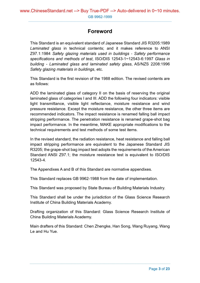 Similar standardsGB 9962-1999: Laminated glass---This is an excerpt. Full copy of true-PDF in English version (including equations, symbols, images, flow-chart, tables, and figures etc.), auto-downloaded/delivered in 9 seconds, can be purchased online: https://www.ChineseStandard.net/PDF.aspx/GB9962-1999GB NATIONAL STANDARD OF THE PEOPLE’S REPUBLIC OF CHINA ICS 81.040.20 Q 34 Laminated glass 夹层玻璃 Replaced (by GB 15763.3-2009) Issued on: SEPTEMBER 1, 1999 Implemented on: AUGUST 1, 2000 Issued by. State Bureau of Quality and Technical Supervision Table of ContentsForeword ... 3 1 Scope ... 4 2 Normative references ... 4 3 Definitions ... 5 4 Classification ... 5 5 Requirements ... 6 6 Test methods ... 12 7 Inspection rules ... 16 8 Packaging, symbols, transportation and storage ... 18 Appendix A (Normative) Falling ball impact sample holder ... 19 Appendix B (Normative) Grape-shot bag impact test devices ... 20ForewordThis Standard is an equivalent standard of Japanese Standard JIS R3205.1989 Laminated glass in technical contents; and it makes reference to ANSI Z97.1.1984 Safety glazing materials used in buildings - Safety performance specifications and methods of test, ISO/DIS 12543-1~12543-6.1997 Glass in building - Laminated glass and laminated safety glass, AS/NZS 2208.1996 Safety glazing materials in buildings, etc. This Standard is the first revision of the 1988 edition. The revised contents are as follows. ADD the laminated glass of category II on the basis of reserving the original laminated glass of categories I and III. ADD the following four indicators. visible light transmittance, visible light reflectance, moisture resistance and wind pressure resistance. Except the moisture resistance, the other three items are recommended indicators. The impact resistance is renamed falling ball impact stripping performance. The penetration resistance is renamed grape-shot bag impact performance. In the meantime, MAKE appropriate modifications to the technical requirements and test methods of some test items. In the revised standard, the radiation resistance, heat resistance and falling ball impact stripping performance are equivalent to the Japanese Standard JIS R3205; the grape-shot bag impact test adopts the requirements of the American Standard ANSI Z97.1; the moisture resistance test is equivalent to ISO/DIS 12543-4. The Appendixes A and B of this Standard are normative appendixes. This Standard replaces GB 9962-1988 from the date of implementation. This Standard was proposed by State Bureau of Building Materials Industry. This Standard shall be under the jurisdiction of the Glass Science Research Institute of China Building Materials Academy. Drafting organization of this Standard. Glass Science Research Institute of China Building Materials Academy. Main drafters of this Standard. Chen Zhengke, Han Song, Wang Ruyang, Wang Le and Hu Yue. Laminated glass1 ScopeThis Standard specifies the classification, requirements and test methods for laminated glass. This Standard is applicable to the laminated glass used in buildings. Other occasions can also use this Standard as reference. This Standard is not applicable to the laminated glass used in automobiles and other road vehicles.2 Normative referencesThe provisions in the following standards become the provisions of this Standard through reference in this Standard. At time of publication, the editions indicated were valid. All standards are subject to revision, and parties who reach an agreement based on this Standard are encouraged to investigate the possibility of applying the latest editions of the standards indicated below. GB/T 308-1989 Rolling bearings - Steel balls (neq ISO 3290.1975) GB/T 531-1992 Rubber, vulcanized - Determination of shore A hardness (neq ISO 7619.1986) GB/T 1216-1985 External micrometer (neq ISO 3611.1978) GB/T 5137.2-1996 Road vehicles - Safety glasses - Test methods for optical properties (eqv ISO/DIS 3538.1992) GB/T 5137.3-1996 Road vehicles - Safety glazing materials - Test methods for resistance to radiation, high temperature, humidity, fire and simulated weathering (eqv ISO 3917.1992) GB/T 9963-1998 Tempered glass (eqv JIS R 3206.1989) GB 11614-1999 Float glass GB 17841-1999 Tempered and heat-strengthened glass used in curtain walls (neq JIS R 3222.1996) JC 433-1991(1996) Wired glass JC/T 511-1993 Patterned glass JC/T 512-1993 Packaging of automobile safety glass JC 536-1994 Heat absorbing glass JC/T 677-1997 Test method to model wind pressure for architectural glass under the uniform static loads3 DefinitionsThis Standard uses the following definitions. 3.1 Laminated glass It refers to the glass products produced by putting the interlayer in between one layer of glass and one or more layers of glass or plastic materials. 3.2 Interlayer It refers to the materials playing the roles of bonding and isolation between glass or between glass and plastic materials, so as to ensure that the laminated glass has resistance to impact, solar control and sound insulation. 3.3 Laminated glass of category I It refers to the laminated glass making no requirements for the grape-shot bag impact test. 3.4 Laminated glass of category II-1 It refers to the laminated glass with the grape-shot bag impact height of 1,200mm and conforming to the provisions of Section 5.11. 3.5 Laminated glass of category II-2 It refers to the laminated glass with the grape-shot bag impact height of 750mm and conforming to the provisions of Section 5.11. 3.6 Laminated glass of category III It refers to the laminated glass with the total thickness of not greater than 16mm and conforming to the provisions of Section 5.11.4 Classification4.1 CLASSIFY in accordance with shapes. For the multilayer products, the products with the total raw glass thicknesses of greater than 24mm, and the products using tempered glass as raw glass, the thickness tolerances shall be agreed by the supply and requisitioning parties. 5.3.3.1 Thickness deviation of dry 