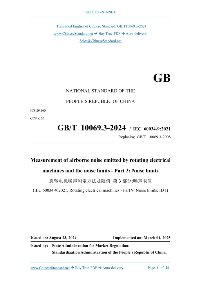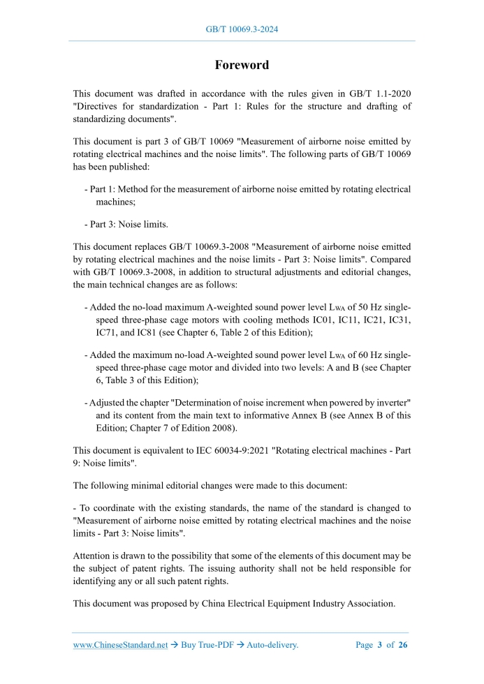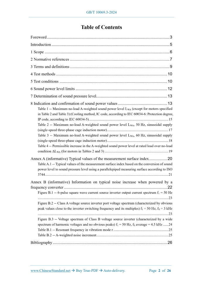 Similar standardsGB/T 10069.3-2024: Measurement of airborne noise emitted by rotating electrical machines and the noise limits - Part 3: Noise limits---This is an excerpt. Full copy of true-PDF in English version (including equations, symbols, images, flow-chart, tables, and figures etc.), auto-downloaded/delivered in 9 seconds, can be purchased online: https://www.ChineseStandard.net/PDF.aspx/GBT10069.3-2024 GB NATIONAL STANDARD OF THE PEOPLE’S REPUBLIC OF CHINA ICS 29.160 CCS K 20 GB/T 10069.3-2024 / IEC 60034-9.2021 Replacing GB/T 10069.3-2008 Measurement of airborne noise emitted by rotating electrical machines and the noise limits - Part 3.Noise limits (IEC 60034-9.2021, Rotating electrical machines - Part 9.Noise limits, IDT) Issued on. AUGUST 23, 2024 Implemented on. MARCH 01, 2025 Issued by. State Administration for Market Regulation; Standardization Administration of the People's Republic of China. Table of ContentsForeword... 3 Introduction... 5 1 Scope... 6 2 Normative references... 7 3 Terms and definitions... 9 4 Test methods... 10 5 Test conditions... 10 6 Sound power level limits... 12 7 Determination of sound pressure level... 13 8 Indication and confirmation of sound power values... 13 Table 1 -- Maximum no-load A-weighted sound power level LWA (except for motors specified in Table 2 and Table 3) (Cooling method, IC code, according to IEC 60034-6.Protection degree, IP code, according to IEC 60034-5)... 15 Table 2 -- Maximum no-load A-weighted sound power level LWA, 50 Hz, sinusoidal supply (single-speed three-phase cage induction motor)... 17 Table 3 -- Maximum no-load A-weighted sound power level LWA, 60 Hz, sinusoidal supply (single-speed three-phase cage induction motor)... 18 Table 4 -- Permissible increase in the A-weighted sound power level at rated load over no-load condition ΔLWA (for motors in Tables 2 and 3)... 19 Annex A (informative) Typical values of the measurement surface index... 20 Table A.1 -- Typical values of the measurement surface index based on the conversion of sound power level to sound pressure level using a parallelepiped measuring surface according to ISO 3744... 21 Annex B (informative) Information on typical noise increase when powered by a frequency converter... 22 Figure B.1 -- 6-pulse square wave current source inverter output current spectrum f1 = 50 Hz ... 23 Figure B.2 -- Class A voltage source inverter port voltage spectrum (characterized by obvious peak values close to the inverter switching frequency and its multiples) f1 = 50 Hz, fS = 3 kHz ... 23 Figure B.3 -- Voltage spectrum of Class B voltage source inverter (characterized by a wide spectrum of harmonic voltages and no obvious peaks) f1 = 50 Hz, fS average = 4.5 kHz... 24 Table B.1 -- Resonant frequency in vibration mode r... 25 Table B.2 -- A-weighted noise increment... 25 Bibliography... 26ForewordThis document was drafted in accordance with the rules given in GB/T 1.1-2020 "Directives for standardization - Part 1.Rules for the structure and drafting of standardizing documents". This document is part 3 of GB/T 10069 "Measurement of airborne noise emitted by rotating electrical machines and the noise limits". The following parts of GB/T 10069 has been published. - Part 1.Method for the measurement of airborne noise emitted by rotating electrical machines; - Part 3.Noise limits. This document replaces GB/T 10069.3-2008 "Measurement of airborne noise emitted by rotating electrical machines and the noise limits - Part 3.Noise limits". Compared with GB/T 10069.3-2008, in addition to structural adjustments and editorial changes, the main technical changes are as follows. - Added the no-load maximum A-weighted sound power level LWA of 50 Hz single- speed three-phase cage motors with cooling methods IC01, IC11, IC21, IC31, IC71, and IC81 (see Chapter 6, Table 2 of this Edition); - Added the maximum no-load A-weighted sound power level LWA of 60 Hz single- speed three-phase cage motor and divided into two levels. A and B (see Chapter 6, Table 3 of this Edition); - Adjusted the chapter "Determination of noise increment when powered by inverter" and its content from the main text to informative Annex B (see Annex B of this Edition; Chapter 7 of Edition 2008). This document is equivalent to IEC 60034-9.2021 "Rotating electrical machines - Part 9.Noise limits". The following minimal editorial changes were made to this document. - To coordinate with the existing standards, the name of the standard is changed to "Measurement of airborne noise emitted by rotating electrical machines and the noise limits - Part 3.Noise limits". Attention is drawn to the possibility that some of the elements of this document may be the subject of patent rights. The issuing authority shall not be held responsible for identifying any or all such patent rights. This document was proposed by China Electrical Equipment Industry Association. This document shall be under the jurisdiction of National Technical Committee on Rotating Electrical Machines of Standardization Administration of China (SAC/TC 26). The drafting organizations of this document. Shanghai Motor System Energy Saving Engineering Technology Research Center Co., Ltd., Jiangsu Dazhong Motor Co., Ltd., Jiamusi Motor Co., Ltd., Shenzhen Fengfa Technology Development Co., Ltd., Taizhou Jinyu Electromechanical Co., Ltd., Zhejiang Jiangchao Motor Industry Co., Ltd., Hebei Motor Co., Ltd., Shanghai Electric Group Shanghai Motor Factory Co., Ltd., Ruichang Sen Ao Da Technology Co., Ltd., Nanfang Pump Industry Co., Ltd., Wuxi Dongyuan Motor Co., Ltd., Nanyang Explosion-proof (Suzhou) Special Equipment Co., Ltd., Shanxi Motor Manufacturing Co., Ltd., Xi'an Xima Motor Co., Ltd., Zhejiang Jufeng Technology Co., Ltd., Shaoxing Shangyu Wuzhou Motor Manufacturing Co., Ltd., Wolong Electric Huaian Qingjiang Motor Co., Ltd., Wuxi Zhongdian Motor Technology Co., Ltd., Zhejiang Jinlong Motor Co., Ltd., CRRC Zhuzhou Motor Co., Ltd., Harbin Electric Power Equipment Co.