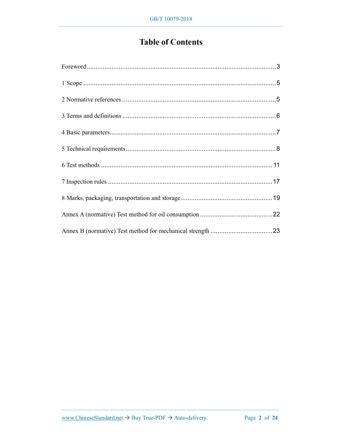 Similar standardsGB/T 10079-2018: Single-stage reciprocating refrigerant compressor (unit)---This is an excerpt. Full copy of true-PDF in English version (including equations, symbols, images, flow-chart, tables, and figures etc.), auto-downloaded/delivered in 9 seconds, can be purchased online: https://www.ChineseStandard.net/PDF.aspx/GBT10079-2018GB NATIONAL STANDARD OF THE PEOPLE’S REPUBLIC OF CHINA ICS 27.200 J 73 Replacing GB/T 10079-2001 Single-stage reciprocating refrigerant compressor (unit) ISSUED ON: DECEMBER 28, 2018 IMPLEMENTED ON: JULY 01, 2019 Issued by: State Administration for Market Regulation; Standardization Administration of the People's Republic of China. Table of ContentsForeword ... 3 1 Scope ... 5 2 Normative references ... 5 3 Terms and definitions ... 6 4 Basic parameters ... 7 5 Technical requirements ... 8 6 Test methods ... 11 7 Inspection rules ... 17 8 Marks, packaging, transportation and storage ... 19 Annex A (normative) Test method for oil consumption ... 22 Annex B (normative) Test method for mechanical strength ... 23 Single-stage reciprocating refrigerant compressor (unit)1 ScopeThis Standard specifies the terms and definitions, basic parameters, technical requirements, test methods, inspection rules and marks, packaging, transportation and storage FOR single-stage reciprocating refrigerant compressor (hereinafter referred to as "compressor") AND single-stage reciprocating refrigerant compressor unit (hereinafter referred to as "compressor unit"). This Standard applies to single-stage reciprocating refrigerant compressor and single- stage reciprocating refrigerant compressor unit. This Standard does not apply to the compressor (unit) that uses R744 as refrigerant and the compressor (unit) in the following products: - household refrigerators and household freezers; - refrigeration and air-conditioning equipment for transportation and special purpose.2 Normative referencesThe following referenced documents are indispensable for the application of this document. For dated references, only the edition cited applies. For undated references, the latest edition of the referenced document (including any amendments) applies. GB/T 191, Packaging and storage marks GB 4706.17, Safety of household and similar electrical appliances - Particular requirements for motor-compressors GB 4706.32-2012, Household and similar electrical appliances - Safety - Particular requirements for heat pumps, air-conditioners and dehumidifiers GB/T 5773, The method of performance test for positive displacement refrigerant compressors GB/T 6388, Transport package shipping mark GB/T 9237, Refrigerating systems and heat pumps - Safety and environmental requirements GB/T 13306, Plates GB/T 19410-2008, Screw refrigerant compressors GB/T 34619, Test method for volume flow of positive displacement refrigerant compressors JB/T 4330-1999, Determination of noise emitted by refrigerating and air conditioning equipment JB/T 5446-1999, Reciprocating single-machine double-stage refrigerating compressor JB/T 7249, Refrigeration and air-conditioning equipment - Terminology JB/T 9058, Measuring method of refrigerating equipment cleanliness JB/T 10597-2006, Three phase asynchronous motors for hermetic refrigeration compressors - General specifications3 Terms and definitionsFor the purposes of this document, the terms and definitions defined in GB/T 5773 and JB/T 7249 as well as the followings apply. 3.1 open-type single-stage reciprocating refrigerant compressor A single-stage refrigerant compressor that relies on a prime mover to drive a shaft protruding from the housing or other moving parts. NOTE: Hereinafter referred to as "open-type compressor". 3.2 semi-hermetic single-stage reciprocating refrigerant compressor A single-stage reciprocating refrigerant compressor in which the compressor and motor are housed in a field disassembled housing. NOTE: Hereinafter referred to as "semi-hermetic compressor". 3.3 hermetic single-stage reciprocating refrigerant compressor A single-stage reciprocating refrigerant compressor in which the compressor and motor are housed in a welded or brazed housing. NOTE: Hereinafter referred to as "hermetic compressor". 3.4 single-stage reciprocating refrigerant compressor unit A unit that is assembled by a single-stage reciprocating refrigerant compressor, and/or prime mover and other accessories (such as an oil pump, oil cooler, oil separator, etc.)5 Technical requirements5.1 General requirements 5.1.1 The compressor (unit) shall be manufactured in accordance with the provisions of this Standard as well as the drawings and technical documents approved by the prescribed procedures (or the agreement between the user and the manufacturer). 5.1.2 For the compressor (unit) with safety valve, the valve action shall be sensitive, air-tight, safe and reliable. 5.1.3 The compressor (unit) lubrication system shall meet the following requirements: - When the ambient temperature is as high as 43°C or the cooling water temperature is 33°C, the temperature of the refrigerating machine oil in the crankcase of the semi-hermetic compressor (unit) shall not be higher than 80°C. For the open-type compressor (unit), it shall not be higher than 70°C. - For compressors (units) using a pressure lubrication system, the difference between the oil pressure of the lubrication system and the pressure of the refrigerant in the compressor crankcase shall ensure that the compressor (unit) works normally and reliably when the oil circuit is not blocked. Compressors (units) using splash lubrication shall ensure that the lubrication system can work reliably when the motor is running forward or reverse (when reverse rotation is allowed). - The oil leakage at the shaft seal of the open-type compressor (unit) shall not exceed 0.5 mL/h. 5.1.4 The outer surface of the compressor (unit) shall be clean. The paint layer shall adhere firmly. There shall be no defects affecting the appearance quality. 5.2 Safety