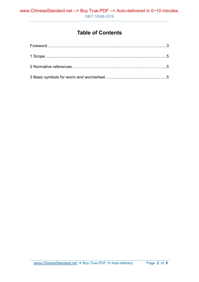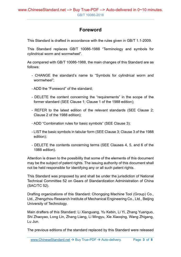 Similar standardsGB/T 10086-2018: Symbols for cylindrical worm and worm wheel---This is an excerpt. Full copy of true-PDF in English version (including equations, symbols, images, flow-chart, tables, and figures etc.), auto-downloaded/delivered in 9 seconds, can be purchased online: https://www.ChineseStandard.net/PDF.aspx/GBT10086-2018GB NATIONAL STANDARD OF THE PEOPLE’S REPUBLIC OF CHINA ICS 21.200 J 17 Replacing GB/T 10086-1988 Symbols for cylindrical worm and wormwheel Issued on: MAY 14, 2018 Implemented on: DECEMBER 1, 2018 Issued by. State Administration for Market Regulation; Standardization Administration of the PRC. Table of ContentsForeword ... 3 1 Scope ... 5 2 Normative references ... 5 3 Basic symbols for worm and wormwheel ... 5ForewordThis Standard is drafted in accordance with the rules given in GB/T 1.1-2009. This Standard replaces GB/T 10086-1988 “Terminology and symbols for cylindrical worm and wormwheel”. As compared with GB/T 10086-1988, the main changes of this Standard are as follows. - CHANGE the standard’s name to “Symbols for cylindrical worm and wormwheel”; - ADD the “Foreword” of the standard; - DELETE the content concerning the “requirements” in the scope of the former standard (SEE Clause 1; Clause 1 of the 1988 edition); - REFER to the latest edition of the relevant standards (SEE Clause 2; Clause 2 of the 1988 edition); - ADD “Combination rules for basic symbols” (SEE Clause 3); - LIST the basic symbols in tabular form (SEE Clause 3; Clause 3 of the 1988 edition); - DELETE the contents concerning terms (SEE Clauses 4, 5, and 6 of the 1988 edition). Attention is drawn to the possibility that some of the elements of this document may be the subject of patent rights. The issuing authority of this document shall not be held responsible for identifying any or all such patent rights. This Standard was proposed by and shall be under the jurisdiction of National Technical Committee 52 on Gears of Standardization Administration of China (SAC/TC 52). Drafting organizations of this Standard. Chongqing Machine Tool (Group) Co., Ltd., Zhengzhou Research Institute of Mechanical Engineering Co., Ltd., Beijing University of Technology. Main drafters of this Standard. Li Xianguang, Yu Kebin, Li Yi, Zhang Yuanguo, Shi Zhaoyao, Long Lin, Zhang Liang, Li Mingyu, Xie Xiaoqing, Wang Zhigang, Lu Jun. The previous editions of the standard replaced by this Standard were released Symbols for cylindrical worm and wormwheel1 ScopeThis Standard specifies the symbols for cylindrical worm and wormwheel. This Standard is applicable to the cylindrical worm gearing with a shaft angle ∑=90°, and its worm and wormwheel.2 Normative referencesThe following documents are indispensable for the application of this document. For the dated references, only the versions with the dates indicated are applicable to this document. For the undated references, the latest version (including all the amendments) are applicable to this document. GB/T 2821-2003 Gear - Symbols for geometrical data3 Basic symbols for worm and wormwheel3.1 Combination rules for basic symbols The basic symbols for worm and wormwheel follow the requirements of 2.1 of GB/T 2821-2003. The main rules are as follows. a) The symbol consists of a main symbol or a main symbol plus one or more subscripts or a superscript; b) The main symbol can be a separate uppercase or lowercase letter. The letters shall be italic Roman or Greek letters; c) The subscript shall be a Roman letter or an Arabic numeral or a combination of both; d) All subscripts shall be marked on the same line and lower than the main symbol; e) Symbols with lines drawn (drawn above or below), superscripts other than indices, pre-subscripts, pre-superscripts, secondary subscripts, secondary superscripts, and dashes shall be avoided. 3.2 Main symbols ......Source: Above contents are excerpted from the full-copy PDF -- translated/reviewed by: www.ChineseStandard.net / Wayne Zheng et al. Tips & Frequently Asked Questions:Question 1: How long will the true-PDF of English version of GB/T 10086-2018 be delivered?Answer: The full copy PDF of English version of GB/T 10086-2018 can be downloaded in 9 seconds, and it will also be emailed to you in 9 seconds (double mechanisms to ensure the delivery reliably), with PDF-invoice.Question 2: Can I share the purchased PDF of GB/T 10086-2018_English with my colleagues?Answer: Yes. The purchased PDF of GB/T 10086-2018_English will be deemed to be sold to your employer/organization who actually paid for it, including your colleagues and your employer's intranet.Question 3: Does the price include tax/VAT?Answer: Yes. Our tax invoice, downloaded/delivered in 9 seconds, includes all tax/VAT and complies with 100+ countries' tax regulations (tax exempted in 100+ countries) -- See Avoidance of Double Taxation Agreements (DTAs): List of DTAs signed between Singapore and 100+ countriesQuestion 4: Do you accept my currency other than USD?Answer: Yes. www.ChineseStandard.us -- GB/T 10086-2018 -- Click this link and select your country/currency to pay, the exact amount in your currency will be printed on the invoice. Full PDF will also be downloaded/emailed in 9 seconds.Question 5: Should I purchase the latest version GB/T 10086-2018?Answer: Yes. Unless special scenarios such as technical constraints or academic study, you should always prioritize to purchase the latest version GB/T 10086-2018 even if the enforcement date is in future. Complying with the latest version means that, by default, it also complies with all the earlier versions, technically.How to buy and download a true PDF of English version of GB/T 10086-2018?A step-by-step guide to download PDF of GB/T 10086-2018_EnglishStep 1: Visit website https://www.ChineseStandard.net (Pay in USD), or https://www.ChineseStandard.us (Pay in any currencies such as Euro, KRW, JPY, AUD).Step 2: Search keyword "GB/T 10086-2018". Step 3: Click "Add to Cart". If multiple PDFs are