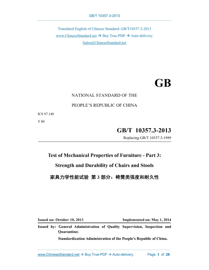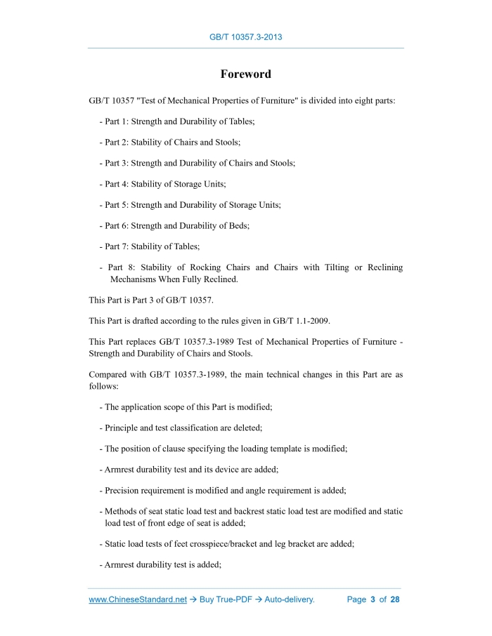 Similar standardsGB/T 10357.3-2013: Test of mechanical properties of furniture -- Part 3: Strength and durability of chairs and stools---This is an excerpt. Full copy of true-PDF in English version (including equations, symbols, images, flow-chart, tables, and figures etc.), auto-downloaded/delivered in 9 seconds, can be purchased online: https://www.ChineseStandard.net/PDF.aspx/GBT10357.3-2013 GB NATIONAL STANDARD OF THE PEOPLE’S REPUBLIC OF CHINA ICS 97.140 Y 80 Replacing GB/T 10357.3-1989 Test of Mechanical Properties of Furniture - Part 3: Strength and Durability of Chairs and Stools ISSUED ON: OCTOBER 10, 2013 IMPLEMENTED ON: MAY 1, 2014 Issued by: General Administration of Quality Supervision, Inspection and Quarantine; Standardization Administration of the People’s Republic of China. Table of ContentsForeword ... 3 1 Scope ... 5 2 General Test Conditions ... 5 3 Test Facilities ... 6 4 Test Items and Procedures ... 13 5 Assessment of Test Results ... 25 Appendix A (Informative) Test Level Selection Table ... 26 Appendix B (Normative) Summary Sheet of Test Items ... 27ForewordGB/T 10357 "Test of Mechanical Properties of Furniture" is divided into eight parts: - Part 1: Strength and Durability of Tables; - Part 2: Stability of Chairs and Stools; - Part 3: Strength and Durability of Chairs and Stools; - Part 4: Stability of Storage Units; - Part 5: Strength and Durability of Storage Units; - Part 6: Strength and Durability of Beds; - Part 7: Stability of Tables; - Part 8: Stability of Rocking Chairs and Chairs with Tilting or Reclining Mechanisms When Fully Reclined. This Part is Part 3 of GB/T 10357. This Part is drafted according to the rules given in GB/T 1.1-2009. This Part replaces GB/T 10357.3-1989 Test of Mechanical Properties of Furniture - Strength and Durability of Chairs and Stools. Compared with GB/T 10357.3-1989, the main technical changes in this Part are as follows: - The application scope of this Part is modified; - Principle and test classification are deleted; - The position of clause specifying the loading template is modified; - Armrest durability test and its device are added; - Precision requirement is modified and angle requirement is added; - Methods of seat static load test and backrest static load test are modified and static load test of front edge of seat is added; - Static load tests of feet crosspiece/bracket and leg bracket are added; - Armrest durability test is added; Test of Mechanical Properties of Furniture - Part 3: Strength and Durability of Chairs and Stools1 ScopeThis Part of GB/T 10357 specifies test methods for determining the strength and durability of various chairs and stools. This Part is applicable to various chairs and stools used in household, hotel and restaurant. This Part is not applicable to revolving chair, Children's chair as well as chairs and stools made of ceramic, vine and osier.2 General Test Conditions2.1 Specimen If the specimen is made by gluing timber or similar materials, after manufacture, it shall be stored continuously in general indoor environment for at least 7d before the test. Specimen shall be finished product. If the specimen is knock-down, the product shall be assembled in accordance with assembly instruction; if the specimen may be assembled or combined according to different modes, during the test, it shall be assembled or combined according to the most adverse combination for the strength test and durability test. Before the test, the connection piece of knock-down product shall be fastened; the assembling components shall be firmly installed and cannot be reinforced additionally without special requirements of manufacturer. 2.2 Loading requirements The forces in strength tests shall be applied sufficiently slowly to ensure that negligible dynamic load is applied. The forces in durability tests shall be applied sufficiently slowly to ensure that kinetic heating does not occur. Unless otherwise specified, the load shall be maintained for (10±2)s in strength test and shall be maintained for (2±1)s in durability test. 2.3 Load The test is divided into five levels according to the normal use frequency and potential misusage degree of product under intended application conditions and based on the magnitude and times of loading; the determination of test level is detailed in Appendix A. 2.4 Test conditions In addition to the specified test equipment, any suitable equipment is applicable to this part. During running, the loading equipment for seat shall neither restrict the free tipping of specimen, nor obstruct the horizontal movement of chair during backrest test. All load pads shall rotate towards the direction of applied force and the rotation center shall be close to the bearing surface as possible. Each test shall be carried out on the same specimen according to the test procedures specified in this part; in case that the specimen does not conform to the specified test procedures due to its particular structures, the differences associated shall be recorded in the test report. Except for seat impact test, foam plastic pad may be positioned between the loading pad and test equipment. 2.5 Precision requirements Unless otherwise specified, the following measurement precision shall be adopted: - Loading force: ±5% of the rated value; - Mass: ±1% of the rated value; - Dimension: ±1mm; - Angle: ±2°; - Positional accuracy of loading pad: ±5mm.3 Test Facilities3.1 Loading positioning template Loading positioning template (see Figure 1 and Figure 2) is composed of two shaped members fastened together by pivot at one end, and the loading point marks - A, B and C are respectively marked on the template surface. The total load at the load point of seat is 20kg. Loading point A corresponds to the point 175mm forward from the seat and backrest intersection point on the seat. Loading point B corresponds to the point 300mm upward from the seat and backrest intersection point on the backrest. Loading point C corr