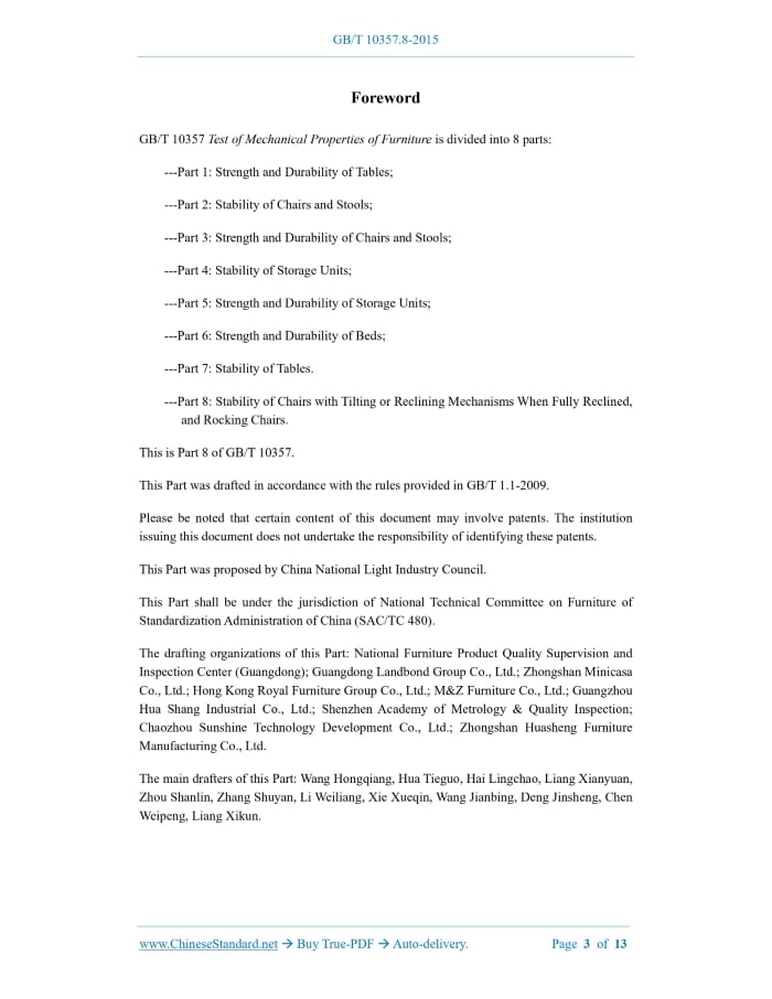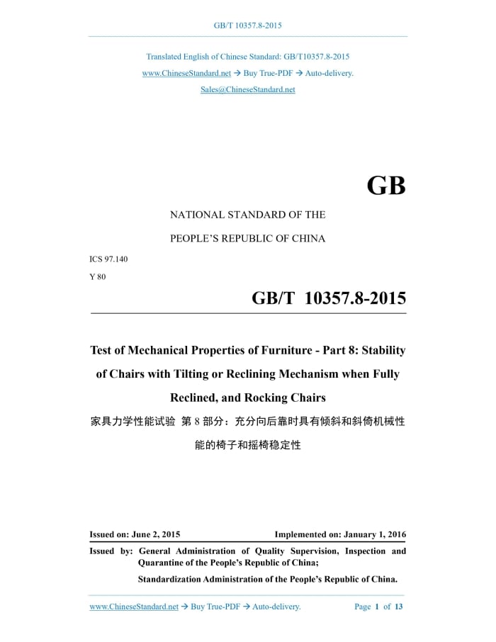 Similar standardsGB/T 10357.8-2015: Test of mechanical properties of furniture - Part 8: Stability of chairs with tilting or reclining mechanisms when fully reclined, and rocking chairs---This is an excerpt. Full copy of true-PDF in English version (including equations, symbols, images, flow-chart, tables, and figures etc.), auto-downloaded/delivered in 9 seconds, can be purchased online: https://www.ChineseStandard.net/PDF.aspx/GBT10357.8-2015 GB NATIONAL STANDARD OF THE PEOPLE’S REPUBLIC OF CHINA ICS 97.140 Y 80 Test of Mechanical Properties of Furniture - Part 8: Stability of Chairs with Tilting or Reclining Mechanism when Fully Reclined, and Rocking Chairs ISSUED ON: JUNE 2, 2015 IMPLEMENTED ON: JANUARY 1, 2016 Issued by: General Administration of Quality Supervision, Inspection and Quarantine of the People’s Republic of China; Standardization Administration of the People’s Republic of China. Table of ContentsForeword ... 3 1 Scope ... 4 2 Normative References ... 4 3 General Test Conditions ... 4 4 Test Equipment ... 5 5 Test Steps ... 7ForewordGB/T 10357 Test of Mechanical Properties of Furniture is divided into 8 parts: ---Part 1: Strength and Durability of Tables; ---Part 2: Stability of Chairs and Stools; ---Part 3: Strength and Durability of Chairs and Stools; ---Part 4: Stability of Storage Units; ---Part 5: Strength and Durability of Storage Units; ---Part 6: Strength and Durability of Beds; ---Part 7: Stability of Tables. ---Part 8: Stability of Chairs with Tilting or Reclining Mechanisms When Fully Reclined, and Rocking Chairs. This is Part 8 of GB/T 10357. This Part was drafted in accordance with the rules provided in GB/T 1.1-2009. Please be noted that certain content of this document may involve patents. The institution issuing this document does not undertake the responsibility of identifying these patents. This Part was proposed by China National Light Industry Council. This Part shall be under the jurisdiction of National Technical Committee on Furniture of Standardization Administration of China (SAC/TC 480). The drafting organizations of this Part: National Furniture Product Quality Supervision and Inspection Center (Guangdong); Guangdong Landbond Group Co., Ltd.; Zhongshan Minicasa Co., Ltd.; Hong Kong Royal Furniture Group Co., Ltd.; M&Z Furniture Co., Ltd.; Guangzhou Hua Shang Industrial Co., Ltd.; Shenzhen Academy of Metrology & Quality Inspection; Chaozhou Sunshine Technology Development Co., Ltd.; Zhongshan Huasheng Furniture Manufacturing Co., Ltd. The main drafters of this Part: Wang Hongqiang, Hua Tieguo, Hai Lingchao, Liang Xianyuan, Zhou Shanlin, Zhang Shuyan, Li Weiliang, Xie Xueqin, Wang Jianbing, Deng Jinsheng, Chen Weipeng, Liang Xikun. Test of Mechanical Properties of Furniture - Part 8: Stability of Chairs with Tilting or Reclining Mechanisms when Fully Reclined, and Rocking Chairs1 ScopeThis Part of GB/T 10357 specifies the test methods for the stability of chairs with tilting or reclining mechanisms when fully reclined, and rocking chairs. This Part is applicable to various types of chairs with tilting or reclining mechanisms when fully reclined, and rocking chairs.2 Normative ReferencesThe following documents are indispensable to the application of this document. In terms of references with a specified date, only versions with a specified date are applicable to this document. In terms of references without a specified date, the latest version (including all the modifications) is applicable to this document. GB/T 10357.2 Test of Mechanical Properties of Furniture - Part 2: Stability of Chairs and Stools3 General Test Conditions3.1 Units The units shall be finished products that are intactly assembled and ready for use. All connectors and fasteners shall be installed in the working condition before the tests. 3.2 Accuracy Unless otherwise specified, the following measurement accuracy applies: ---loading force: 5% of rated value; ---mass: 1% of rated value; ---dimension: 1 mm; ---angle: 2. NOTE: the force exerted can be replaced by mass, and the conversion relation is 10 N = 1 kg. ......Source: Above contents are excerpted from the full-copy PDF -- translated/reviewed by: www.ChineseStandard.net / Wayne Zheng et al. Tips & Frequently Asked Questions:Question 1: How long will the true-PDF of English version of GB/T 10357.8-2015 be delivered?Answer: The full copy PDF of English version of GB/T 10357.8-2015 can be downloaded in 9 seconds, and it will also be emailed to you in 9 seconds (double mechanisms to ensure the delivery reliably), with PDF-invoice.Question 2: Can I share the purchased PDF of GB/T 10357.8-2015_English with my colleagues?Answer: Yes. The purchased PDF of GB/T 10357.8-2015_English will be deemed to be sold to your employer/organization who actually paid for it, including your colleagues and your employer's intranet.Question 3: Does the price include tax/VAT?Answer: Yes. Our tax invoice, downloaded/delivered in 9 seconds, includes all tax/VAT and complies with 100+ countries' tax regulations (tax exempted in 100+ countries) -- See Avoidance of Double Taxation Agreements (DTAs): List of DTAs signed between Singapore and 100+ countriesQuestion 4: Do you accept my currency other than USD?Answer: Yes. www.ChineseStandard.us -- GB/T 10357.8-2015 -- Click this link and select your country/currency to pay, the exact amount in your currency will be printed on the invoice. Full PDF will also be downloaded/emailed in 9 seconds.How to buy and download a true PDF of English version of GB/T 10357.8-2015?A step-by-step guide to download PDF of GB/T 10357.8-2015_EnglishStep 1: Visit website https://www.ChineseStandard.net (Pay in USD), or https://www.ChineseStandard.us (Pay in any currencies such as Euro, KRW, JPY, AUD).Step 2: Search keyword "GB/T 10357.8-2015". Step 3: Click "Add to Cart". If multiple PDFs are required, repeat steps 2 and 3 to add up to 12 PDFs to cart. Step 4: Select payment option (Via payment agents Stripe or PayPal). S