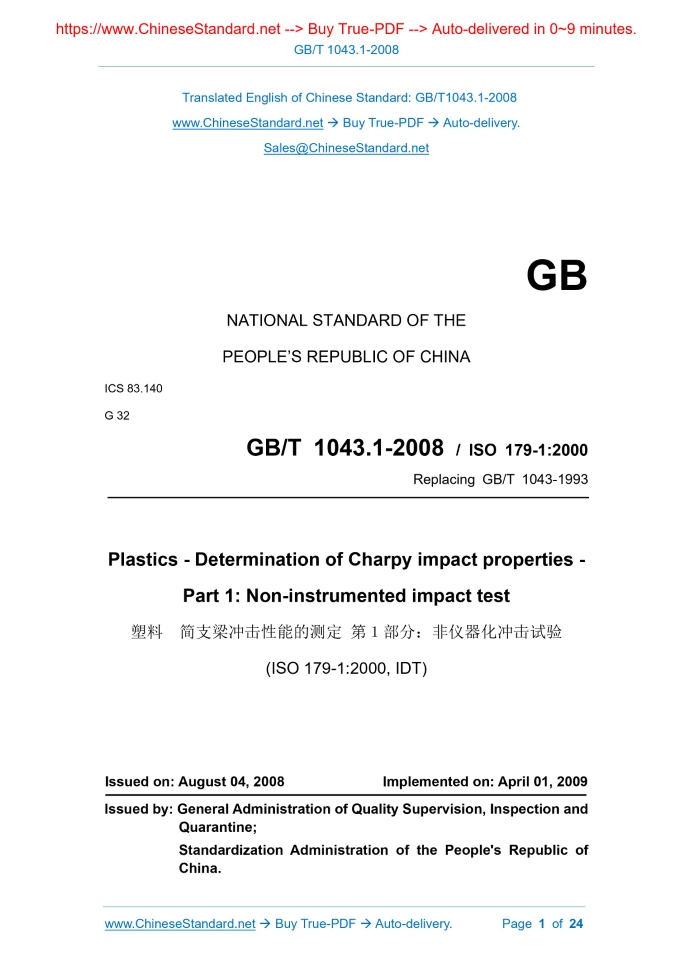 GB/T 1043.1-2008: Plastics -- Determination of Charpy impact properties -- Part 1: Non-instrumented impact test Delivery: 9 seconds. True-PDF full-copy in English & invoice will be downloaded + auto-delivered via email. See step-by-step procedure Status: Valid GB/T 1043.1: Historical versions