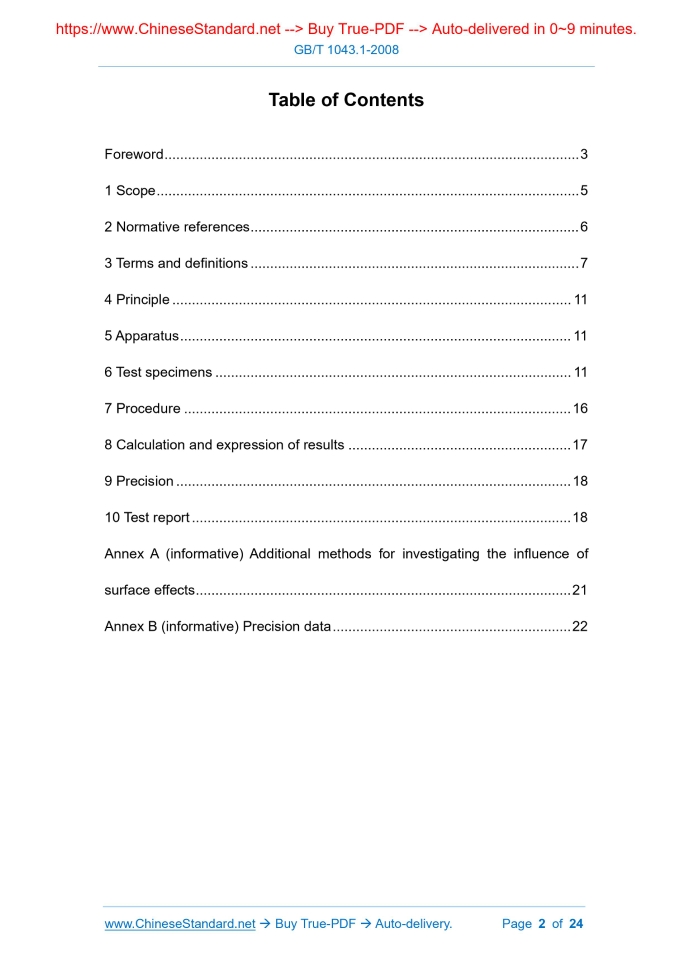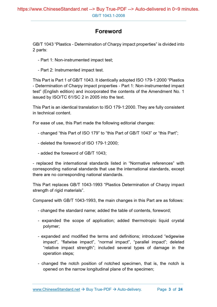 Similar standardsGB/T 1043.1-2008: Plastics -- Determination of Charpy impact properties -- Part 1: Non-instrumented impact test---This is an excerpt. Full copy of true-PDF in English version (including equations, symbols, images, flow-chart, tables, and figures etc.), auto-downloaded/delivered in 9 seconds, can be purchased online: https://www.ChineseStandard.net/PDF.aspx/GBT1043.1-2008 GB NATIONAL STANDARD OF THE PEOPLE’S REPUBLIC OF CHINA ICS 83.140 G 32 GB/T 1043.1-2008 / ISO 179-1:2000 Replacing GB/T 1043-1993 Plastics - Determination of Charpy impact properties - Part 1: Non-instrumented impact test (ISO 179-1:2000, IDT) ISSUED ON: AUGUST 04, 2008 IMPLEMENTED ON: APRIL 01, 2009 Issued by: General Administration of Quality Supervision, Inspection and Quarantine; Standardization Administration of the People's Republic of China. Table of ContentsForeword ... 3 1 Scope ... 5 2 Normative references ... 6 3 Terms and definitions ... 7 4 Principle ... 11 5 Apparatus ... 11 6 Test specimens ... 11 7 Procedure ... 16 8 Calculation and expression of results ... 17 9 Precision ... 18 10 Test report ... 18 Annex A (informative) Additional methods for investigating the influence of surface effects ... 21 Annex B (informative) Precision data ... 22ForewordGB/T 1043 “Plastics - Determination of Charpy impact properties” is divided into 2 parts: - Part 1: Non-instrumented impact test; - Part 2: Instrumented impact test. This Part is Part 1 of GB/T 1043. It identically adopted ISO 179-1:2000 “Plastics - Determination of Charpy impact properties - Part 1: Non-instrumented impact test” (English edition) and incorporated the contents of the Amendment No. 1 issued by ISO/TC 61/SC 2 in 2005 into the text. This Part is an identical translation to ISO 179-1:2000. They are fully consistent in technical content. For ease of use, this Part made the following editorial changes: - changed “this Part of ISO 179” to “this Part of GB/T 1043” or “this Part”; - deleted the foreword of ISO 179-1:2000; - added the foreword of GB/T 1043; - replaced the international standards listed in “Normative references” with corresponding national standards that use the international standards, except there are no corresponding national standards. This Part replaces GB/T 1043-1993 “Plastics Determination of Charpy impact strength of rigid materials”. Compared with GB/T 1043-1993, the main changes in this Part are as follows: - changed the standard name; added the table of contents, foreword; - expanded the scope of application; added thermotropic liquid crystal polymer; - expanded and modified the terms and definitions; introduced “edgewise impact”, “flatwise impact”, “normal impact”, “parallel impact”; deleted “relative impact strength”; included several types of damage in the operation steps; - changed the notch position of notched specimen, that is, the notch is opened on the narrow longitudinal plane of the specimen; - changed the specimen size; - added the chapter of precision; - expanded the content of test report; - added Annex A “Additional methods for investigating the influence of surface effects”; - added Annex B “Precision data”. Annex A and Annex B of this Part are informative. This Part was proposed by China Petroleum and Chemical Industry Association. This Part shall be under the jurisdiction of National Technical Committee on Plastics of Standardization Administration of China (SAC/TC 15). Main drafting organizations of this Part: National Synthetic Resin Quality Supervision and Inspection Center, Guangzhou Synthetic Materials Research Institute Co., Ltd. The drafting organizations of this Part: Beijing Yanshan Petrochemical Resin Institute, National Plastics Quality Inspection Center (Beijing), Shenzhen New Sansi Material Testing Co., Ltd., National Chemical Building Materials Testing Center (Materials Testing Department), National Plastics Quality Inspection Center (Fuzhou), National Petrochemical Organic Raw Material Synthetic Resin Quality Inspection Center, Guangzhou Kingfa Technology Co., Ltd. Main drafters of this Part: Shi Yafang, Wang Jiandong, Wang Haojiang, Chen Hongyuan, Li Jianjun, An Jianping, Wang Chaoxian, He Bo, Li Yu’e, Ling Wei. Versions of standard substituted by this Part are: - GB/T 1043-1970, GB/T 1043-1979, GB/T 1043-1993. Plastics - Determination of Charpy impact properties - Part 1: Non-instrumented impact test1 Scope1.1 This Part of GB/T 1043 specifies a method for determining the Charpy impact strength of plastics under defined conditions. A number of different types of specimen and test configurations are defined. Different test parameters are specified according to the type of material, the type of test specimen and the type of notch. 1.2 This Part is used to investigate the behavior of specified types of specimen under the impact conditions defined and for estimating the brittleness or toughness of specimens within the limitations inherent in the test conditions. It may also be used for the determination of comparative data from similar types of material. 1.3 This Part has a greater range of applicability than that given in GB/T 1843 and is more suitable for the testing of materials showing interlaminar shear fracture or of materials exhibiting surface effects due to environmental factors. 1.4 This Part is suitable for use with the following range of materials: - rigid thermoplastic moulding and extrusion materials, including filled and reinforced compounds in addition to unfilled types; rigid thermoplastics sheets; - rigid thermosetting moulding materials, including filled and reinforced compounds; rigid thermosetting sheets, including laminates; - fibre-reinforced thermosetting and thermoplastic composites incorporating unidirectional or non-unidirectional reinforcements such as mat, woven fabrics, woven rovings, chopped strands, combination and hybrid reinforcements, rovings and milled fibers, sheet made from pre- impregn