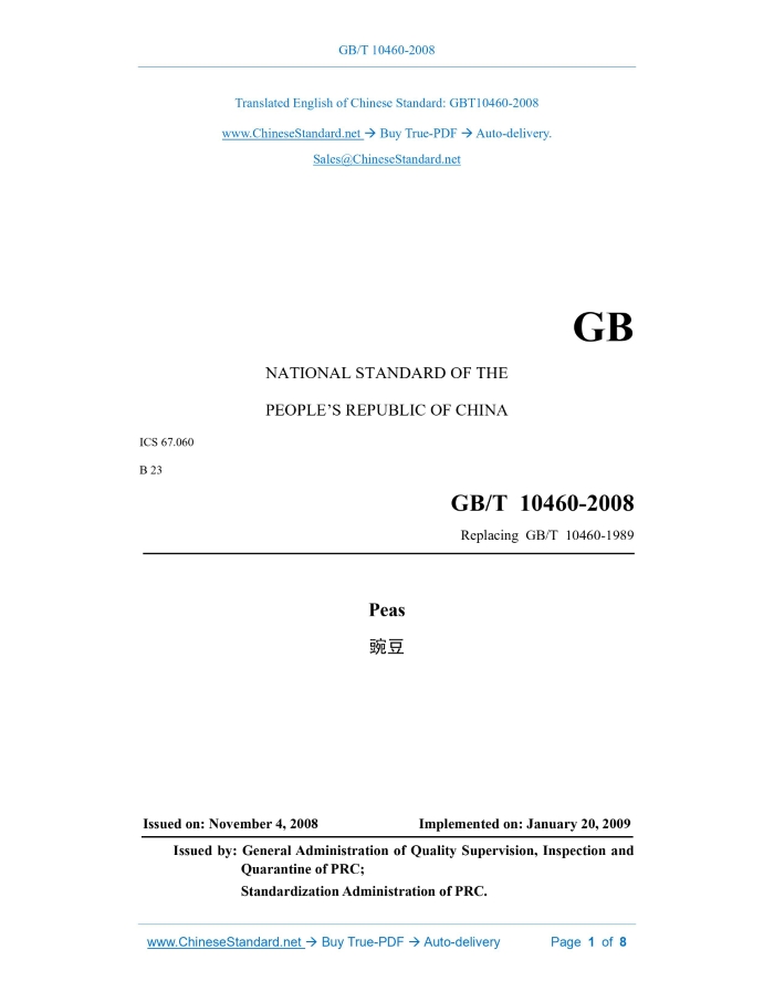 GB/T 10460-2008: Peas Delivery: 9 seconds. True-PDF full-copy in English & invoice will be downloaded + auto-delivered via email. See step-by-step procedure Status: Valid GB/T 10460: Historical versions