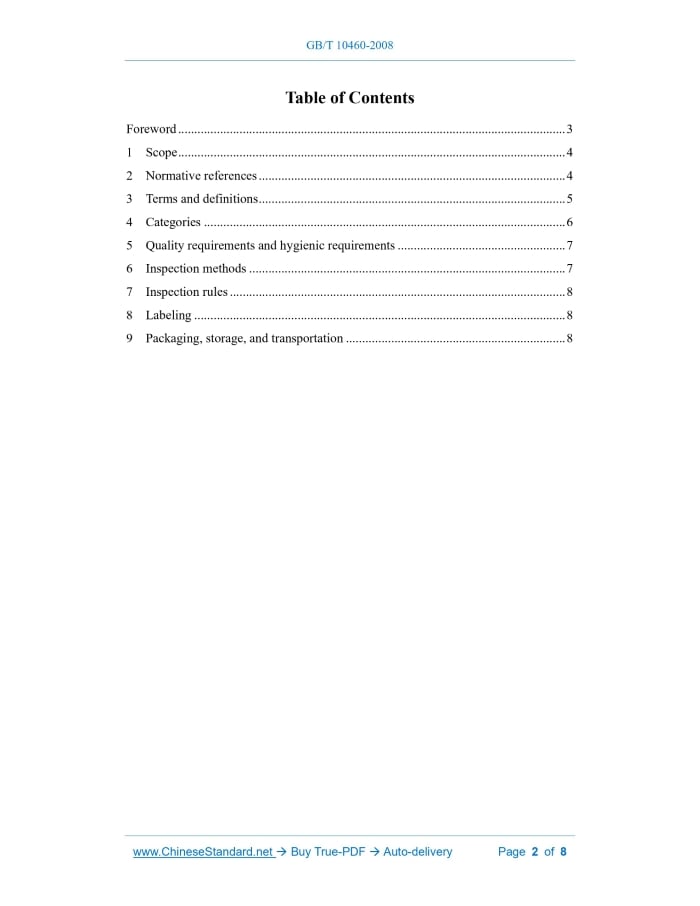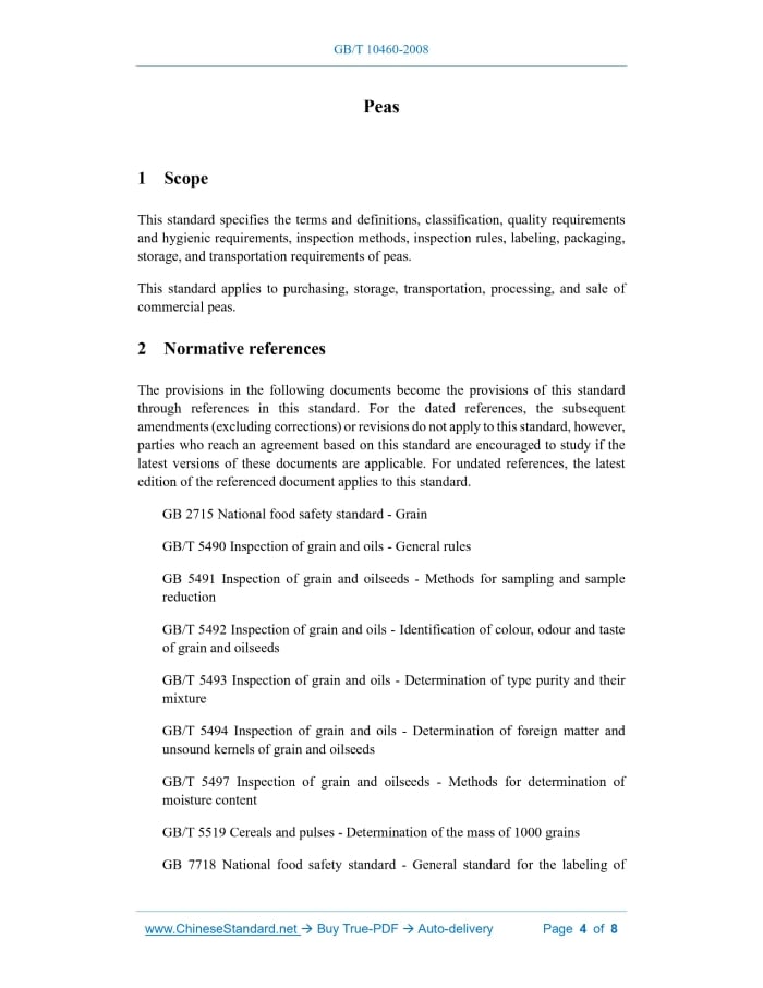 Similar standardsGB/T 10460-2008: Peas---This is an excerpt. Full copy of true-PDF in English version (including equations, symbols, images, flow-chart, tables, and figures etc.), auto-downloaded/delivered in 9 seconds, can be purchased online: https://www.ChineseStandard.net/PDF.aspx/GBT10460-2008GB NATIONAL STANDARD OF THE PEOPLE’S REPUBLIC OF CHINA ICS 67.060 B 23 Replacing GB/T 10460-1989 Peas 豌豆 ISSUED ON: NOVEMBER 4, 2008 IMPLEMENTED ON: JANUARY 20, 2009 Issued by: General Administration of Quality Supervision, Inspection and Quarantine of PRC; Standardization Administration of PRC. Table of ContentsForeword ... 3 1 Scope ... 4 2 Normative references ... 4 3 Terms and definitions ... 5 4 Categories ... 6 5 Quality requirements and hygienic requirements ... 7 6 Inspection methods ... 7 7 Inspection rules ... 8 8 Labeling ... 8 9 Packaging, storage, and transportation ... 8 Peas1 ScopeThis standard specifies the terms and definitions, classification, quality requirements and hygienic requirements, inspection methods, inspection rules, labeling, packaging, storage, and transportation requirements of peas. This standard applies to purchasing, storage, transportation, processing, and sale of commercial peas.2 Normative referencesThe provisions in the following documents become the provisions of this standard through references in this standard. For the dated references, the subsequent amendments (excluding corrections) or revisions do not apply to this standard, however, parties who reach an agreement based on this standard are encouraged to study if the latest versions of these documents are applicable. For undated references, the latest edition of the referenced document applies to this standard. GB 2715 National food safety standard - Grain GB/T 5490 Inspection of grain and oils - General rules GB 5491 Inspection of grain and oilseeds - Methods for sampling and sample reduction GB/T 5492 Inspection of grain and oils - Identification of colour, odour and taste of grain and oilseeds GB/T 5493 Inspection of grain and oils - Determination of type purity and their mixture GB/T 5494 Inspection of grain and oils - Determination of foreign matter and unsound kernels of grain and oilseeds GB/T 5497 Inspection of grain and oilseeds - Methods for determination of moisture content GB/T 5519 Cereals and pulses - Determination of the mass of 1000 grains GB 7718 National food safety standard - General standard for the labeling of prepackaged foods GB/T 17109 Package of grain sells GB/T 22725 Inspection of grain and oils - Determination of pure kernel yield of grain and oils3 Terms and definitionsThe following terms and definitions apply to this standard. 3.1 peas Legume seeds produced by pea cultivars. 3.2 pure grain yield The proportion of pea grains from which foreign impurities have been removed in the mass fraction of the sample, of which the unsound kernels are calculated as half of their masses. 3.3 unsound kernel Kernels that are damaged but still have use value, including the following: 3.3.1 spotted kernel The kernel that has disease spots on the surface, which damaged the embryo. 3.3.2 injured kernel The kernel whose seed coat is eroded by insects and the embryo is damaged. 3.3.3 moldy kernel The kernel whose surface is moldy. 3.3.4 broken kernel The kernel whose cotyledon is incomplete, transected, or broken. 3.3.5 sprouted kernel The kernel whose embryonic shoot or radicle breaks through the seed coat. 3.3.6 shrivelled pods/kernel The kernel that is not plump, and more than half of its surface is shrunk; it is significantly different from normal kernels. 3.4 foreign impurity Substances that are not peas, including the following: 3.4.1 material passed sieve Material that can pass through a 3.0 mm diameter round-hole sieve. 3.4.2 inorganic impurity Soil, sand, bricks, tiles, and other inorganic substances. 3.4.3 organic impurity Pea kernels, heterogeneous kernels, straw residues, and other organic matter, which have no edible value. 3.5 colour, odour The inherent colour and odour of a batch of peas.4 CategoriesPeas can be divided into the following categories according to their 1000-grain weight and skin color: 4.1 Large-grained white peas: Peas whose 1000-grain weight is greater than 250 g, and no less than 95% of which the seed coat is white or yellowish-white. 4.2 Large-grained green peas: Peas whose 1000-grain weight is greater than 250 g, and no less than 95% of which the seed coat is green. 4.3 Large-grained purple peas: Peas whose 1000-grain weight is greater than 250 g, and no less than 95% of which the seed coat is purple or brownish-purple. 4.4 Medium-grained white peas: Peas whose 1000-grain weight is between 150 g and 250 g, and no less than 95% of which the seed coat is white or yellowish-white. 4.5 Medium-grained green peas: Peas whose 1000-grain weight is between 150 g and 250 g, and no less than 95% of which the seed coat is green. 4.6 Medium-grained purple peas: Peas whose 1000-grain weight is between 150 g and 250 g, and no less than 95% of which the seed coat is purple or brownish-purple. ......Source: Above contents are excerpted from the full-copy PDF -- translated/reviewed by: www.ChineseStandard.net / Wayne Zheng et al. Tips & Frequently Asked Questions:Question 1: How long will the true-PDF of English version of GB/T 10460-2008 be delivered?Answer: The full copy PDF of English version of GB/T 10460-2008 can be downloaded in 9 seconds, and it will also be emailed to you in 9 seconds (double mechanisms to ensure the delivery reliably), with PDF-invoice.Question 2: Can I share the purchased PDF of GB/T 10460-2008_English with my colleagues?Answer: Yes. The purchased PDF of GB/T 10460-2008_English will be deemed to be sold to your employer/organization who actually paid for it, including your colleagues and your employer's intranet.Question 3: Does the price include tax/VAT?Answer: Yes. Our tax invoice, downloaded/delivered in 9 seconds, includes all tax/VAT and 