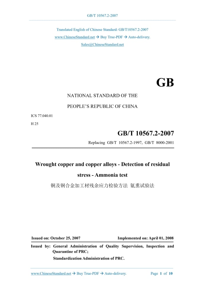 GB/T 10567.2-2007: Wrought copper and copper alloy -- Detection of residual stress -- Ammonia test Delivery: 9 seconds. True-PDF full-copy in English & invoice will be downloaded + auto-delivered via email. See step-by-step procedure Status: Valid GB/T 10567.2: Historical versions