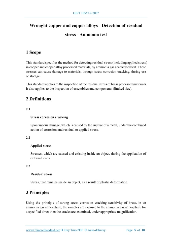 Similar standardsGB/T 10567.2-2007: Wrought copper and copper alloy -- Detection of residual stress -- Ammonia test---This is an excerpt. Full copy of true-PDF in English version (including equations, symbols, images, flow-chart, tables, and figures etc.), auto-downloaded/delivered in 9 seconds, can be purchased online: https://www.ChineseStandard.net/PDF.aspx/GBT10567.2-2007NATIONAL STANDARD OF THE PEOPLE’S REPUBLIC OF CHINA ICS 77.040.01 H 25 Replacing GB/T 10567.2-1997, GB/T 8000-2001 Wrought copper and copper alloys - Detection of residual stress - Ammonia test ISSUED ON: OCTOBER 25, 2007 IMPLEMENTED ON: APRIL 01, 2008 Issued by: General Administration of Quality Supervision, Inspection and Quarantine of PRC; Standardization Administration of PRC. Table of ContentsForeword ... 3 1 Scope ... 5 2 Definitions ... 5 3 Principles ... 5 4 Instruments ... 6 5 Reagents ... 6 6 Specimens ... 6 7 Test methods and requirements ... 7 8 Test procedures ... 8 9 Test report ... 9 Appendix A (Normative) pH of the test solution ... 10 Wrought copper and copper alloys - Detection of residual stress - Ammonia test1 ScopeThis standard specifies the method for detecting residual stress (including applied stress) in copper and copper alloy processed materials, by ammonia gas accelerated test. These stresses can cause damage to materials, through stress corrosion cracking, during use or storage. This standard applies to the inspection of the residual stress of brass processed materials. It also applies to the inspection of assemblies and components (limited size).2 Definitions2.1 Stress corrosion cracking Spontaneous damage, which is caused by the rupture of a metal, under the combined action of corrosion and residual or applied stress. 2.2 Applied stress Stresses, which are caused and existing inside an object, during the application of external loads. 2.3 Residual stress Stress, that remains inside an object, as a result of plastic deformation.3 PrinciplesUsing the principle of strong stress corrosion cracking sensitivity of brass, in an ammonia gas atmosphere, the samples are exposed to the ammonia gas atmosphere for a specified time; then the cracks are examined, under appropriate magnification. negotiation between the supplier and the buyer. 6.3 Before sampling, it shall avoid handling, bumping, or other actions, which may bring in other external stresses, that may affect the test results. 6.4 The specimen shall not have defects, such as bending, flattening, scratching, peeling, wrinkling, bumping and so on. When cutting the specimen, there shall be no applied stress, such as clamping or artificial breaking. Where it is necessary to mark the specimen for easy identification, it shall avoid the introduction of applied stress into the specimen.7 Test methods and requirements7.1 The test methods are divided into ammonium chloride test method and ammonia water test method. 7.1.1 When the heat exchangers adopt brass pipes, it can adopt either the ammonium chloride test method or the ammonia water test method. The ammonium chloride test method is used, during arbitration. 7.1.2 The ammonium chloride test method shall be used, for other brass processing materials. 7.2 Ammonia time 7.2.1 The test time of the ammonium chloride test method is 24 h. 7.2.2 The test time of ammonia water test method is 4 h. 7.3 The test temperature shall be 20 °C ~ 30 °C. The temperature fluctuation, during the test, shall not exceed ±1 °C. During arbitration, the temperature is maintained at 25 °C ± 1 °C. 7.4 Consumption of test solution 7.4.1 The volume of test solution, which is used in the ammonium chloride test method, shall be not less than 20% of the total volume of the container, AND not less than 100 mL per square decimeter of specimen's surface area. 7.4.2 The volume of ammonia water, which is used in the ammonia water test method, is 200 mL. 7.5 The specimen shall be placed in the desiccator, in such a way that the ammonia vapor can freely reach all surfaces of the specimen; meanwhile there shall be no contact between the specimens. 7.6 Specimen cleaning and ammonia fumigation shall be carried out in a fume hood.8 Test procedures8.1 Prepare ammonium chloride test solution: Slowly add the sodium hydroxide solution (5.2) into the ammonium chloride solution (5.1.1), to prepare a test solution, which has a specified pH value of ±0.05 (see Appendix A). Maintain the solution to room temperature. ADD deionized water, to dilute it to a volume of 1000 mL. After dilution, use a pH meter (4.1), to check the pH value. Note: The preparation of the solution shall be carried out in a fume hood; the solution shall be stored in a mouth-ground bottle (4.2). The pH of the solution shall be checked again, before each use; adjust the solution to the specified pH. 8.2 Use a clean organic solvent or hot alkaline solution (5.3), to degrease the specimen. 8.3 After degreasing, wash the specimen in the pickling solution (5.4). When the concentration of the pickling solution is not enough, add 20 mL ~ 50 mL of hydrogen peroxide solution (5.5), per liter of the pickling solution. Immediately after pickling, rinse thoroughly in running water. Finally use an electric blower (4.5), to blow dry the specimen. 8.4 After the dried specimen has reached the specified test temperature, move it to a desiccator (4.2), at the same temperature. 8.5 When using the ammonium chloride test method, pour the newly prepared test solution (8.1), which has the specified pH value (see Appendix A), into the desiccator. When using the ammonia test method, pour the ammonia water (5.1.2) into the desiccator. Then immediately cover the desiccator lid. Start timekeeping. 8.6 After reaching the specified test time, take out the specimen from the desiccator. First rinse it in the water washing tank (4.6). Then put it into the pickling solution (5.4) for pickling. The pickling time shall be sufficient, that the corrosion products on the specimen surface are sufficiently