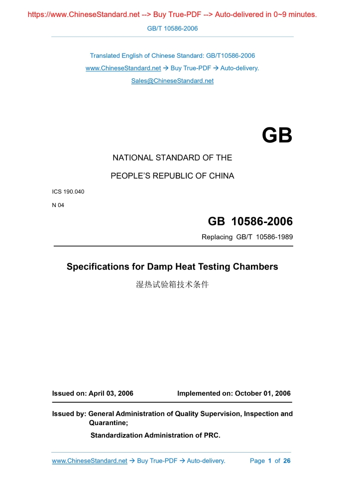 GB/T 10586-2006: Specification for damp heat testing chambers Delivery: 9 seconds. True-PDF full-copy in English & invoice will be downloaded + auto-delivered via email. See step-by-step procedure Status: Valid GB/T 10586: Historical versions