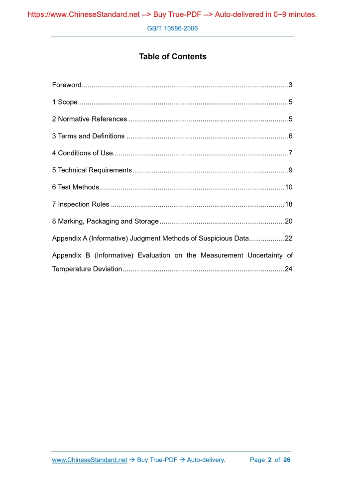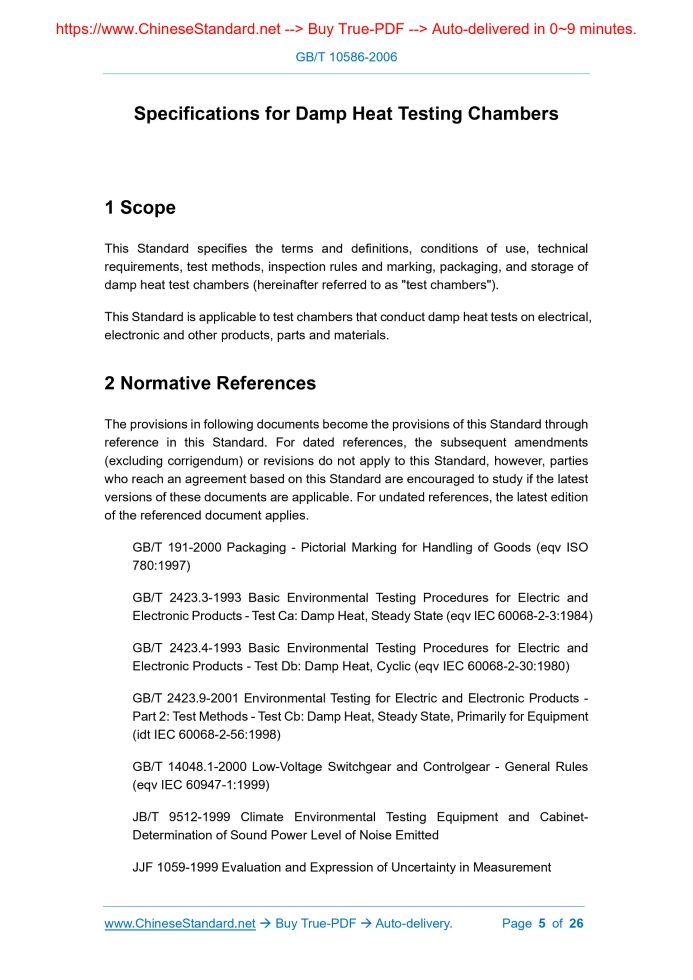 Similar standardsGB/T 10586-2006: Specification for damp heat testing chambers---This is an excerpt. Full copy of true-PDF in English version (including equations, symbols, images, flow-chart, tables, and figures etc.), auto-downloaded/delivered in 9 seconds, can be purchased online: https://www.ChineseStandard.net/PDF.aspx/GBT10586-2006GB NATIONAL STANDARD OF THE PEOPLE’S REPUBLIC OF CHINA ICS 190.040 N 04 GB 10586-2006 Replacing GB/T 10586-1989 Specifications for Damp Heat Testing Chambers Issued on. APRIL 03, 2006 Implemented on. OCTOBER 01, 2006 Issued by. General Administration of Quality Supervision, Inspection and Quarantine; Standardization Administration of PRC. Table of ContentsForeword... 3 1 Scope... 5 2 Normative References... 5 3 Terms and Definitions... 6 4 Conditions of Use... 7 5 Technical Requirements... 9 6 Test Methods... 10 7 Inspection Rules... 18 8 Marking, Packaging and Storage... 20 Appendix A (Informative) Judgment Methods of Suspicious Data... 22 Appendix B (Informative) Evaluation on the Measurement Uncertainty of Temperature Deviation... 24ForewordThis Standard was one of the serial standards of “Specifications for Environmental Test Equipment”. Such serial standards consist of the following standards. --- GB/T 10586-2006 Specifications for Damp Heat Chambers; --- GB/T 10587-2006 Specifications for Salt Mist Testing Chambers; --- GB/T 10588-2006 Specifications for Mould Growth Testing Chambers; --- GB/T 10589-1989 Specification for Low Temperature Test Chambers; --- GB/T 10590-2006 Specifications for High and Low Temperature/Low Air Pressure Testing Chambers; --- GB/T 10591-2006 Specifications for High Temperature/Low Air Pressure Testing Chambers; --- GB/T 10592-1989 Specification for Low/High Temperature Test Chambers; --- GB/T 11158-1989 Specification for High Temperature Test Chambers. This Standard replaced GB/T 10586-1989 Specification for Damp Heat Test Chambers. Compared with GB/T 10586-1989, this Standard has the major technical changes as follows. a) This standard adds a Clause "Terms and Definitions"; and the content adopts the relevant parts of IEC 60068-3-5 and IEC 60068-3-6; b) According to the concept of temperature fluctuation in IEC 60068-3-5, the temperature fluctuation index is changed into 1°C (see Table 1 of this Edition); c) According to the requirements of temperature data recording in IEC 60068-3-5, the data is changed to record every minute (see 6.4 of this Edition); d) According to the temperature-rise rate test method in IEC 60068-3-5, modify the temperature-rise rate test method (see 6.4.3.8 of this Edition); e) The range of atmospheric pressure has been expanded in the environmental conditions of use (see 4.1 of this Edition); f) Propose the requirements for the quality of cooling water (see 4.3a) of this Edition); g) Expand the temperature and humidity adjustment range of Class-II products (see Table 1 of this Edition); h) Add the requirements for electrical insulation strength (see 5.3.1 of this Edition); i) The test of temperature and humidity performance is changed to be carried out under no-load conditions (see 6.2.2 of this Edition); j) Add the evaluation method and application information of the uncertainty for measurement of temperature deviation (see Appendix B of this Edition). The Appendixes A and B of this Standard are informative. This Standard was proposed by China Machinery Industry Federation. This Standard shall be under the jurisdiction of Instrumentation Technology and Economy Institute, P.R.C. Drafting organizations of this Standard. Shanghai Espec Environment Equipment Co., Ltd.; Chongqing Yinhe Testing Instrument Co., Ltd.; Guangzhou Electric Apparatus Research Institute; and Chongqing Wanda Instrument Co., Ltd. Participating drafting organizations of this Standard. Wuxi Sunan Test Equipment Co., Ltd.; Shanghai Laboratory Instrument Works Co., Ltd.; and Chengdu Tianyu Test Equipment Co., Ltd. Chief drafting staffs of this Standard. Lu Liming, Xu Qinglu, Liao Qing, Chen Yunsheng, Ni Yiming, Feng Mingkang, and Kuai Zhengxin. The historical edition replaced by this Standard is as follows. --- GB/T 10586-1989. Specifications for Damp Heat Testing Chambers1 ScopeThis Standard specifies the terms and definitions, conditions of use, technical requirements, test methods, inspection rules and marking, packaging, and storage of damp heat test chambers (hereinafter referred to as "test chambers"). This Standard is applicable to test chambers that conduct damp heat tests on electrical, electronic and other products, parts and materials.2 Normative ReferencesThe provisions in following documents become the provisions of this Standard through reference in this Standard. For dated references, the subsequent amendments (excluding corrigendum) or revisions do not apply to this Standard, however, parties who reach an agreement based on this Standard are encouraged to study if the latest versions of these documents are applicable. For undated references, the latest edition of the referenced document applies. GB/T 191-2000 Packaging - Pictorial Marking for Handling of Goods (eqv ISO 780.1997) GB/T 2423.3-1993 Basic Environmental Testing Procedures for Electric and Electronic Products - Test Ca. Damp Heat, Steady State (eqv IEC 60068-2-3.1984)3 Terms and DefinitionsFor the purpose of this Standard, the following terms and definitions apply. 3.1 Test chamber An enclosed box or space, thereof, some parts meet the specified test conditions. 3.2 Temperature setpoint The desired temperature that is set by the test chamber control device. 3.3 Achieved temperature After stabilization, the temperature at any point in the working space of the test chamber. 3.7 Temperature gradient After stabilization, in any time interval, the maximum value of the difference between the average temperature of any two points in the working space. 3.8 Temperature rate of change The rate of transition between two given temperatures measured in the cen