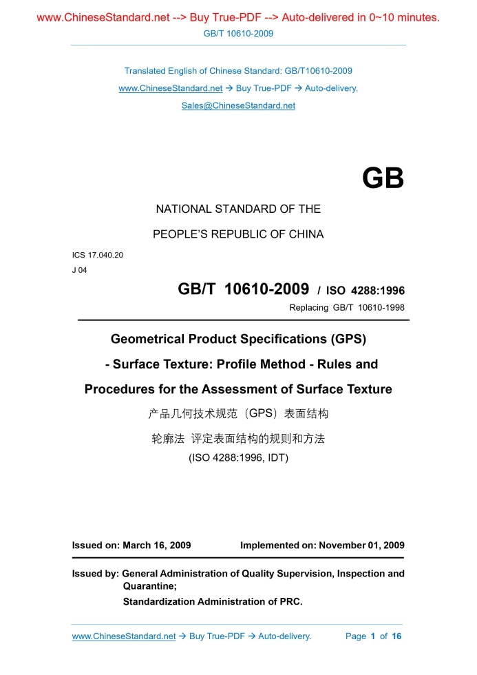 | GB/T 10610-2009 PDF EnglishUS$125.00 · In stock · Download in 9 seconds GB/T 10610-2009: Geometrical product specifications (GPS) -- Surface texture: Profile method -- Rules and procedures for the assessment of surface texture Delivery: 9 seconds. True-PDF full-copy in English & invoice will be downloaded + auto-delivered via email. See step-by-step procedure Status: Valid GB/T 10610: Historical versions