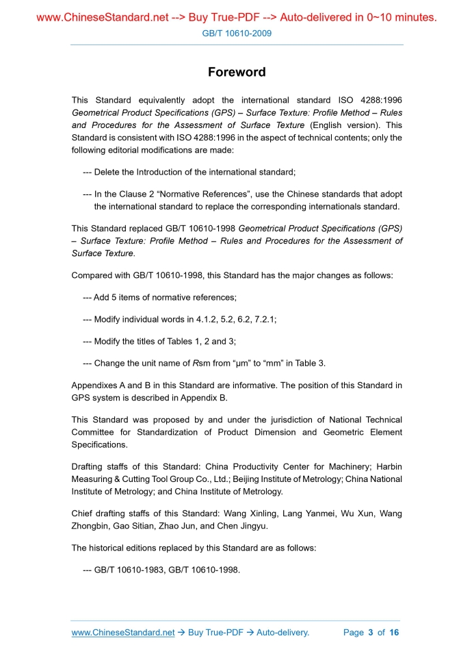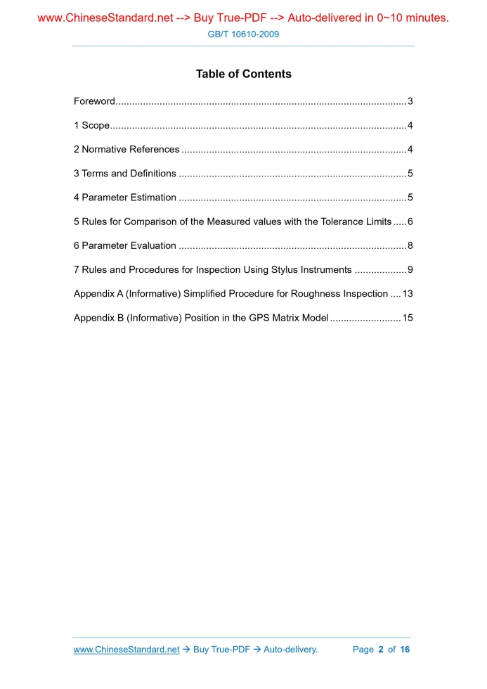 Similar standardsGB/T 10610-2009: Geometrical product specifications (GPS) -- Surface texture: Profile method -- Rules and procedures for the assessment of surface texture---This is an excerpt. Full copy of true-PDF in English version (including equations, symbols, images, flow-chart, tables, and figures etc.), auto-downloaded/delivered in 9 seconds, can be purchased online: https://www.ChineseStandard.net/PDF.aspx/GBT10610-2009 Geometrical product specifications (GPS) - Surface texture. Profile method - Rules and procedures for the assessment of surface texture ICS 17.040.20 J04 National Standards of People's Republic of China Product Geometric Technical Specification (GPS) Surface structure profile method Rules and methods for evaluating surface structure 2009-03-16 released Implementation of.2009-11-01 General Administration of Quality Supervision, Inspection and Quarantine of the People's Republic of China Issued by China National Standardization Administration PrefaceThis standard is equivalent to the international standard ISO 4288..1996 "Geometrical Product Specification (GPS) Surface Structure Profile Method Evaluation Rules and Methods of Surface Structure (English version). The technical content of this standard is consistent with ISO 4288..1996.It is only for editing as follows modify. ---The introduction of international standards is deleted; ---In Chapter 2 "Normative Reference Documents", the corresponding international standards are replaced by Chinese standards that adopt international standards. This standard replaces GB/T 10610-1998 "Geometric Technical Specifications for Products, Surface Structure Profile Method, Rules and Rules for Surface Structure Evaluation method". Compared with GB/T 10610-1998, the main changes of this standard are as follows. ---Added 5 normative references; ---Revised individual words in Article 4.1.2, 5.2, 6.2, and 7.2.1; ---Revised the title of Table 1, Table 2, Table 3; Appendix A and Appendix B of this standard are informative appendices. The position of this standard in the GPS system is described in Appendix B. This standard was proposed and managed by the National Standardization Technical Committee for Product Dimensions and Geometric Technical Specifications. Drafting organizations of this standard. China National Machinery Productivity Promotion Center, Harbin Measuring and Cutting Tool Group Co., Ltd., Beijing Metrology and Testing Science Research Institute, China Institute of Metrology, China Institute of Metrology. The main drafters of this standard. Wang Xinling, Lang Yanmei, Wu Xun, Wang Zhongbin, Gao Sitian, Zhao Jun, Chen Jingyu. The previous versions of the standard replaced by this standard are as follows. --- GB/T 10610-1983, GB/T 10610-1998. GB/T 10610-2009/ISO 4288..1996 Product Geometric Technical Specification (GPS) Surface structure profile method Rules and methods for evaluating surface structure1 scopeThis standard specifies GB/T 3505-2009, GB/T 18618, GB/T 18778.2-2003, GB/T 18778.3-2006 The measured values of various surface structure parameters are compared with tolerance limits. This standard also specifies the application of the stylus instrument specified in GB/T 6062 to measure the roughness profile parameters defined in GB/T 3505-2009 The default rule of cut-off wavelength λ犮 is selected when counting.2 Normative referencesThe clauses in the following documents become clauses of this standard after being quoted in this standard. For dated reference documents, all subsequent Amendments (not including errata content) or revisions do not apply to this standard. However, all parties that have reached an agreement based on this standard are encouraged to study Is the latest version of these files available? For undated references, the latest version is applicable to this standard. GB/T 131-2006 Product Geometric Technical Specification (GPS) Representation of surface structure in technical product documents (ISO 1302. 2002, IDT) GB/T 1031-2009 Product Geometric Technical Specification (GPS) Surface texture profile method surface roughness parameters and their values GB/T 3505-2009 Product Geometric Technical Specification (GPS) Surface structure profile method terms, definitions and surface structure parameters (ISO 4287..1997, IDT) GB/T 6062-2009 Product Geometric Technical Specification (GPS) The nominal characteristics of contact (stylus) instruments with surface structure profile method Sex (ISO 3274..1996, IDT)4 Parameter measurement4.1 Parameters defined on the sampling length 4.1.1 Parameter determination Only one measurement of the parameter value calculated from the data measured by one sampling length. 4.1.2 Determination of average parameters Take the arithmetic average of all parameter values calculated according to a single sampling length to obtain an average parameter measurement. When taking 5 sampling lengths (default value) to determine the roughness profile parameters, there is no need to make a mark after the parameter symbol. If the parameter value is not measured at 5 sampling lengths, the number of sampling lengths must be marked after the parameter symbol, for example. R狕1, R狕3. 4.2 Parameters defined on the evaluation length The default value of the assessment length) is calculated from the measurement data. 4.3 Curves and related parameters For the determination of the curve and related parameters, first solve the curve based on the evaluation length, and then use the data measured on the curve to calculate Get a parameter value. 4.4 Default assessment length If there is no other mark on the drawings or technical product documents, the default evaluation length should follow the following provisions. ---R parameter. According to the evaluation length given in Chapter 7; ---P parameter. the evaluation length is equal to the length of the measured feature; ---Graphic parameters. See Chapter 5 of GB/T 18618-2002 for the provisions of the assessment length; ---GB/T 18778.2-2003, GB/T 