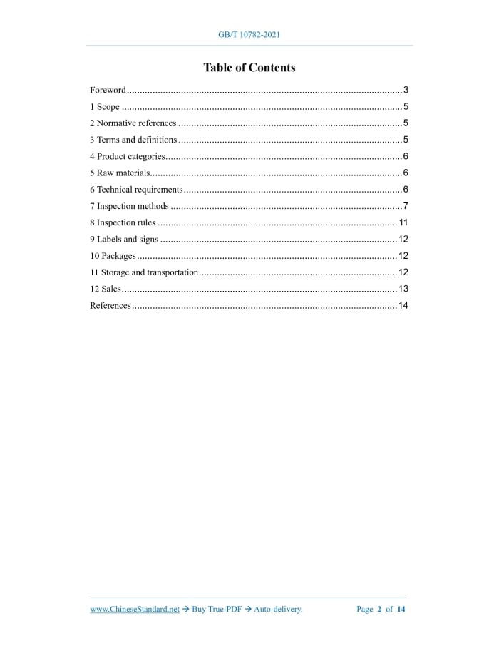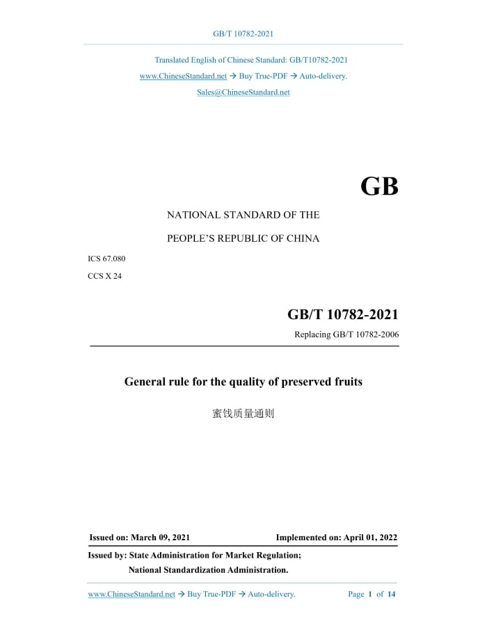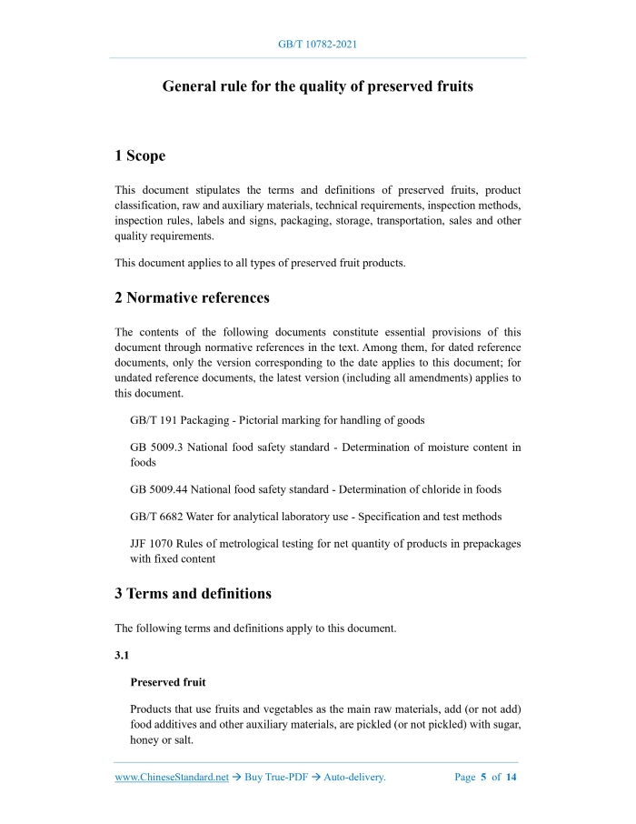 Similar standardsGB/T 10782-2021: General rule for the quality of preserved fruits---This is an excerpt. Full copy of true-PDF in English version (including equations, symbols, images, flow-chart, tables, and figures etc.), auto-downloaded/delivered in 9 seconds, can be purchased online: https://www.ChineseStandard.net/PDF.aspx/GBT10782-2021GB NATIONAL STANDARD OF THE PEOPLE’S REPUBLIC OF CHINA ICS 67.080 CCS X 24 Replacing GB/T 10782-2006 General rule for the quality of preserved fruits Issued on. MARCH 09, 2021 Implemented on. APRIL 01, 2022 Issued by. State Administration for Market Regulation; National Standardization Administration. Table of ContentsForeword... 3 1 Scope... 5 2 Normative references... 5 3 Terms and definitions... 5 4 Product categories... 6 5 Raw materials... 6 6 Technical requirements... 6 7 Inspection methods... 7 8 Inspection rules... 11 9 Labels and signs... 12 10 Packages... 12 11 Storage and transportation... 12 12 Sales... 13 References... 14ForewordThis document is drafted in accordance with the provisions of GB/T 1.1-2020 "Directives for standardization - Part 1.Rules for the structure and drafting of standardizing documents". This document replaces GB/T 10782-2006 "General rule for preserved fruits". Compared with GB/T 10782-2006, in addition to editorial modifications, the main technical changes are as follows. - MODIFY the scope (Chapter 1; Chapter 1 of the 2006 edition); - MODIFY the normative references (Chapter 2; Chapter 2 of the 2006 edition); - MODIFY "Product classification" (Chapter 4; Chapter 4 of the 2006 edition); - MODIFY the relevant requirements for "Raw materials and excipients" (Chapter 5; 5.1 of the 2006 edition); - MODIFY the "Physical and chemical indicators", adjusting the technical requirements for the "moisture", "sodium chloride", "total sugar" indicators (6.2; 5.4 of the 2006 edition); - DELETE "Hygienic indicators" and "Food additives" (5.5 and 5.6 in the 2006 edition); - MODIFY the "Test methods" (Chapter 7; Chapter 6 of the 2006 edition); - MODIFY the "Sampling methods and sampling amounts" (8.2; 7.2 of the 2006 edition); - DELETE the "moisture" indicator from the exit-factory inspection items (8.3; 7.3 in the 2006 edition); - MODIFY the "Type inspection" (8.4; 7.4 of the 2006 edition); - MODIFY the "Judgment rules" (8.5; 7.5 in the 2006 edition); - MODIFY the "Labels and marks" (Chapter 9; Chapter 8 of the 2006 edition); - ADD the "Packaging" (Chapter 10); - ADD the "Storage and transportation" (Chapter 11). Please note that some content in this document may be subject to patents. The publisher of this document assumes no responsibility for identifying patents. This document was proposed by AND shall be under the jurisdiction of the National Snack Food Standardization Technical Committee (SAC/TC 490). Drafting organizations of this document. China Chamber of Commerce, Zhejiang Fangyuan Inspection Group Co., Ltd., China Baked Food and Sugar Products Industry Association, Yanjin Puzi Food Co., Ltd., Zhejiang Zhang Cuifeng Food Co., Ltd., Beijing Yushiyuan Food Co., Ltd., Hangzhou Chaoda Food Co., Ltd., Shenzhen Standa Consulting Co., Ltd., National Processed Food Quality Inspection Center (Guangdong), Hunan Provincial Food Quality Supervision and Inspection Institute, Hangzhou Huaweiheng Food Co., Ltd., Three Squirrels Co., Ltd., Guangdong Xinxing County Liangguo Industry Chamber of Commerce, Shanghai Laiyifen Co., Ltd., Tianwo (Fujian) Food Co., Ltd., Liuliu Orchard Group Co., Ltd., Jiekesi Agricultural Technology (Xuzhou) Co., Ltd., Jiangsu Paroz Food Co., Ltd., Shanghai Institute of Quality Supervision and Inspection Technology, Guangdong Jigong Health Food Co., Ltd., Guangdong Nongfushanzhuang Food Industry Co., Ltd., Chengde Yida Food Co., Ltd., Guangdong Jiabao Group Co., Ltd., Hunan Zhengxingji Food Co., Ltd., Hangzhou Meiyuan Food Co., Ltd., Hangzhou Yuhang District Preserved Fruit Industry Association. The main drafters of this document. Sheng Huadong, Liu Zhenyu, Zhang Jiukui, Dong Lijun, Zhang Xuewen, Zhang Aifang, Dai Jueru, Jin Xiaolei, Zhang Bin, Cai Dongmei, Liu Minfang, Cai Weihong, Tang Xiaolan, Zhang Haibin, Lu Hongxia, Tan Yisheng, Wei Benqiang, Gu Qianhui, Chen Zhixian, Liang Xichang, Zhang Lihua, Jiang Yuming, Zhuo Nanan, Yang Fan, Yang Qicai, Jiao Yufen, Zhang Su, Zhang Teng, Wang Hui, Peng Yafeng, Lai Xuan, Wang Shaolin, Lin Hailin, Wang Jinhua, Yang Wanru, Tang Huawei, Zhang Shuifeng, Yu Genrong, Shou Lisha. This standard replaces the standard previously issued as follows. - It was first issued in 1989 as GB/T 10782-1989; - In the first revision in 2006, the contents of GB/T 11860-1989 "Method of physical- chemical inspection for preserved fruit food" were incorporated; - This is the second revision. General rule for the quality of preserved fruits1 ScopeThis document stipulates the terms and definitions of preserved fruits, product classification, raw and auxiliary materials, technical requirements, inspection methods, inspection rules, labels and signs, packaging, storage, transportation, sales and other quality requirements. This document applies to all types of preserved fruit products.2 Normative referencesThe contents of the following documents constitute essential provisions of this document through normative references in the text. Among them, for dated reference documents, only the version corresponding to the date applies to this document; for undated reference documents, the latest version (including all amendments) applies to this document. GB/T 191 Packaging - Pictorial marking for handling of goods GB 5009.3 National food safety standard - Determination of moisture content in foods GB 5009.44 National food safety standard - Determination of chloride in foods3 Terms and definitionsThe following terms and definitions apply to this document. 3.1 Preserved fruit Products that use fruits and vegetables as the main raw materials, add (or not add) food additives and other auxiliary materials, are