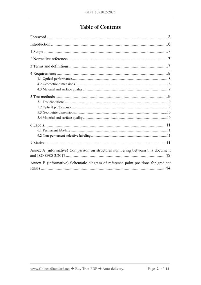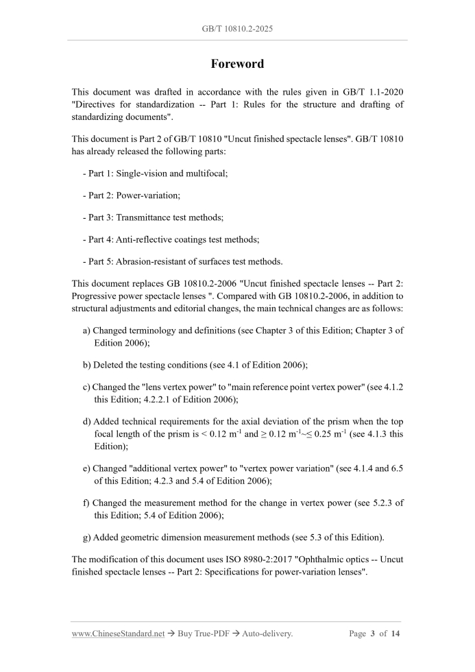 Similar standardsGB/T 10810.2-2025: Uncut finished spectacle lenses - Part 2: Power-variation---This is an excerpt. Full copy of true-PDF in English version (including equations, symbols, images, flow-chart, tables, and figures etc.), auto-downloaded/delivered in 9 seconds, can be purchased online: https://www.ChineseStandard.net/PDF.aspx/GBT10810.2-2025GB NATIONAL STANDARD OF THE PEOPLE’S REPUBLIC OF CHINA ICS 11.040.70 CCS Y 89 Replacing GB 108102-2006 Uncut finished spectacle lenses -- Part 2.Power-variation (ISO 8980-2.2017, Ophthalmic optics -- Uncut finished spectacle lenses -- Part 2.Specifications for power-variation lenses, MOD) Issued on: FEBRUARY 28, 2025 Implemented on: MARCH 01, 2026 Issued by. State Administration for Market Regulation; Standardization Administration of the People's Republic of China. Table of ContentsForeword... 3 Introduction... 6 1 Scope... 7 2 Normative references... 7 3 Terms and definitions... 7 4 Requirements... 8 4.1 Optical performance... 8 4.2 Geometric dimensions... 8 4.3 Material and surface quality... 9 5 Test methods... 9 5.1 Test conditions... 9 5.2 Optical performance... 9 5.3 Geometric dimensions... 10 5.4 Material and surface quality... 10 6 Labels... 11 6.1 Permanent labeling... 11 6.2 Non-permanent selective labeling... 11 7 Marks... 11 Annex A (informative) Comparison on structural numbering between this document and ISO 8980-2.2017... 13 Annex B (informative) Schematic diagram of reference point positions for gradient lenses... 14ForewordThis document was drafted in accordance with the rules given in GB/T 1.1-2020 "Directives for standardization -- Part 1.Rules for the structure and drafting of standardizing documents". This document is Part 2 of GB/T 10810 "Uncut finished spectacle lenses". GB/T 10810 has already released the following parts. - Part 1.Single-vision and multifocal; - Part 2.Power-variation; - Part 3.Transmittance test methods; - Part 4.Anti-reflective coatings test methods; - Part 5.Abrasion-resistant of surfaces test methods. This document replaces GB 10810.2-2006 "Uncut finished spectacle lenses -- Part 2. Progressive power spectacle lenses ". Compared with GB 10810.2-2006, in addition to structural adjustments and editorial changes, the main technical changes are as follows. a) Changed terminology and definitions (see Chapter 3 of this Edition; Chapter 3 of Edition 2006); b) Deleted the testing conditions (see 4.1 of Edition 2006); c) Changed the "lens vertex power" to "main reference point vertex power" (see 4.1.2 this Edition; 4.2.2.1 of Edition 2006); d) Added technical requirements for the axial deviation of the prism when the top focal length of the prism is < 0.12 m-1 and ≥ 0.12 m-1~≤ 0.25 m-1 (see 4.1.3 this Edition); e) Changed "additional vertex power" to "vertex power variation" (see 4.1.4 and 6.5 of this Edition; 4.2.3 and 5.4 of Edition 2006); f) Changed the measurement method for the change in vertex power (see 5.2.3 of this Edition; 5.4 of Edition 2006); g) Added geometric dimension measurement methods (see 5.3 of this Edition). The modification of this document uses ISO 8980-2.2017 "Ophthalmic optics -- Uncut finished spectacle lenses -- Part 2.Specifications for power-variation lenses". Compared to ISO 8980-2.2017, this document has undergone significant structural adjustments. The comparison on structural numbering changes between two documents can be found in Annex A. The technical differences and reasons between this document and ISO 8980-2.2017 are as follows. - Replaced ISO 13666 with the normative reference GB/T 26397.Added terms and definitions for verification power (see Chapter 3) to adapt to China's technical conditions and increase operability; - Replace ISO 7944, ISO 8429, ISO 8598-1, ISO 8980-3, ISO 14889, and ISO 21987 (see 4.1.1~4.1.5, 5.2.1~5.2.4) with the normative reference GB 45184 to adapt to China's technical conditions and increase operability; - Deleted normative references to ISO 7944, ISO 8598-1, ISO 8429, ISO 8980-3, ISO 14889, and ISO 21987 (see Chapters 3, 5.2.1, 5.2.3, 5.4, and 8 of ISO 8980- 2.2017) to adapt to China's technical conditions and increase operability; - Deleted the classification, recommended temperature, axial deviation of polarizing lenses, and references in this document (see Chapters 4, 5.1, 5.4, and 9 of ISO 8980-2.2017) to adapt to the standard system of GB/T 10810; - Changed prism degree and prism substrate orientation (see 4.1.5, 5.2.5 and 5.2.6 of ISO 8980-2.2017) to adapt to the standard system of GB/T 10810; - Added prism base orientation (see 5.2.4) to adapt to China's technical conditions and increase operability; - Added geometric dimension testing methods (see 5.3) to adapt to China's technical conditions and increase operability; - Changed identification and information (see Chapter 7, Chapter 8 of ISO 8980- 2.2017) to adapt to the standard system of GB/T 10810. This document has undergone the following editorial changes. - To coordinate with the existing standards in China, the standard name is changed to "Uncut finished spectacle lenses -- Part 2.Power-variation"; - Added a schematic diagram of the position of each reference point for gradient lenses (see Annex B). Attention is drawn to the possibility that some of the elements of this document may be the subject of patent rights. The issuing authority shall not be held responsible for identifying any or all such patent rights. This document was proposed by China National Light Industry Council. Uncut finished spectacle lenses -- Part 2.Power-variation1 ScopeThis document specifies the requirements, markings, and symbols for gradient lenses. It describes the corresponding test methods. This document applies to uncut (ground) edge gradient lenses for glasses..2 Normative referencesThe following referenced documents are indispensable for the application of this document. For dated references, only the edition cited applies. For undated references, the latest edition of the referenced d