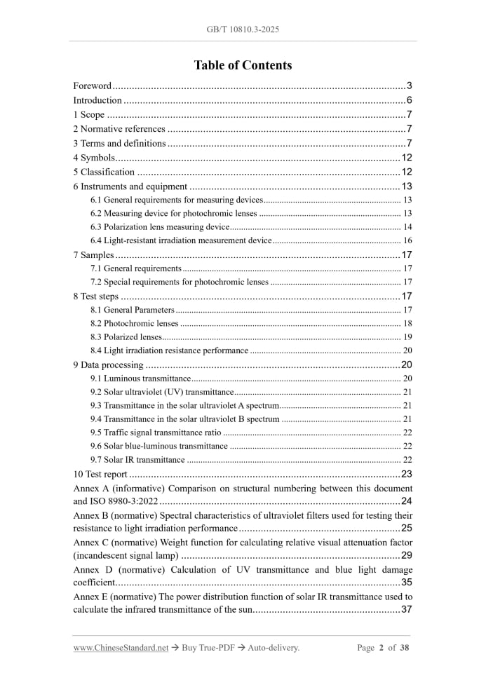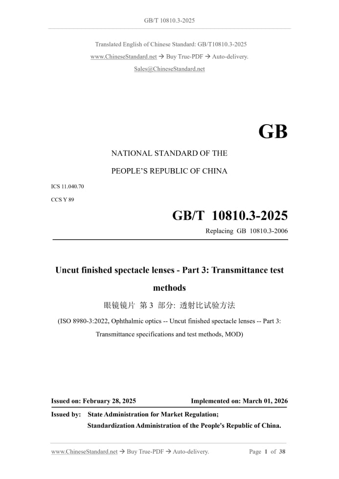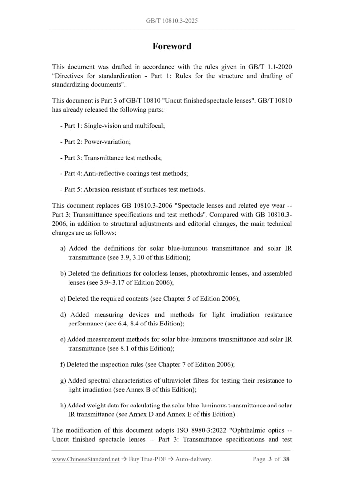 Similar standardsGB/T 10810.3-2025: Uncut finished spectacle lenses - Part 3: Transmittance test methods---This is an excerpt. Full copy of true-PDF in English version (including equations, symbols, images, flow-chart, tables, and figures etc.), auto-downloaded/delivered in 9 seconds, can be purchased online: https://www.ChineseStandard.net/PDF.aspx/GBT10810.3-2025GB NATIONAL STANDARD OF THE PEOPLE’S REPUBLIC OF CHINA ICS 11.040.70 CCS Y 89 Replacing GB 10810.3-2006 Uncut finished spectacle lenses - Part 3.Transmittance test methods (ISO 8980-3.2022, Ophthalmic optics -- Uncut finished spectacle lenses -- Part 3. Transmittance specifications and test methods, MOD) Issued on: FEBRUARY 28, 2025 Implemented on: MARCH 01, 2026 Issued by. State Administration for Market Regulation; Standardization Administration of the People's Republic of China. Table of ContentsForeword... 3 Introduction... 6 1 Scope... 7 2 Normative references... 7 3 Terms and definitions... 7 4 Symbols... 12 5 Classification... 12 6 Instruments and equipment... 13 6.1 General requirements for measuring devices... 13 6.2 Measuring device for photochromic lenses... 13 6.3 Polarization lens measuring device... 14 6.4 Light-resistant irradiation measurement device... 16 7 Samples... 17 7.1 General requirements... 17 7.2 Special requirements for photochromic lenses... 17 8 Test steps... 17 8.1 General Parameters... 17 8.2 Photochromic lenses... 18 8.3 Polarized lenses... 19 8.4 Light irradiation resistance performance... 20 9 Data processing... 20 9.1 Luminous transmittance... 20 9.2 Solar ultraviolet (UV) transmittance... 21 9.3 Transmittance in the solar ultraviolet A spectrum... 21 9.4 Transmittance in the solar ultraviolet B spectrum... 21 9.5 Traffic signal transmittance ratio... 22 9.6 Solar blue-luminous transmittance... 22 9.7 Solar IR transmittance... 22 10 Test report... 23 Annex A (informative) Comparison on structural numbering between this document and ISO 8980-3.2022... 24 Annex B (normative) Spectral characteristics of ultraviolet filters used for testing their resistance to light irradiation performance... 25 Annex C (normative) Weight function for calculating relative visual attenuation factor (incandescent signal lamp)... 29 Annex D (normative) Calculation of UV transmittance and blue light damage coefficient... 35 Annex E (normative) The power distribution function of solar IR transmittance used to calculate the infrared transmittance of the sun... 37ForewordThis document was drafted in accordance with the rules given in GB/T 1.1-2020 "Directives for standardization - Part 1.Rules for the structure and drafting of standardizing documents". This document is Part 3 of GB/T 10810 "Uncut finished spectacle lenses". GB/T 10810 has already released the following parts. - Part 1.Single-vision and multifocal; - Part 2.Power-variation; - Part 3.Transmittance test methods; - Part 4.Anti-reflective coatings test methods; - Part 5.Abrasion-resistant of surfaces test methods. This document replaces GB 10810.3-2006 "Spectacle lenses and related eye wear -- Part 3.Transmittance specifications and test methods". Compared with GB 10810.3- 2006, in addition to structural adjustments and editorial changes, the main technical changes are as follows. a) Added the definitions for solar blue-luminous transmittance and solar IR transmittance (see 3.9, 3.10 of this Edition); b) Deleted the definitions for colorless lenses, photochromic lenses, and assembled lenses (see 3.9~3.17 of Edition 2006); c) Deleted the required contents (see Chapter 5 of Edition 2006); d) Added measuring devices and methods for light irradiation resistance performance (see 6.4, 8.4 of this Edition); e) Added measurement methods for solar blue-luminous transmittance and solar IR transmittance (see 8.1 of this Edition); f) Deleted the inspection rules (see Chapter 7 of Edition 2006); g) Added spectral characteristics of ultraviolet filters for testing their resistance to light irradiation (see Annex B of this Edition); h) Added weight data for calculating the solar blue-luminous transmittance and solar IR transmittance (see Annex D and Annex E of this Edition). The modification of this document adopts ISO 8980-3.2022 "Ophthalmic optics -- Uncut finished spectacle lenses -- Part 3.Transmittance specifications and test methods". Compared with ISO 8980-3.2022, this document has more structural adjustments. See Annex A for a list of comparisons of structural numbers between two documents. The technical differences between this document and ISO 8980-3.2022 and their reasons are as follows. a) Deleted the normative references ISO 14889, ISO 11664-1, and ISO 11664-2 (see Chapter 1, 6.1, 7.3.1, 7.6.2.3, Table A.1, Table A.2 of ISO 8980-3.2022) to adapt to the Chinese standard system; b) Replaced ISO 13666 with the normative reference GB/T 26397.Changed the terms and definitions (see Chapter 3) to adapt to China's technical conditions and increased operability; c) Replaced ISO 11664-1 with the normative reference GB/T 3978 (see 3.2, 3.6, 6.3.2) to adapt to China's technical conditions and increased operability; d) Replaced ISO 11664-2 with the normative reference GB/T 20147 (see 6.3.2) to adapt to China's technical conditions and increase operability; e) Deleted the content of the technical requirements (see Chapter 6 of ISO 8980- 3.2022) to adapt to the Chinese standard system. Its content is stipulated in relevant product standards; f) Changed the general requirements for measuring devices. Added the normative reference JJF 1106 (see 6.1; 7.1, 7.2 of ISO 8980-3.2022) to adapt to China's technical conditions and increase operability; g) Added the measurement method of solar blue-luminous transmittance and solar IR transmittance (see 9.6, 9.7) to adapt to China's technical conditions and increased operability; h) Deleted the content of the logo (see Chapter 8 of ISO 8980-3.2022) to adapt to the Chinese standard system. Its content is stipulated in relevant product st