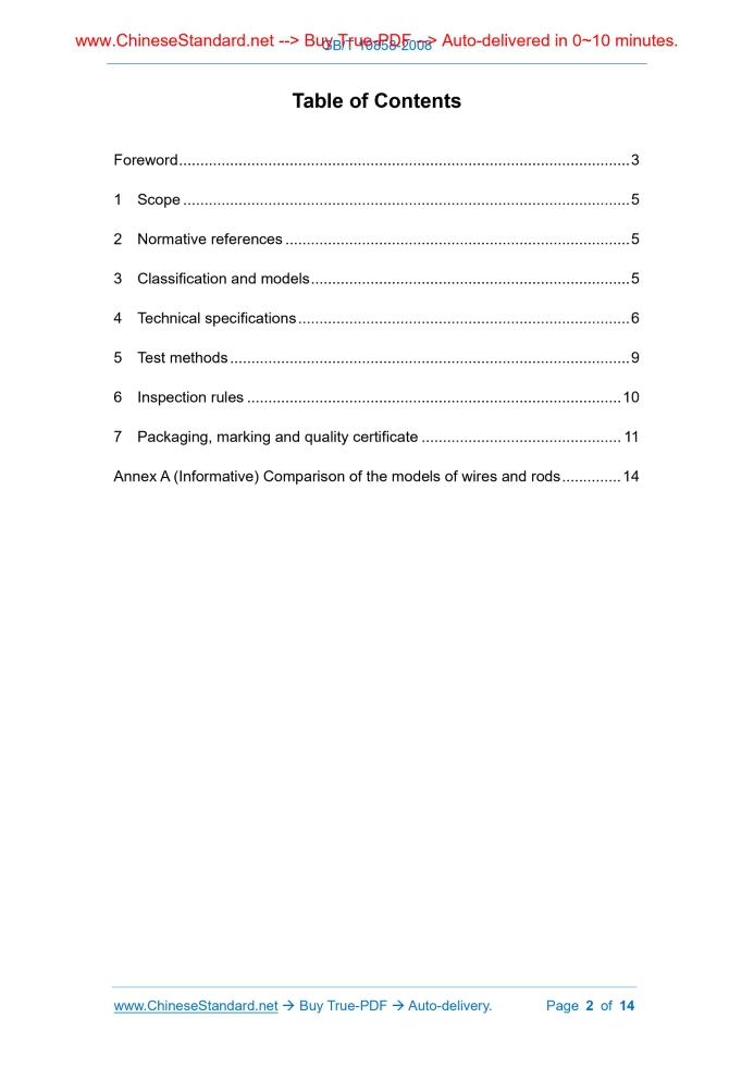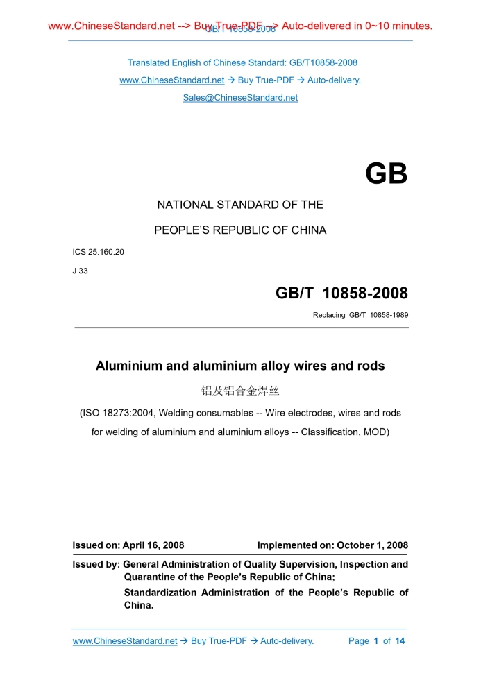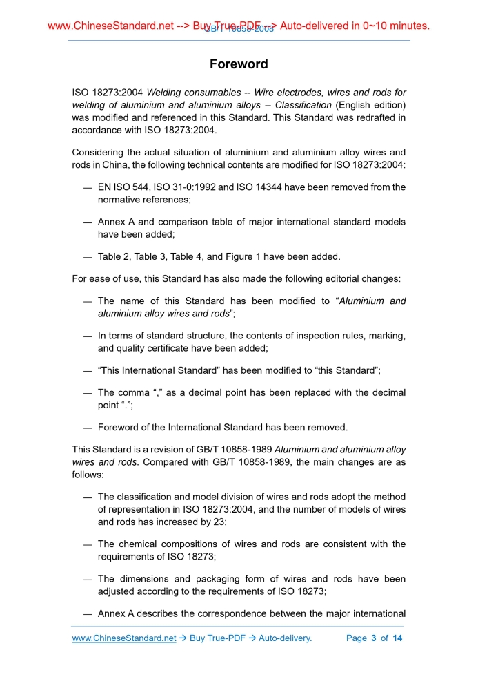 Similar standardsGB/T 10858-2008: Aluminium and aluminium alloy wires and rods---This is an excerpt. Full copy of true-PDF in English version (including equations, symbols, images, flow-chart, tables, and figures etc.), auto-downloaded/delivered in 9 seconds, can be purchased online: https://www.ChineseStandard.net/PDF.aspx/GBT10858-2008GB NATIONAL STANDARD OF THE PEOPLE’S REPUBLIC OF CHINA ICS 25.160.20 J 33 Replacing GB/T 10858-1989 Aluminium and aluminium alloy wires and rods (ISO 18273.2004, Welding consumables -- Wire electrodes, wires and rods for welding of aluminium and aluminium alloys -- Classification, MOD) Issued on: APRIL 16, 2008 Implemented on: OCTOBER 1, 2008 Issued by. General Administration of Quality Supervision, Inspection and Quarantine of the People’s Republic of China; Standardization Administration of the People’s Republic of China. Table of ContentsForeword... 3 1 Scope... 5 2 Normative references... 5 3 Classification and models... 5 4 Technical specifications... 6 5 Test methods... 9 6 Inspection rules... 10 7 Packaging, marking and quality certificate... 11 Annex A (Informative) Comparison of the models of wires and rods... 14ForewordISO 18273.2004 Welding consumables -- Wire electrodes, wires and rods for welding of aluminium and aluminium alloys -- Classification (English edition) was modified and referenced in this Standard. This Standard was redrafted in accordance with ISO 18273.2004. Considering the actual situation of aluminium and aluminium alloy wires and rods in China, the following technical contents are modified for ISO 18273.2004. — EN ISO 544, ISO 31-0.1992 and ISO 14344 have been removed from the normative references; — Annex A and comparison table of major international standard models have been added; — Table 2, Table 3, Table 4, and Figure 1 have been added. For ease of use, this Standard has also made the following editorial changes. — The name of this Standard has been modified to “Aluminium and aluminium alloy wires and rods”; — In terms of standard structure, the contents of inspection rules, marking, and quality certificate have been added; — “This International Standard” has been modified to “this Standard”; — The comma “,” as a decimal point has been replaced with the decimal point “.”; — Foreword of the International Standard has been removed. This Standard is a revision of GB/T 10858-1989 Aluminium and aluminium alloy wires and rods. Compared with GB/T 10858-1989, the main changes are as follows. — The classification and model division of wires and rods adopt the method of representation in ISO 18273.2004, and the number of models of wires and rods has increased by 23; — The chemical compositions of wires and rods are consistent with the requirements of ISO 18273; — The dimensions and packaging form of wires and rods have been adjusted according to the requirements of ISO 18273; — Annex A describes the correspondence between the major international Aluminium and aluminium alloy wires and rods1 ScopeThis Standard specifies the classification and models, technical specifications, test methods, inspection rules, packaging, marking and quality certificate of wire electrodes, wires and rods for welding of aluminium and aluminium alloys. This Standard applies to the wire electrodes, wires and rods for welding of aluminium and aluminium alloys (hereinafter referred to as “wires and rods”) for gas metal arc welding, gas tungsten arc welding, gas welding, and plasma arc welding.2 Normative referencesThe provisions in the following documents become the provisions of this Standard through reference in this Standard. For dated references, the subsequent amendments (excluding corrections) or revisions do not apply to this Standard. However, parties who reach an agreement based on this Standard are encouraged to study if the latest editions of these documents are applicable. For undated references, the latest editions apply to this Standard. GB/T 6987 (all Parts) Methods for chemical analysis of aluminum and aluminum alloys3 Classification and models3.1 Classification of wires and rods The wires and rods are classified into five categories in accordance with their chemical compositions, namely aluminum (Al), aluminum copper (AlCu), aluminum manganese (AlMn), aluminum silicon (AlSi), and aluminum magnesium (AlMg). 3.2 Model division The models of wires and rods are divided in accordance with the chemical compositions (SEE Table 1). 3.3 Model preparation method Each model of wires and rods consists of three parts. The first part is the letters shall be taken from the raw materials of the finished wires and rods or the manufactured products. During the arbitration test, samples shall be taken from the finished wires and rods. 5.1.2 The chemical compositions of wires and rods can be analyzed by any suitable method. The arbitration test shall be carried out in accordance with GB/T 6987. 5.2 Dimensions and surface quality 5.2.1 USE a measuring tool with a precision of 0.01mm for dimension inspection of wires and rods. According to the requirements of Table 2 and Table 3, PERFORM the measurements in the direction perpendicular to each other on the same cross-section. There shall be no less than two measuring positions. 5.2.2 The surface quality of wires and rods shall comply with the requirements of 4.3.PERFORM visual inspection on any part of the wires and rods.6 Inspection rulesThe finished wires and rods are inspected by the quality inspection department of the manufacturer in batches. 6.1 Batch division Each batch of wires and rods shall consist of the wires and rods of the same furnace number, the same shape, the same dimensions, and the same delivery state. The maximum mass of each batch of wires and rods shall not exceed 10t. 6.2 Sampling method SELECT 3% of wires and rods in reels (coils) per batch in accordance with the number of reels (coils), but not less than two reels (coils); and EXTRACT