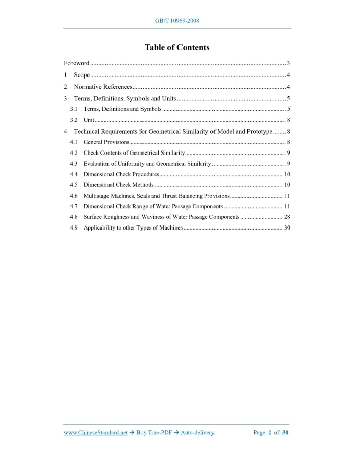 Similar standardsGB/T 10969-2008: Specification for water passage components of hydraulic turbines, storage pumps and pump-turbines---This is an excerpt. Full copy of true-PDF in English version (including equations, symbols, images, flow-chart, tables, and figures etc.), auto-downloaded/delivered in 9 seconds, can be purchased online: https://www.ChineseStandard.net/PDF.aspx/GBT10969-2008 GB NATIONAL STANDARD OF THE PEOPLE’S REPUBLIC OF CHINA ICS 27.140 K 55 Replacing GB/T 10969-1996 Specification for Water Passage Components of Hydraulic Turbines, Storage Pumps and Pump-turbines ISSUED ON: JUNE 30, 2008 IMPLEMENTED ON: APRIL 1, 2009 Issued by: General Administration for Quality Supervision, Inspection and Quarantine; Standardization Administration of PRC. Table of ContentsForeword ... 3 1 Scope ... 4 2 Normative References ... 4 3 Terms, Definitions, Symbols and Units ... 5 3.1 Terms, Definitions and Symbols ... 5 3.2 Unit ... 8 4 Technical Requirements for Geometrical Similarity of Model and Prototype ... 8 4.1 General Provisions... 8 4.2 Check Contents of Geometrical Similarity ... 9 4.3 Evaluation of Uniformity and Geometrical Similarity ... 9 4.4 Dimensional Check Procedures ... 10 4.5 Dimensional Check Methods ... 10 4.6 Multistage Machines, Seals and Thrust Balancing Provisions ... 11 4.7 Dimensional Check Range of Water Passage Components ... 11 4.8 Surface Roughness and Waviness of Water Passage Components ... 28 4.9 Applicability to other Types of Machines ... 30 Specification for Water Passage Components of Hydraulic Turbines, Storage Pumps and Pump-Turbines1 ScopeThis standard only specifies the control dimension accuracy of water passage components of hydraulic turbines, storage pumps and pump-turbines that are influential to the hydraulic performance as well as the surface quality of water passage components in the aspect of the requirements in prototype hydraulic turbine having geometrical similarity with the model. This standard is applicable to the model and prototype hydraulic turbines, storage pumps and pump-turbines meeting one of the following conditions: a) Whose power is 10MW and the above; b) Radial flow machines, whose runner nominal diameter is 1.0m and the above; c) Axial flow, tubular and diagonal machines, whose runner nominal diameter is 3.3m and the above; d) Centrifugal storage pumps, whose runner nominal diameter is 1.0m and the above; e) Impulse turbines, whose runner nominal diameter is 1.0m and the above. Prototype hydraulic turbines, storage pumps and pump-turbines whose dimension and capacity are less than the above conditions may refer to this standard.2 Normative ReferencesThe following standards contain provisions which, through reference in this text, constitute provisions of this standard. For dated reference, subsequent amendments to (excluding correction to), or revisions of, any of these publications do not apply. However, the parties to agreements based on this standard are encouraged to investigate the possibility of applying the most recent editions of the standards. For undated references, the latest edition of the normative document referred to applies. GB/T 2900.45 Electrotechnical terminology - Hydroelectric powerplant machinery (GB/T 2900.45-2006, IEC/TR 61364:1999, MOD) GB/T 8564-2003 Specification installation of hydraulic turbine generator units GB/T 15468-2006 Fundamental technical requirements for hydraulic turbines Figure 2 -- Definition of waviness and surface roughness 3.1.10 Surface roughness Surface roughness is the characteristic quality of the surface. Generally speaking, it is characterized by the arithmetical average tolerance of staggered profiles produced by the cutting action of tool edges, abrasive grains, feed of the machine, coating and painting or originally produced by the fabrication (welding) process, as shown in Figure 2. Symbol: Ra Unit: μm 3.1.11 Water passage components As for the types of machines stated in this standard, they refer to the components with main water flow passing from diversion component inlet to drainage component outlet. 3.2 Unit The international system of units (SI) and China statutory measurement units have been used throughout this standard.4 Technical Requirements for Geometrical Similarity ofModel and Prototype 4.1 General Provisions A basic requirement for determining prototype performance is to have geometrical similarity between model and prototype. Where the dimension tolerance of model meets the requirements of this standard, the measured average values may be replaced by the theoretical values. Where the prototype is heterogenic to the model, an agreement shall be reached between the supplier and the purchaser whether the model efficiency is to be corrected or not through technology demonstration or individual test. Water passage surface control dimension of water passage components shall not only meet the permissible tolerance specified in this standard, but also meet the structural coordination tolerance and the relevant requirements of GB 8564-2003. possible to determine if the uniformity requirement has been met. If the uniformity requirement is not fulfilled, the corresponding components shall be corrected or remanufactured. In the case where the tolerance between the average value and the theoretical value is outside the permissible uniformity tolerance, the theoretical values or the geometrical dimensions of the components shall be corrected. Where spot-checks are performed for the recurrent components, the individual values may be directly compared with the theoretical values. 4.3.2 Checking the geometrical similarity between prototype and model By comparing the corresponding average values of model and prototype and considering the permissible similarity tolerances as given by this standard, it can be determined whether the geometrical similarity requirement has been met. If the geometrical tolerances are greater than the similarity tolerances, further steps shall