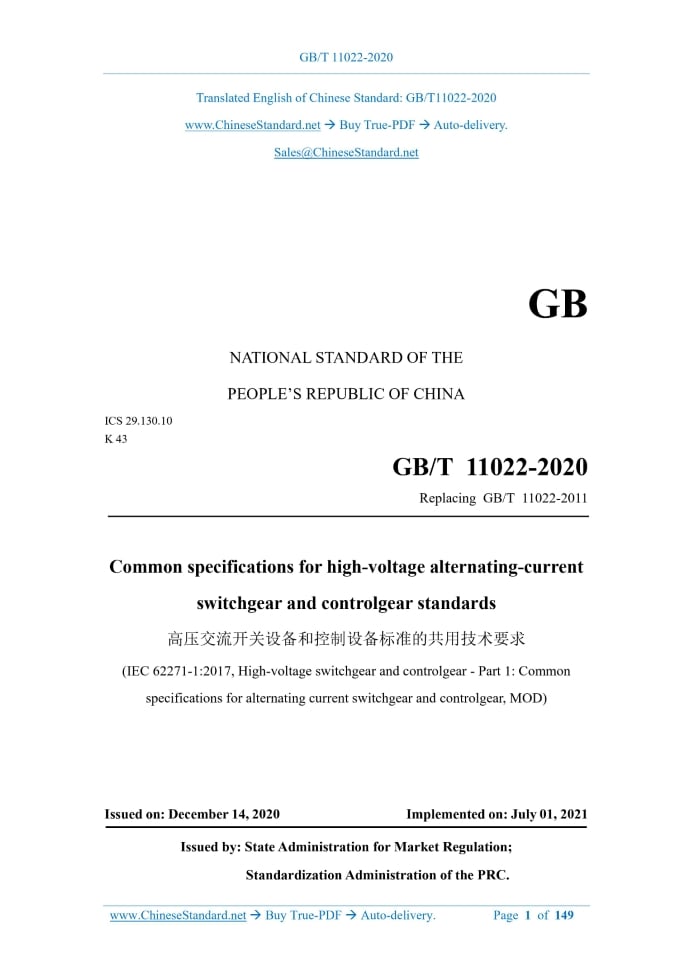 GB/T 11022-2020: Common specifications for high-voltage alternating-current switchgear and controlgear standards Delivery: 9 seconds. True-PDF full-copy in English & invoice will be downloaded + auto-delivered via email. See step-by-step procedure Status: Valid GB/T 11022: Historical versions