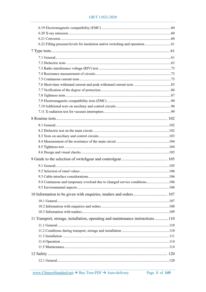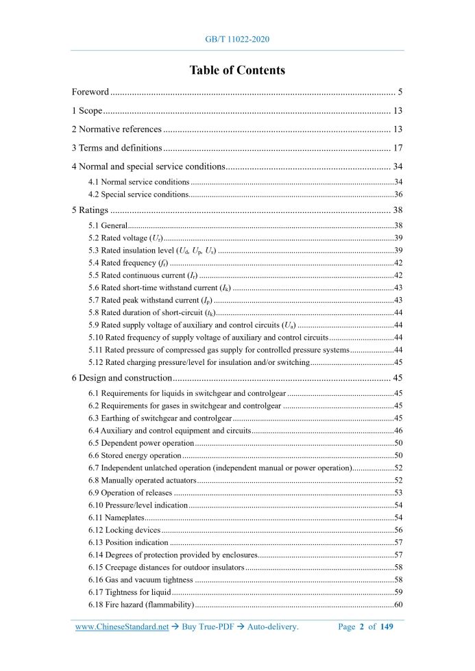 Similar standardsGB/T 11022-2020: Common specifications for high-voltage alternating-current switchgear and controlgear standards---This is an excerpt. Full copy of true-PDF in English version (including equations, symbols, images, flow-chart, tables, and figures etc.), auto-downloaded/delivered in 9 seconds, can be purchased online: https://www.ChineseStandard.net/PDF.aspx/GBT11022-2020 NATIONAL STANDARD OF THE PEOPLE’S REPUBLIC OF CHINA ICS 29.130.10 K 43 Replacing GB/T 11022-2011 Common specifications for high-voltage alternating-current switchgear and controlgear standards (IEC 62271-1.2017, High-voltage switchgear and controlgear - Part 1.Common specifications for alternating current switchgear and controlgear, MOD) Issued on. DECEMBER 14, 2020 Implemented on. JULY 01, 2021 Issued by. State Administration for Market Regulation; Standardization Administration of the PRC. Table of ContentsForeword... 5 1 Scope... 13 2 Normative references... 13 3 Terms and definitions... 17 4 Normal and special service conditions... 34 4.1 Normal service conditions... 34 4.2 Special service conditions... 36 5 Ratings... 38 5.1 General... 38 5.2 Rated voltage (Ur)... 39 5.3 Rated insulation level (Ud, Up, Us)... 39 5.4 Rated frequency (fr)... 42 5.5 Rated continuous current (Ir)... 42 5.6 Rated short-time withstand current (Ik)... 43 5.7 Rated peak withstand current (Ip)... 43 5.8 Rated duration of short-circuit (tk)... 44 5.9 Rated supply voltage of auxiliary and control circuits (Ua)... 44 5.10 Rated frequency of supply voltage of auxiliary and control circuits... 44 5.11 Rated pressure of compressed gas supply for controlled pressure systems... 44 5.12 Rated charging pressure/level for insulation and/or switching... 45 6 Design and construction... 45 6.1 Requirements for liquids in switchgear and controlgear... 45 6.2 Requirements for gases in switchgear and controlgear... 45 6.3 Earthing of switchgear and controlgear... 45 6.4 Auxiliary and control equipment and circuits... 46 6.5 Dependent power operation... 50 6.6 Stored energy operation... 50 6.7 Independent unlatched operation (independent manual or power operation)... 52 6.8 Manually operated actuators... 52 6.9 Operation of releases... 53 6.10 Pressure/level indication... 54 6.11 Nameplates... 54 6.12 Locking devices... 56 6.13 Position indication... 57 6.14 Degrees of protection provided by enclosures... 57 6.15 Creepage distances for outdoor insulators... 58 6.16 Gas and vacuum tightness... 58 6.17 Tightness for liquid... 59 6.18 Fire hazard (flammability)... 60 6.19 Electromagnetic compatibility (EMC)... 60 6.20 X-ray emission... 60 6.21 Corrosion... 60 6.22 Filling pressure/levels for insulation and/or switching and operation... 61 7 Type tests... 61 7.1 General... 61 7.2 Dielectric tests... 63 7.3 Radio interference voltage (RIV) test... 73 7.4 Resistance measurement of circuits... 73 7.5 Continuous current tests... 75 7.6 Short-time withstand current and peak withstand current tests... 83 7.7 Verification of the degree of protection... 86 7.8 Tightness tests... 87 7.9 Electromagnetic compatibility tests (EMC)... 90 7.10 Additional tests on auxiliary and control circuits... 96 7.11 X-radiation test for vacuum interrupters... 99 8 Routine tests... 102 8.1 General... 102 8.2 Dielectric test on the main circuit... 102 8.3 Tests on auxiliary and control circuits... 103 8.4 Measurement of the resistance of the main circuit... 104 8.5 Tightness test... 104 8.6 Design and visual checks... 105 9 Guide to the selection of switchgear and controlgear... 105 9.1 General... 105 9.2 Selection of rated values... 106 9.3 Cable-interface considerations... 106 9.4 Continuous and temporary overload due to changed service conditions... 106 9.5 Environmental aspects... 106 10 Information to be given with enquiries, tenders and orders... 107 10.1 General... 107 10.2 Information with enquiries and orders... 108 10.3 Information with tenders... 109 11 Transport, storage, installation, operating and maintenance instructions... 110 11.1 General... 110 11.2 Conditions during transport, storage and installation... 110 11.3 Installation... 111 11.4 Operation... 114 11.5 Maintenance... 114 12 Safety... 120 12.1 General... 120 12.2 Precautions by manufacturers... 120 12.3 Precautions by users... 121 13 Influence of the product on the environment... 122 Annex A (Informative) Pollution level and minimum nominal unified specific creepage distance of external insulation of switchgear... 123 Annex B (Informative) References for auxiliary and control circuit components... 125 Annex C (Informative) List of symbols... 127 Annex D (Normative) Method for the weatherproofing test for outdoor switchgear and controlgear... 128 Annex E (Normative) Tolerances on test quantities during tests... 131 Annex F (Informative) Extension of validity of type tests... 134 Annex G (Normative) Identification of test objects... 136 Annex H (Normative) Determination of the equivalent RMS value of a short-time withstand current during a short-circuit of a given duration... 139 Annex I (Informative) Information and technical requirements to be given with enquiries, tenders and orders... 141 Annex J (Informative) Electromagnetic compatibility site measurements... 144 Bibliography... 146ForewordThis Standard is drafted in accordance with the rules given in GB/T 1.1-2009. This Standard replaces GB/T 11022-2011 "Common specifications for high-voltage switchgear and controlgear standards". Compared with GB/T 11022-2011, the main technical changes are as follows. - Revise the previous Clause 1 "Overview" to Clause 1 "Scope" and Clause 2 "Normative references"; revise the "Scope" (see Clause 1 and Clause 2; Clause 1 of the 2011 edition); - Add the terms "Internal insulation", "Site pollution severity (SPS) class", "Highest voltage for equipment", "Supply voltage (of auxiliary and control circuits)" and "Thermal time constant" (see Clause 3); - Adjust "Normal and special service conditions" to Clause 4 (s