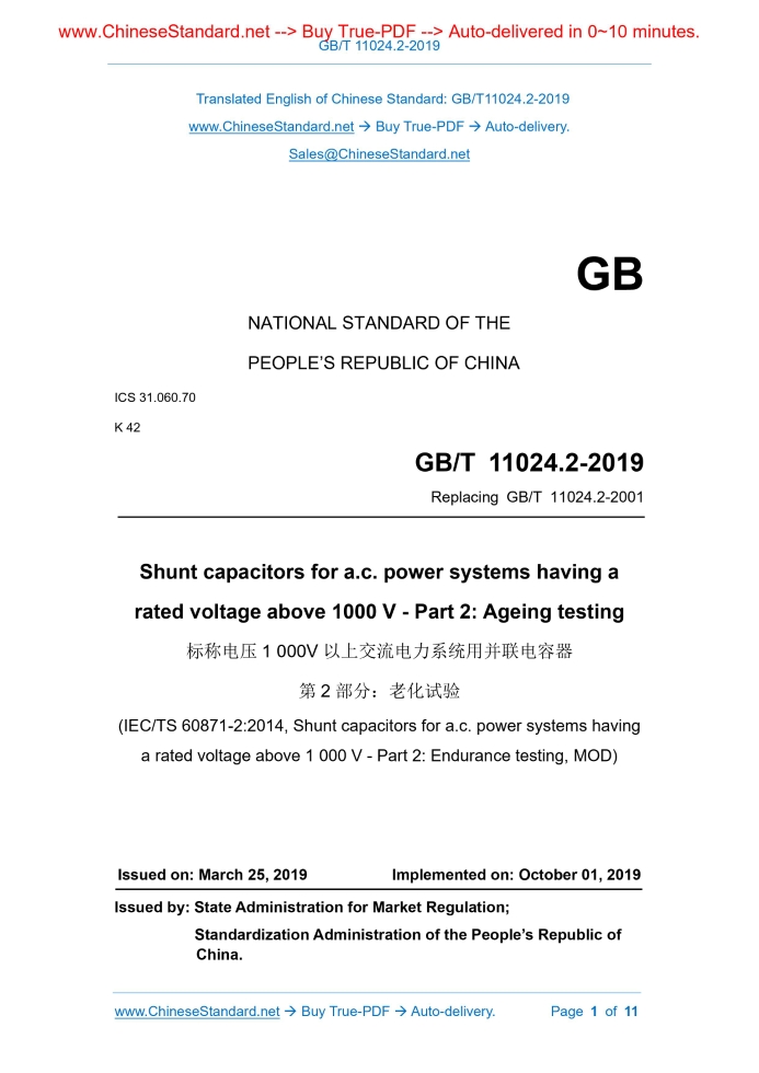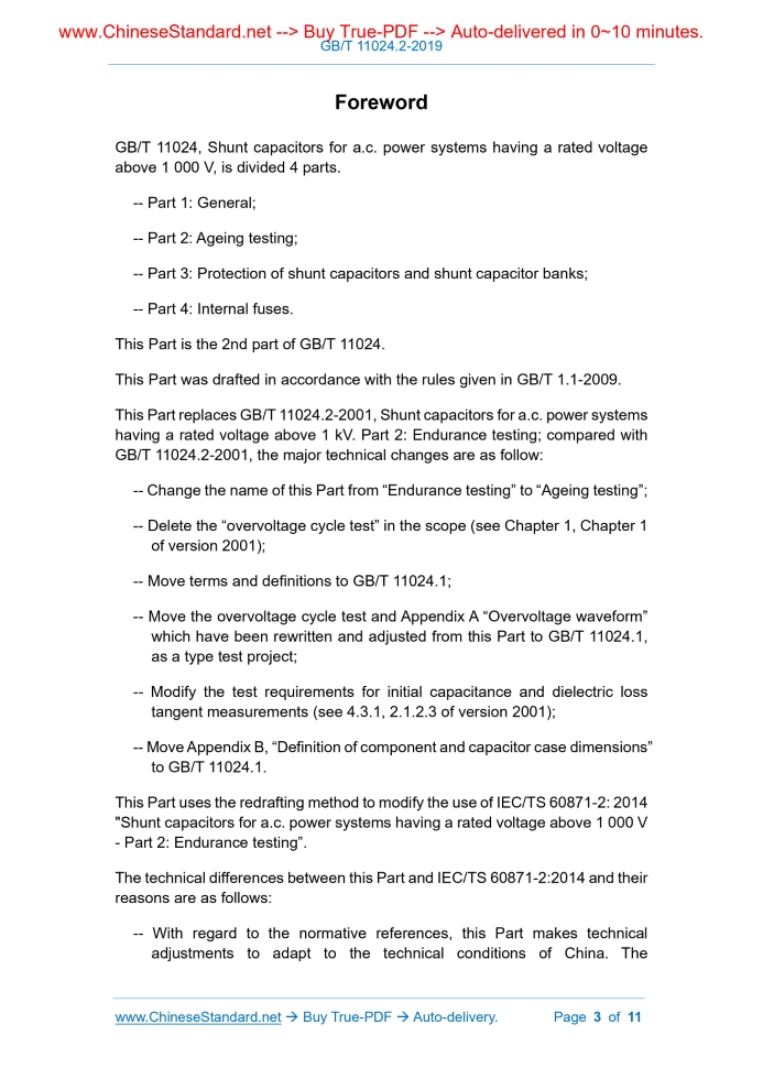 Similar standardsGB/T 11024.2-2019: Shunt capacitors for a.c. power systems having a rated voltage above 1 000 V -- Part 2: Ageing testing---This is an excerpt. Full copy of true-PDF in English version (including equations, symbols, images, flow-chart, tables, and figures etc.), auto-downloaded/delivered in 9 seconds, can be purchased online: https://www.ChineseStandard.net/PDF.aspx/GBT11024.2-2019 NATIONAL STANDARD OF THE PEOPLE’S REPUBLIC OF CHINA ICS 31.060.70 K 42 Replacing GB/T 11024.2-2001 Shunt capacitors for a.c. power systems having a rated voltage above 1000 V - Part 2: Ageing testing (IEC/TS 60871-2:2014, Shunt capacitors for a.c. power systems having a rated voltage above 1 000 V - Part 2: Endurance testing, MOD) ISSUED ON: MARCH 25, 2019 IMPLEMENTED ON: OCTOBER 01, 2019 Issued by: State Administration for Market Regulation; Standardization Administration of the People’s Republic of China. Table of ContentsForeword ... 3 1 Scope ... 6 2 Normative references ... 6 3 Terms and definitions ... 6 4 Quality requirements and tests ... 6 Appendix A (Normative) Comparable component design and test unit design requirements ... 9ForewordGB/T 11024, Shunt capacitors for a.c. power systems having a rated voltage above 1 000 V, is divided 4 parts. -- Part 1: General; -- Part 2: Ageing testing; -- Part 3: Protection of shunt capacitors and shunt capacitor banks; -- Part 4: Internal fuses. This Part is the 2nd part of GB/T 11024. This Part was drafted in accordance with the rules given in GB/T 1.1-2009. This Part replaces GB/T 11024.2-2001, Shunt capacitors for a.c. power systems having a rated voltage above 1 kV. Part 2: Endurance testing; compared with GB/T 11024.2-2001, the major technical changes are as follow: -- Change the name of this Part from “Endurance testing” to “Ageing testing”; -- Delete the “overvoltage cycle test” in the scope (see Chapter 1, Chapter 1 of version 2001); -- Move terms and definitions to GB/T 11024.1; -- Move the overvoltage cycle test and Appendix A “Overvoltage waveform” which have been rewritten and adjusted from this Part to GB/T 11024.1, as a type test project; -- Modify the test requirements for initial capacitance and dielectric loss tangent measurements (see 4.3.1, 2.1.2.3 of version 2001); -- Move Appendix B, “Definition of component and capacitor case dimensions” to GB/T 11024.1. This Part uses the redrafting method to modify the use of IEC/TS 60871-2: 2014 "Shunt capacitors for a.c. power systems having a rated voltage above 1 000 V - Part 2: Endurance testing”. The technical differences between this Part and IEC/TS 60871-2:2014 and their reasons are as follows: -- With regard to the normative references, this Part makes technical adjustments to adapt to the technical conditions of China. The Shunt capacitors for a.c. power systems having a rated voltage above 1 000 V - Part 2: Ageing testing1 ScopeThis Part of GB/T 11024 specifies the requirements for the ageing testing of shunt capacitors for a.c. power systems having a rated voltage above 1 000 V. This Part applies to capacitors in accordance with GB/T 11024.1.2 Normative referencesThe following documents are indispensable for the application of this document. For dated references, only the dated version applies to this document. For undated references, the latest edition (including all amendments) applies to this document. GB/T 11024.1-2019, Shunt capacitors for a.c. power systems having a rated voltage above 1000V. Part 1: General (IEC 60871-1:2014, MOD) JB/T 8957-1999, Method for verifying accuracy of tau delta measurements applicable to capacitors (idtIEC60996:1989)3 Terms and definitionsTerms and definitions determined by GB/T 11024.1-2019 are applicable to this document.4 Quality requirements and tests4.1 Test requirements and overall objectives The ageing testing is a special test to verify that the ageing degree that is caused by increasing test voltage at the rising temperatures does not cause premature breakdown of the dielectric. It is a means to ensure that the base material is properly selected and that it does not undergo any rapid ageing. This test should not be considered as a tool to make any accurate assessment of the dielectric life characteristics. To this end, manufacturers shall pay attention to various types of research and development activities. The ageing testing shall be performed as a special test by the manufacturer for a particular dielectric system, i.e. not for capacitors of each specific rated value. f) the length of the component (effective aluminum foil width) is allowed to vary within 50% ~ 400%; the unfolded length of the component (effective aluminum foil length) is allowed to vary within 30% ~ 300%. A.2 Test unit design If the following requirements are met, the test unit is considered to be comparable to the production unit: a) components that meet the requirements of A.1 shall be assembled in the same manner as the production unit; the insulation between the components shall be the same or thinner; the components shall be pressed in the same manner; the compression factor shall be within the manufacturing tolerance. b) the number of connected test unit components shall be not less than 4, so that the capacity under rated voltage (50 Hz) is not less than 100 kvar. All connected components shall be placed next to each other. Note 1: The connected components can be connected in series and in parallel in any way to suit the test equipment. c) the connections outside the test components can be enlarged, so as to cope with the increase in current that is caused by the parallel connection of some components. d) the thickness of the insulation-to-case shall be the same or thicker. Note 2: This requirement is to ensure that the drying and dipping conditions are the same as those of the production unit. The electrical resistance requirements of the insulation-to-case are tested in accordance with the tests in Chapters 10 and 15 of GB/T 1102