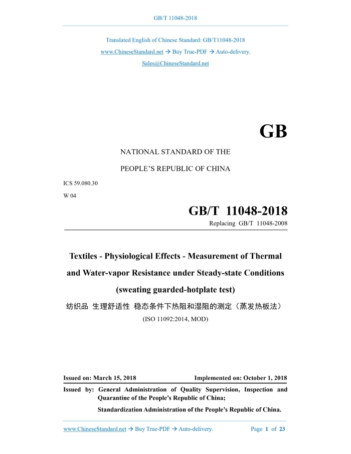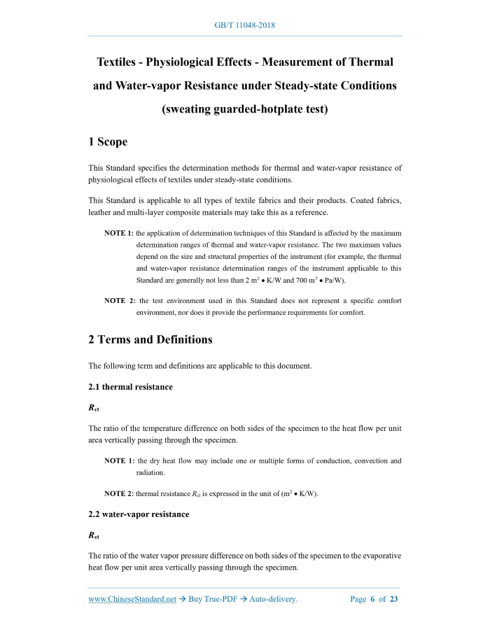 GB/T 11048-2018: Textiles -- Physiological effects -- Measurement of thermal and water-vapour resistance under steady-state conditions (sweating guarded-hotplate test) Delivery: 9 seconds. True-PDF full-copy in English & invoice will be downloaded + auto-delivered via email. See step-by-step procedure Status: Valid GB/T 11048: Historical versions