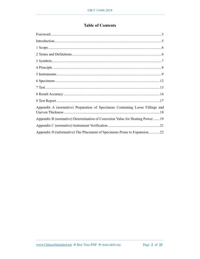 Similar standardsGB/T 11048-2018: Textiles -- Physiological effects -- Measurement of thermal and water-vapour resistance under steady-state conditions (sweating guarded-hotplate test)---This is an excerpt. Full copy of true-PDF in English version (including equations, symbols, images, flow-chart, tables, and figures etc.), auto-downloaded/delivered in 9 seconds, can be purchased online: https://www.ChineseStandard.net/PDF.aspx/GBT11048-2018 GB NATIONAL STANDARD OF THE PEOPLE’S REPUBLIC OF CHINA ICS 59.080.30 W 04 Replacing GB/T 11048-2008 Textiles - Physiological Effects - Measurement of Thermal and Water-vapor Resistance under Steady-state Conditions (sweating guarded-hotplate test) (ISO 11092.2014, MOD) Issued on: MARCH 15, 2018 Implemented on: OCTOBER 1, 2018 Issued by. General Administration of Quality Supervision, Inspection and Quarantine of the People’s Republic of China; Standardization Administration of the People’s Republic of China. Table of ContentsForeword... 3 Introduction... 5 1 Scope... 6 2 Terms and Definitions... 6 3 Symbols... 7 4 Principle... 8 5 Instruments... 9 6 Specimens... 12 7 Test... 13 8 Result Accuracy... 16 9 Test Report... 17 Appendix A (normative) Preparation of Specimens Containing Loose Fillings and Uneven Thickness... 18 Appendix B (normative) Determination of Correction Value for Heating Power... 19 Appendix C (normative) Instrument Verification... 21 Appendix D (informative) The Placement of Specimens Prone to Expansion... 22 Textiles - Physiological Effects - Measurement of Thermal and Water-vapor Resistance under Steady-state Conditions (sweating guarded-hotplate test)1 ScopeThis Standard specifies the determination methods for thermal and water-vapor resistance of physiological effects of textiles under steady-state conditions. This Standard is applicable to all types of textile fabrics and their products. Coated fabrics, leather and multi-layer composite materials may take this as a reference. NOTE 1.the application of determination techniques of this Standard is affected by the maximum determination ranges of thermal and water-vapor resistance. The two maximum values depend on the size and structural properties of the instrument (for example, the thermal and water-vapor resistance determination ranges of the instrument applicable to this Standard are generally not less than 2 m2 K/W and 700 m2 Pa/W). NOTE 2.the test environment used in this Standard does not represent a specific comfort environment, nor does it provide the performance requirements for comfort.2 Terms and DefinitionsThe following term and definitions are applicable to this document. 2.1 thermal resistance Rct The ratio of the temperature difference on both sides of the specimen to the heat flow per unit area vertically passing through the specimen. NOTE 1.the dry heat flow may include one or multiple forms of conduction, convection and radiation. NOTE 2.thermal resistance Rct is expressed in the unit of (m2 K/W). 2.2 water-vapor resistance Ret The ratio of the water vapor pressure difference on both sides of the specimen to the evaporative heat flow per unit area vertically passing through the specimen. imt. water-vapor permeability index, dimensionless. Rct0.an instrument constant determined for the determination of thermal resistance Rct, expressed in m2 K/W. Ret0.an instrument constant determined for the determination of water-vapor resistance Ret, expressed in m2 Pa/W. Wd. water-vapor permeability, expressed in g/(m2 h Pa). Tm. latent heat of saturated water vapor when the surface temperature of the test plate is Tm, expressed in W h/g. A. area of the test plate, expressed in m2. Ta. air temperature in the climate chamber, expressed in C. Tm. temperature of the test plate, expressed in C. Ts. temperature of the thermal retainer, expressed in C. pa. water vapor pressure (when the temperature in the climate chamber is Ta), expressed in Pa. pm. saturated water vapor pressure (when the surface temperature of the test plate is Tm), expressed in Pa. va. flow velocity of the air above the surface of the specimen under test, expressed in m/s. sv. standard deviation of air flow velocity va, expressed in m/s. R.H.. relative humidity, expressed in %. H. heating power provided to the test plate, expressed in W. Hc. correction amount of heating power in thermal resistance determination. He. correction amount of heating power in water-vapor resistance determination. . slope of the correction amount curve for the calculated result of Hc. . slope of the correction amount curve for the calculated result of He.4 PrincipleUse the specimen to cover the test plate. The test plate, the surrounding thermal retainer, and the protective plate at the bottom can maintain a constant temperature, so that the heat of the test plate can only be dissipated through the specimen, and the air can flow parallel to the upper surface of the specimen. After the test conditions stabilize, determine the heat flow through the specimen, so as to calculate the thermal resistance of the specimen. The method described in this Standard is to obtain the thermal resistance value Rct of the determined material by subtracting the thermal resistance value of the air layer from the thermal resistance value of the determined specimen plus the air layer. Both determinations are performed under identical conditions. For the determination of water-vapor resistance, the porous test plate needs to be covered with a breathable but water-impermeable film. The water entering the test plate evaporates, then, passes through the film in the form of water vapor, so no liquid water contacts the specimen. After the specimen is placed on the film, determine the heat flow required to maintain a constant temperature of the test plate under a certain water evaporation rate, and calculate the water- vapor resistance of the specimen together with the water vapor pressure passing through the specimen. The method described in this Standard is t