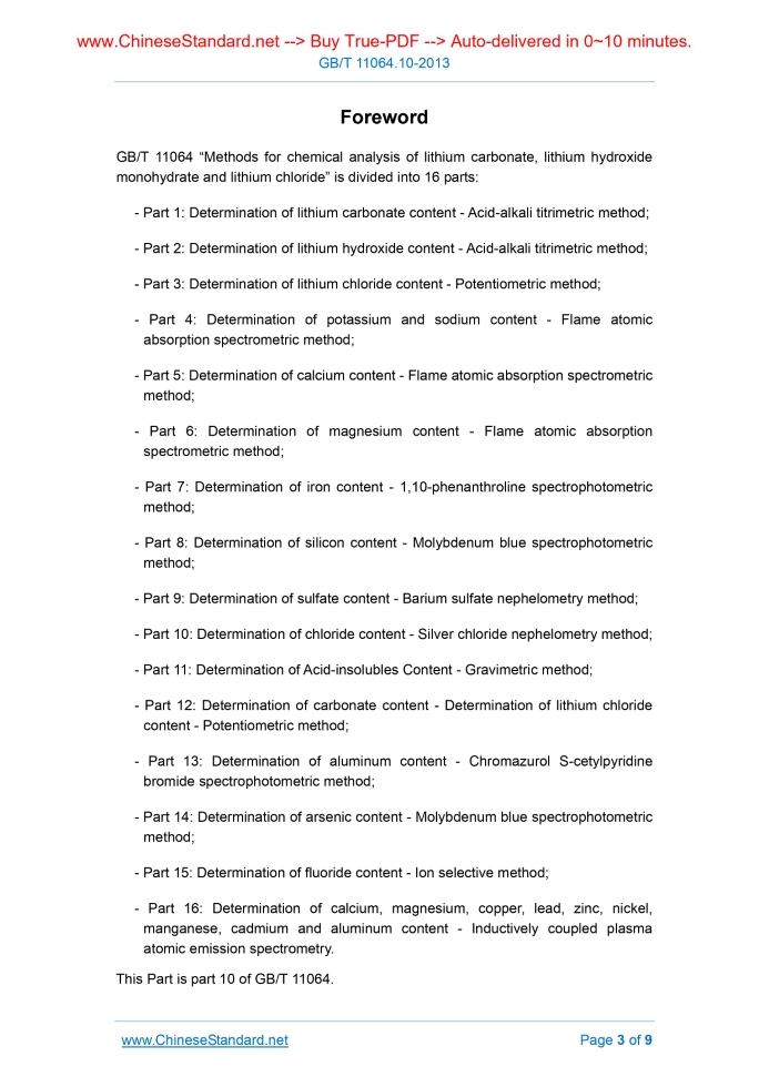 Similar standardsGB/T 11064.10-2013: Methods for chemical analysis of lithium carbonate, lithium hydroxide monohydrate and lithium chloride -- Part 10: Determination of chloride content -- Silver chloride nephelometry method---This is an excerpt. Full copy of true-PDF in English version (including equations, symbols, images, flow-chart, tables, and figures etc.), auto-downloaded/delivered in 9 seconds, can be purchased online: https://www.ChineseStandard.net/PDF.aspx/GBT11064.10-2013 GB NATIONAL STANDARD OF THE PEOPLE’S REPUBLIC OF CHINA ICS 77.120.99 H 64 Replacing GB/T 11064.10-1989 Methods for chemical analysis of lithium carbonate, lithium hydroxide monohydrate and lithium chloride - Part 10.Determination of chloride content - Silver chloride nephelometry method Issued on. NOVEMBER 27, 2013 Implemented on. AUGUST 01, 2014 Issued by. General Administration of Quality Supervision, Inspection and Quarantine of the People’s Republic of China; Standardization Administration of the People’s Republic of China. Table of ContentsForeword... 3 1 Scope... 5 2 Method Summary... 5 3 Reagents... 5 4 Instrumentation... 6 5 Samples... 6 6 Analysis Steps... 6 7 Calculation of Analysis Results... 7 8 Precision... 8 9 Test report... 8ForewordGB/T 11064 “Methods for chemical analysis of lithium carbonate, lithium hydroxide monohydrate and lithium chloride” is divided into 16 parts. - Part 1.Determination of lithium carbonate content - Acid-alkali titrimetric method; - Part 2.Determination of lithium hydroxide content - Acid-alkali titrimetric method; - Part 3.Determination of lithium chloride content - Potentiometric method; - Part 4.Determination of potassium and sodium content - Flame atomic absorption spectrometric method; - Part 5.Determination of calcium content - Flame atomic absorption spectrometric method; - Part 6.Determination of magnesium content - Flame atomic absorption spectrometric method; - Part 7.Determination of iron content - 1,10-phenanthroline spectrophotometric method; - Part 8.Determination of silicon content - Molybdenum blue spectrophotometric method; - Part 9.Determination of sulfate content - Barium sulfate nephelometry method; - Part 10.Determination of chloride content - Silver chloride nephelometry method; - Part 11.Determination of Acid-insolubles Content - Gravimetric method; - Part 12.Determination of carbonate content - Determination of lithium chloride content - Potentiometric method; - Part 13.Determination of aluminum content - Chromazurol S-cetylpyridine bromide spectrophotometric method; - Part 14.Determination of arsenic content - Molybdenum blue spectrophotometric method; - Part 15.Determination of fluoride content - Ion selective method; - Part 16.Determination of calcium, magnesium, copper, lead, zinc, nickel, manganese, cadmium and aluminum content - Inductively coupled plasma atomic emission spectrometry. This Part is part 10 of GB/T 11064. This Part is drafted in accordance with rules given in GB/T 1.1-2009. The Part replaces GB/T 11064.10-1989 "Lithium carbonate and lithium hydroxide monohydrate - Determination of chloride content - Mercurimetric method". Compared with GB/T 11064.10-1989, the main changes of this Part are as follows. - ADD the repeatability terms; - RE-EDIT the text format; ADD the test report. This Part shall be under the jurisdiction of National Standardization Technical Committee of Nonferrous Metals (SAC/TC 243). Drafting organizations of this Part. Xinjiang Research Institute of Non ferrous Metals, Ganzhou Non-ferrous Metallurgy Research Institute, and Sichuan Tianqi Lithium Industries Co., Ltd. The main drafters of this Part. Guan Yuzhen, Kang Zeyan, Ye Chunsheng, Yang Feng, Liu Hong, Gou Haixia, Luo Yuping, and Zhang Xianghong. The historical version replaced by this Part is as follows. - GB/T 11064.10-1989. Methods for chemical analysis of lithium carbonate, lithium hydroxide monohydrate and lithium chloride - Part 10.Determination of chloride content - Silver chloride nephelometry method This Part of GB/T 11064 specifies the determination method of chloride content in lithium carbonate, in lithium hydroxide monohydrate, and in lithium chloride. This Part applies to the determination of chloride content in lithium carbonate, in lithium hydroxide monohydrate, and in lithium chloride. The determination range. 0.0010%~0.10%. In nitric acid media, chloride ions and silver ions produce insoluble silver chloride. During a certain period of time, the silver chloride appears in suspension. Determine its absorbance at the 420nm wavelength of a spectrophotometer; obtain the chlorine content. Unless otherwise specified, the reagent used in this Part is guaranteed reagent, and the water used in this Part is the secondary deionized water. 3.1 Nitric acid (1+1). 3.2 Nitric acid (9+16). 3.3 Silver nitrate solution (0.1mol/L). weigh 17.0g of silver nitrate into a beaker. Add water to dissolve it. Transfer the mixture to a 1,000mL brown flask. Drop-add nitric acid (3.1) to make the solution to be transparent. Dilute it with water to the scale; shake it up; store it in a dark place. 3.4 Sodium hydroxide solution (100g/L). weigh 10g of sodium hydroxide into a 250mL plastic beaker. Add 100mL of de-carbonated water to dissolve it; then store it in a plastic bottle. 3.5 Ascorbic acid solution (25g/L), analytical reagent, prepared when it is used. 3.6 Chloride standard stock solution. weigh 1.6484g of sodium chloride (reference Spectrophotometer. 5.1 The samples of lithium carbonate shall be preheated at 250°C~260°C for 2h; then cool down to room temperature in a desiccator. 5.2 The sample of lithium hydroxide monohydrate shall be filled into a plastic container, which shall be sealed for storage. 6.1 Samples Weigh the sample according to Table 1, accurate to 0.0001g. 6.2 Blank Test Carry out a blank test for the accompanying samples. Add the same amount of acid as that for sample dissolving. Evaporate it to be almost dry at a low temperature.