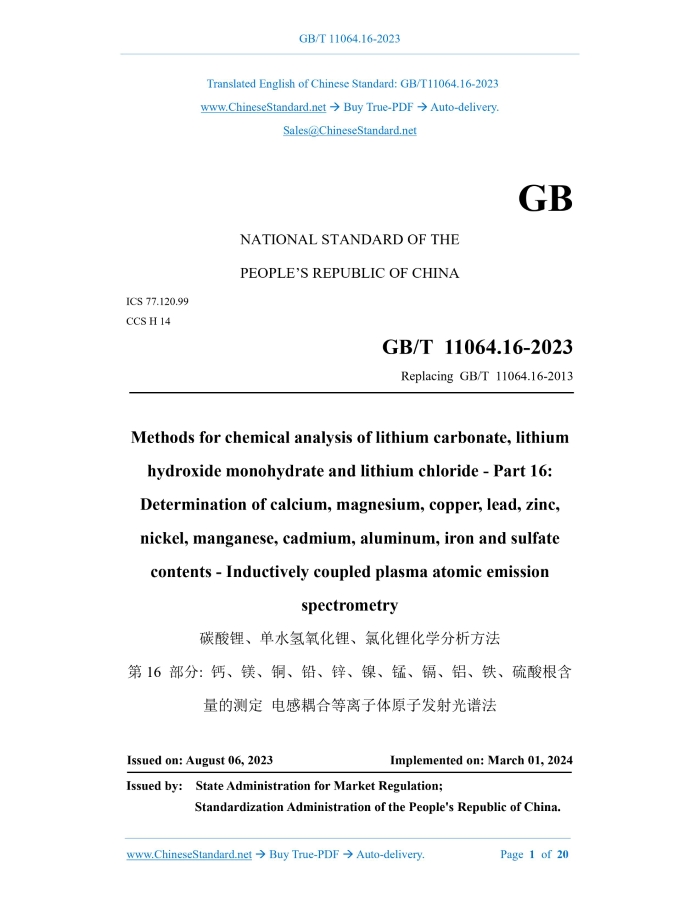 GB/T 11064.16-2023: Methods for chemical analysis of lithium carbonate, lithium hydroxide monohydrate and lithium chloride - Part 16: Determination of calcium, magnesium, copper, lead, zinc, nickel, manganese, cadmium, aluminum, iron and sulfate contents - Inductively coupled plasma atomic emission spectrometry Delivery: 9 seconds. True-PDF full-copy in English & invoice will be downloaded + auto-delivered via email. See step-by-step procedure Status: Valid GB/T 11064.16: Historical versions