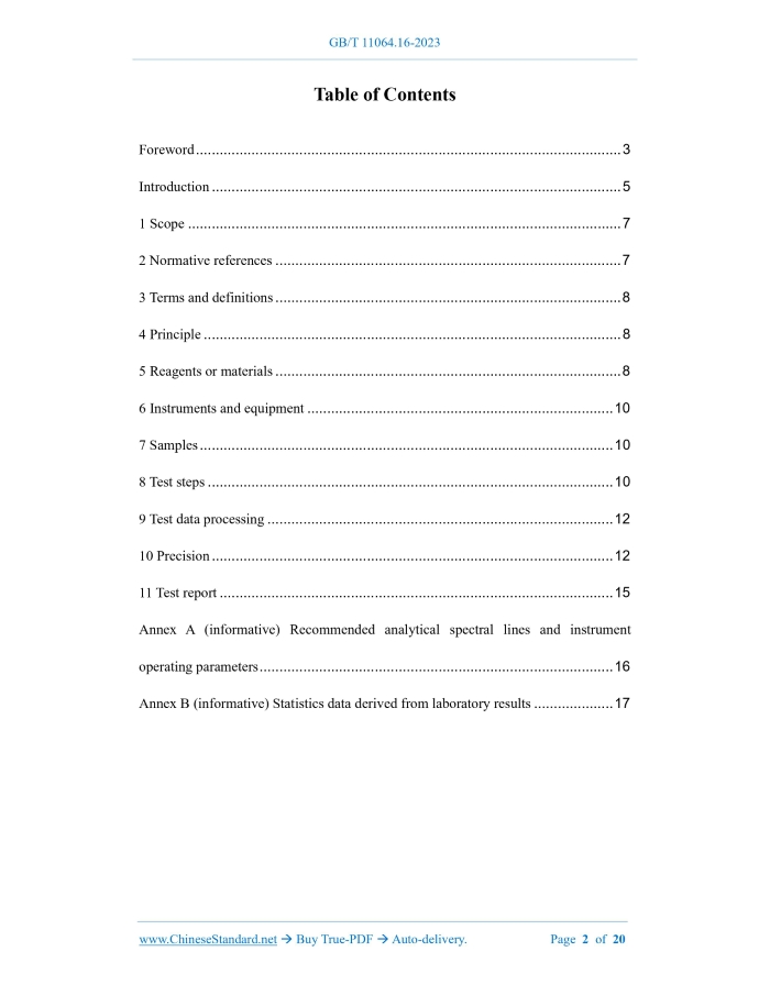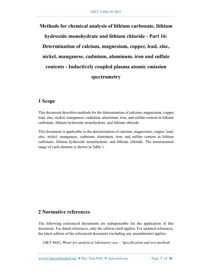 Similar standardsGB/T 11064.16-2023: Methods for chemical analysis of lithium carbonate, lithium hydroxide monohydrate and lithium chloride - Part 16: Determination of calcium, magnesium, copper, lead, zinc, nickel, manganese, cadmium, aluminum, iron and sulfate contents - Inductively coupled plasma atomic emission spectrometry---This is an excerpt. Full copy of true-PDF in English version (including equations, symbols, images, flow-chart, tables, and figures etc.), auto-downloaded/delivered in 9 seconds, can be purchased online: https://www.ChineseStandard.net/PDF.aspx/GBT11064.16-2023 GB NATIONAL STANDARD OF THE PEOPLE’S REPUBLIC OF CHINA ICS 77.120.99 CCS H 14 Replacing GB/T 11064.16-2013 Methods for chemical analysis of lithium carbonate, lithium hydroxide monohydrate and lithium chloride - Part 16. Determination of calcium, magnesium, copper, lead, zinc, nickel, manganese, cadmium, aluminum, iron and sulfate contents - Inductively coupled plasma atomic emission spectrometry Issued on. AUGUST 06, 2023 Implemented on. MARCH 01, 2024 Issued by. State Administration for Market Regulation; Standardization Administration of the People's Republic of China. Table of ContentsForeword... 3 Introduction... 5 1 Scope... 7 2 Normative references... 7 3 Terms and definitions... 8 4 Principle... 8 5 Reagents or materials... 8 6 Instruments and equipment... 10 7 Samples... 10 8 Test steps... 10 9 Test data processing... 12 10 Precision... 12 11 Test report... 15 Annex A (informative) Recommended analytical spectral lines and instrument operating parameters... 16 Annex B (informative) Statistics data derived from laboratory results... 17ForewordThis document was drafted in accordance with the rules given in GB/T 1.1-2020 "Directives for standardization - Part 1.Rules for the structure and drafting of standardizing documents". This document is Part 16 of GB/T 11064 "Methods for chemical analysis of lithium carbonate, lithium hydroxide monohydrate and lithium chloride". The following parts of GB/T 11064 have been issued. - Part 1.Determination of lithium carbonate content -- Acid-alkali titrimetric method; - Part 2.Determination of lithium hydroxide content -- Acid-alkali titrimetric method; - Part 3.Determination of lithium chloride content -- Potentiometric method; - Part 4.Determination of potassium and sodium content -- Flame atomic absorption spectrometric method; - Part 5.Determination of calcium content -- Flame atomic absorption spectrometric method; - Part 6.Determination of magnesium content -- Flame atomic absorption spectrometric method; - Part 7.Determination of iron content - 1, 10-Phenanthroline spectrophotometric method; - Part 8.Determination of silicon content -- Molybdenum blue spectrophotometric method; - Part 9.Determination of sulfate content - Barium sulfate turbidity method; - Part 10.Determination of chloride content -- Silver chloride nephelometry method; - Part 11.Determination of acid-insoluble content -- Gravimetric method; - Part 12.Determination of carbonate content -- Acid-alkali titrimetric method; - Part 13.Determination of aluminum content -- Chrome azurol S-cetylpyridinium bromide spectrophotometric method; - Part 14.Determination of arsenic content -- Molybdenum blue spectrophotometric method; - Part 15.Determination of fluoride content -- Ion selective method; - Part 16.Determination of calcium, magnesium, copper, lead, zinc, nickel, manganese, cadmium and aluminum content -- Inductively coupled plasma atomic emission spectrometry. This document replaces GB/T 11064.16-2013 "Methods for chemical analysis of lithium carbonate, lithium hydroxide monohydrate and lithium chloride -- Part 16. Determination of calcium, magnesium, copper, lead, zinc, nickel, manganese, cadmium and aluminum content -- Inductively coupled plasma atomic emission spectrometry". Compared with GB/T 11064.16-2013, in addition to the structural adjustments and editorial modifications, the main technical changes in this document are as follows. a) Add the determination range. Add the determination of iron and sulfate contents (see Chapter 1 of this Edition; Chapter 1 of Edition 2013); b) Add iron and sulfate standard storage solutions (see 5.13~5.14 of this Edition); c) Change the working curve standard solution concentration. Add iron and sulfate standard solutions (see 8.5 of this Edition; 3.16 of Edition 2013); d) Add the provisions on reproducibility (see 10.2 of this Edition); e) Delete the allowable difference (see 8.2 of Edition 2013). Attention is drawn to the possibility that some of the elements of this document may be the subject of patent rights. The issuing authority shall not be held responsible for identifying any or all such patent rights. This document was proposed by China Nonferrous Metals Industry Association. This document shall be under the jurisdiction of National Technical Committee on Nonferrous Metals of Standardization Administration of China (SAC/TC 243). The drafting organizations of this document. Tianqi Lithium Industry Co., Ltd., Jiangxi Ganfeng Lithium Industry Co., Ltd., Yichun Silver Lithium New Energy Co., Ltd., Yahua Lithium Industry (Ya'an) Co., Ltd., Xinjiang Nonferrous Metals Research Institute, Guohe General (Qingdao) Test and Evaluation Co., Ltd., Zijin Mining Group Co., Ltd., Zhejiang Huayou Cobalt Co., Ltd., Guangdong Bangpu Recycling Technology Co., Ltd., Jiangxi Jiuling Lithium Co., Ltd. Main drafters of this document. Tu Mingjiang, Yang Yanhui, Liao Shiying, Hu Jun, Cheng Xiaoqin, Huang Yanjun, Yi Liang, Li Changdong, Chen Yanxu, Shang Weiling, Wang Xiangde, Wu Jinrong, Xu Ziyan, Xiong Dayu. This document was first issued in 1989.When it was first revised in 2013, it combined GB/T 11064.17-1989 "Lithium carbonate -- Determination of iron and lead contents-- Coprecipitation-flame atomic absorption spectrometric method" and GB/T 11064.18- 1989 "Lithium carbonate -- Determination of calcium, magnesium, copper, zinc, nickel, manganese and cadmium conten