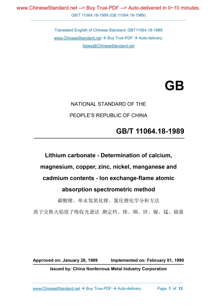 GB/T 11064.18-1989: Lithium carbonate--Determination of calcium, magnesium, copper, zinc, nickel, manganese and cadmium content--Ion exchange-flame atomic absorption spectrometric method Delivery: 9 seconds. True-PDF full-copy in English & invoice will be downloaded + auto-delivered via email. See step-by-step procedure Status: Obsolete