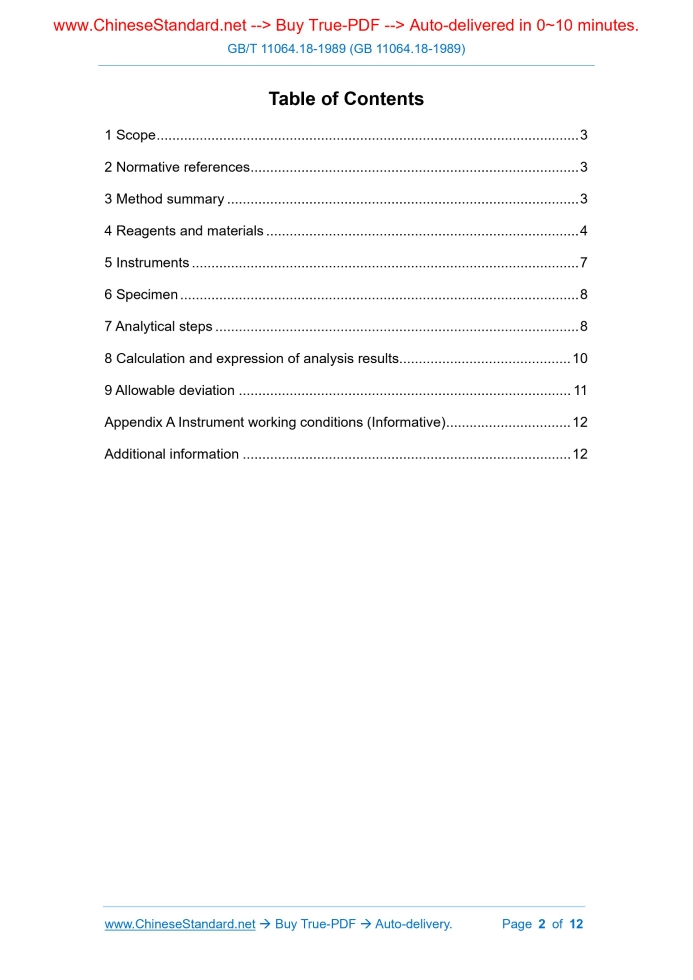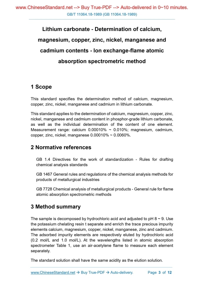 Similar standardsGB/T 11064.18-1989: Lithium carbonate--Determination of calcium, magnesium, copper, zinc, nickel, manganese and cadmium content--Ion exchange-flame atomic absorption spectrometric method---This is an excerpt. Full copy of true-PDF in English version (including equations, symbols, images, flow-chart, tables, and figures etc.), auto-downloaded/delivered in 9 seconds, can be purchased online: https://www.ChineseStandard.net/PDF.aspx/GBT11064.18-1989 GB NATIONAL STANDARD OF THE PEOPLE’S REPUBLIC OF CHINA GB/T 11064.18-1989 Lithium carbonate - Determination of calcium, magnesium, copper, zinc, nickel, manganese and cadmium contents - Ion exchange-flame atomic absorption spectrometric method APPROVED ON: JANUARY 28, 1989 IMPLEMENTED ON: FEBRUARY 01, 1990 Issued by: China Nonferrous Metal Industry Corporation Table of Contents1 Scope ... 3 2 Normative references ... 3 3 Method summary ... 3 4 Reagents and materials ... 4 5 Instruments ... 7 6 Specimen ... 8 7 Analytical steps ... 8 8 Calculation and expression of analysis results... 10 9 Allowable deviation ... 11 Appendix A Instrument working conditions (Informative) ... 12 Additional information ... 12 Lithium carbonate - Determination of calcium, magnesium, copper, zinc, nickel, manganese and cadmium contents - Ion exchange-flame atomic absorption spectrometric method1 ScopeThis standard specifies the determination method of calcium, magnesium, copper, zinc, nickel, manganese and cadmium in lithium carbonate. This standard applies to the determination of calcium, magnesium, copper, zinc, nickel, manganese and cadmium content in phosphor-grade lithium carbonate, as well as the individual determination of the content of one element. Measurement range: calcium 0.00010% ~ 0.010%; magnesium, cadmium, copper, zinc, nickel, manganese 0.00010% ~ 0.0060%.2 Normative referencesGB 1.4 Directives for the work of standardization - Rules for drafting chemical analysis standards GB 1467 General rules and regulations of the chemical analysis methods for products of metallurgical industries GB 7728 Chemical analysis of metallurgical products - General rule for flame atomic absorption spectrometric methods3 Method summaryThe sample is decomposed by hydrochloric acid and adjusted to pH 8 ~ 9. Use the potassium chelating resin t separate and enrich the trace precious impurity elements calcium, magnesium, copper, nickel, manganese, zinc and cadmium. The adsorbed impurity elements are respectively eluted by hydrochloric acid (0.2 mol/L and 1.0 mol/L). At the wavelengths listed in atomic absorption spectrometer Table 1, use an air-acetylene flame to measure each element separately. The standard solution shall have the same acidity as the elution solution. 4.12 Calcium standard solution: 4.12.1 Pipette 25.00 mL of calcium standard stock solution (4.11). Place it in a 250 mL volumetric flask. Use water to dilute it to the mark. Mix it uniformly. Each 1 mL of this solution contains 100 µg of calcium. 4.12.2 Pipette 10.00 mL of calcium standard stock solution (4.12.1). Place it in a 100 mL volumetric flask. Use water to dilute it to the mark. Mix it uniformly. Each 1 mL of this solution contains 10 µg of calcium. 4.13 Magnesium standard stock solution: Weigh 1.000 g pure metallic magnesium (above 99.9%). Place it in a 300 mL beaker. Slowly add 34 mL of hydrochloric acid (4.1) to dissolve it. Heat to boil. Cool to room temperature. Transfer it into a 1000 mL volumetric flask. Use water to dilute it to the mark. Mix it uniformly. Each 1 mL of this solution contains 1 mg of magnesium. 4.14 Magnesium standard solution: 4.14.1 Pipette 25.00 mL of magnesium standard stock solution (4.13). Put it in a 250 mL volumetric flask. Use water to dilute it to the mark. Mix it uniformly. Each 1 mL of this solution contains 100 µg of magnesium. 4.14.2 Pipette 10.00 mL of magnesium standard stock solution (4.14.1). Put it in a 100 mL volumetric flask. Use water to dilute it to the mark. Mix it uniformly. Each 1 mL of this solution contains 10 µg of magnesium. 4.15 Copper standard stock solution: Weigh 1.000 g of pure metallic copper (above 99.9%) in a 300 mL beaker. Add 20 mL of nitric acid (1 + 1, superior grade pure) to dissolve. Heat to evaporate it dry. Add 10.0 mL of sulfuric acid. Heat carefully to evaporate to sulfuric acid fumes. Cool it. Add water and boil until the salt is completely dissolved. Cool to room temperature. Transfer it into a 1000 mL volumetric flask. Use water to dilute it to the mark. Mix it uniformly. Each 1 mL of this solution contains 1 mg of copper. 4.16 Zinc standard stock solution: Weigh 1.000 g of pure metallic zinc (above 99.9%) in a 300 mL beaker. Add 25.0 mL of hydrochloric acid (1 + 1, superior grade pure) to dissolve it. Heat to boil it. Cool it to room temperature. Transfer it into a 1000 mL volumetric flask. Use water to dilute it to the mark. Mix it uniformly. Each 1 mL of this solution contains 1 mg of zinc. 4.17 Nickel standard stock solution: Weigh 1.000 g of pure metallic nickel (above 99.9%) in a 300 mL beaker. Add 15 mL of nitric acid (ρ1.42 g/mL, superior grade pure). Heat at low temperature to completely dissolve it. Boil it. Cool it to room temperature. Transfer it into a 1000 mL volumetric flask. Use water to dilute it to the mark. Mix it uniformly. Each 1 mL of this solution contains 1 mg of nickel. 4.18 Manganese standard stock solution: Weigh 1.000 g of pure metallic manganese (above 99.9%, use diluted sulfuric acid to wash off the oxide from the surface of the manganese before weighing; then use water to wash off the acid; bake it dry). Place it in a 300 mL beaker. Add 20 mL of hydrochloric acid (1 + 1, superior grade pure). Heat to dissolve it. Cool it to room temperature. Transfer it into a 1000 mL volumetric flask. Use water to dilute it to the mark. Mix it uniformly. Each 1 mL of this solution contains 1 mg of manganese. 4.19 Cadmium standard stock solution: Weigh 1.000 g of pure metallic cadmium (above 9
