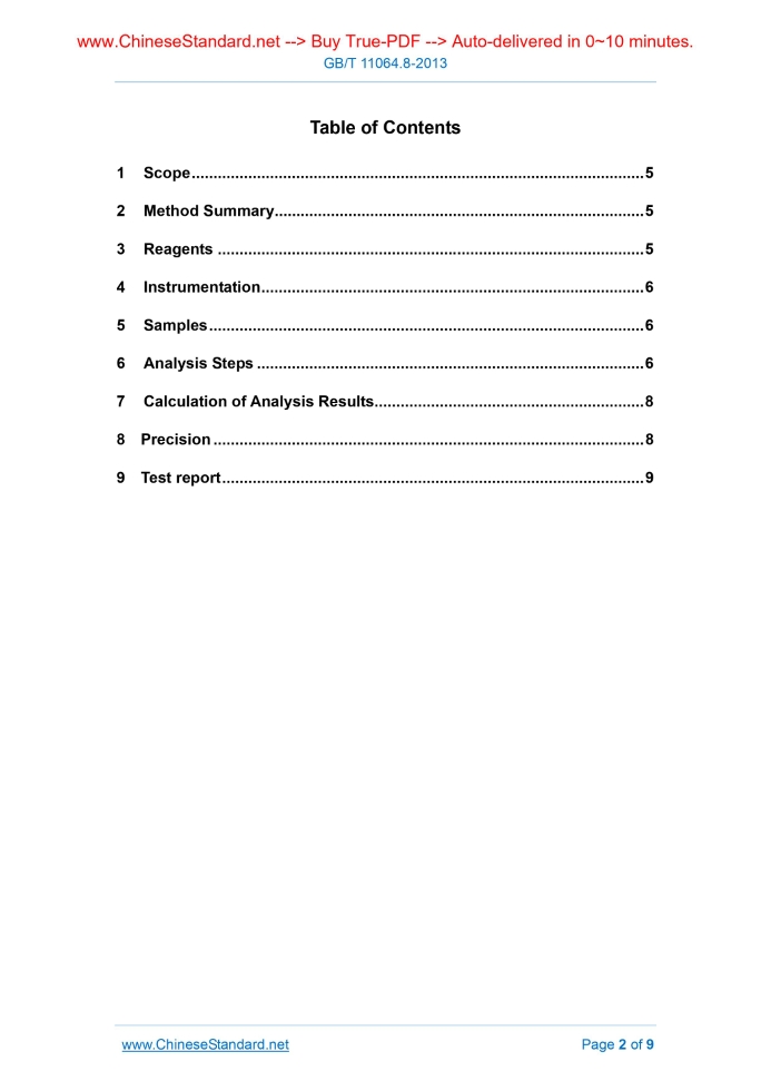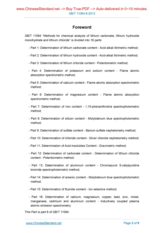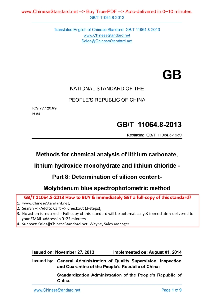 Similar standardsGB/T 11064.8-2013: Methods for chemical analysis of lithium carbonate, lithium hydroxide monohydrate and lithium chloride -- Part 8: Determination of silicon content -- Molybdenum blue spectrophotometric method---This is an excerpt. Full copy of true-PDF in English version (including equations, symbols, images, flow-chart, tables, and figures etc.), auto-downloaded/delivered in 9 seconds, can be purchased online: https://www.ChineseStandard.net/PDF.aspx/GBT11064.8-2013 GB NATIONAL STANDARD OF THE PEOPLE’S REPUBLIC OF CHINA ICS 77.120.99 H 64 Replacing GB/T 11064.8-1989 Methods for chemical analysis of lithium carbonate, lithium hydroxide monohydrate and lithium chloride - Part 8.Determination of silicon content- Molybdenum blue spectrophotometric method Issued on. NOVEMBER 27, 2013 Implemented on. AUGUST 01, 2014 Issued by. General Administration of Quality Supervision, Inspection and Quarantine of the People’s Republic of China; Standardization Administration of the People’s Republic of China. Table of Contents1 Scope... 5 2 Method Summary... 5 3 Reagents... 5 4 Instrumentation... 6 5 Samples... 6 6 Analysis Steps... 6 7 Calculation of Analysis Results... 8 8 Precision... 8 9 Test report... 9ForewordGB/T 11064 “Methods for chemical analysis of lithium carbonate, lithium hydroxide monohydrate and lithium chloride” is divided into 16 parts. - Part 1.Determination of lithium carbonate content - Acid-alkali titrimetric method; - Part 2.Determination of lithium hydroxide content - Acid-alkali titrimetric method; - Part 3.Determination of lithium chloride content - Potentiometric method; - Part 4.Determination of potassium and sodium content - Flame atomic absorption spectrometric method; - Part 5.Determination of calcium content - Flame atomic absorption spectrometric method; - Part 6.Determination of magnesium content - Flame atomic absorption spectrometric method; - Part 7.Determination of iron content - 1,10-phenanthroline spectrophotometric method; - Part 8.Determination of silicon content - Molybdenum blue spectrophotometric method; - Part 9.Determination of sulfate content - Barium sulfate nephelometry method; - Part 10.Determination of chloride content - Silver chloride nephelometry method; - Part 11.Determination of Acid-insolubles Content - Gravimetric method; - Part 12.Determination of carbonate content - Determination of lithium chloride content - Potentiometric method; - Part 13.Determination of aluminum content - Chromazurol S-cetylpyridine bromide spectrophotometric method; - Part 14.Determination of arsenic content - Molybdenum blue spectrophotometric method; - Part 15.Determination of fluoride content - Ion selective method; - Part 16.Determination of calcium, magnesium, copper, lead, zinc, nickel, manganese, cadmium and aluminum content - Inductively coupled plasma atomic emission spectrometry. This Part is part 8 of GB/T 11064. This Part is drafted in accordance with rules given in GB/T 1.1-2009. This Part replaces GB/T 11064.8-1989 "Lithium carbonate, lithium hydroxide monohydrate and lithium chloride - Determination of silicon content - Molybdenum blue spectrophotometric method". Compared with GB/T 11064.8-1989, the main changes of this Part are as follows. - ADD the repeatability terms; - RE-EDIT the text format; ADD the test report. This Part shall be under the jurisdiction of National Standardization Technical Committee of Nonferrous Metals (SAC/TC 243). Drafting organizations of this Part. Sichuan Tianqi Lithium Industries Inc., Xinjiang Research Institute of Non ferrous Metals, and Xinjiang Wuxin Lithium Salt Development Co., Ltd. The main drafters of this Part. Gou Haixia, Luo Yuping, Zhu Xiangyu, Guan Yuzhen, Mi Yongqiang, Zhang Xiuli, and Sun Tao. The historical version replaced by this Part is as follows. - GB/T 11064.8-1989. GB/T 11064.8-2013 Methods for chemical analysis of lithium carbonate, lithium hydroxide monohydrate and lithium chloride - Part 8.Determination of silicon content - Molybdenum blue spectrophotometric method 1 Scope This part of GB/T 11064 specifies the determination method of silicon content in lithium carbonate, in lithium hydroxide monohydrate, and in lithium chloride. This Part applies to the determination of silicon content in lithium carbonate, in lithium hydroxide monohydrate, and in lithium chloride. The determination range. 0.000 5%~0.050%. 2 Method Summary The sample is dissolved with hydrochloric acid. In weak acid medium, the silicon and ammonium molybdate react to produce molybdosilicate yellow heteropolyacid. The interference of phosphor and arsenic can be eliminated by sulfuric acid and oxalic acid. The molybdosilicate yellow can be reduced to molybdosilicate blue with ascorbic acid, so that the absorbance can be determined at the 800nm wavelength of a spectrophotometer. 3 Reagents Unless otherwise specified, the reagent used in this Part is an analytical pure reagent, and the water used is the secondary deionized water. 3.1 Hydrochloric acid (1+1), GR 3.5 Ammonium molybdate solution (50g/L). filtered if necessary, stored in plastic bottles. 3.6 Oxalic acid solution (50g/L). stored in plastic bottles. 3.7 Ascorbic acid solution (20g/L). prepared when it is used. 3.8 P-Nitrophenol indicator (1g/L). GB/T 11064.8-2013 3.9 Silicon standard stock solution. weigh 0.2140g of silicon dioxide (spectroscopically pure) which has been burnt at 1,000°C for 1h in advance, and then cooled down to room temperature. Place it into a platinum crucible in which there is 1g of anhydrous sodium carbonate (GR). Add 3g of anhydrous sodium carbonate to the silicon dioxide; put them in a high temperature furnace at 950°C~1,000°C to melt to be bright red and clear. Take them out; cool down; put them into a polytetrafluoroethylene (PTFE) beaker. Extract them with hot water; heat them until the solution is clear; then cool it down. Transfer it to a 1,000 volumetric flask; dilute it with water to the scale; shake up. Transfer i