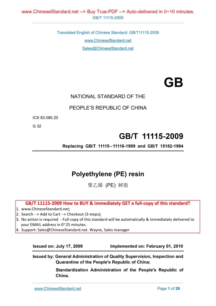 GB/T 11115-2009: Polyethylene (PE) resin Delivery: 9 seconds. True-PDF full-copy in English & invoice will be downloaded + auto-delivered via email. See step-by-step procedure Status: Valid GB/T 11115: Historical versions