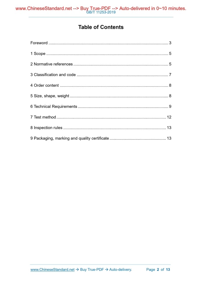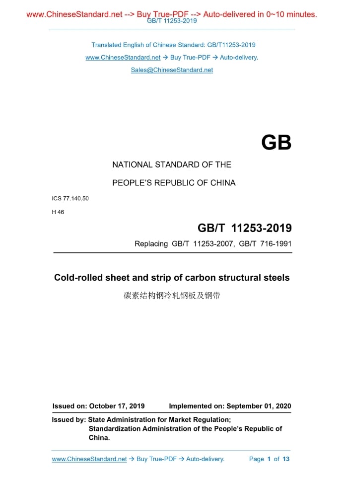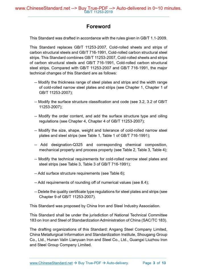 Similar standardsGB/T 11253-2019: Cold-rolled sheet and strip of carbon structural steels---This is an excerpt. Full copy of true-PDF in English version (including equations, symbols, images, flow-chart, tables, and figures etc.), auto-downloaded/delivered in 9 seconds, can be purchased online: https://www.ChineseStandard.net/PDF.aspx/GBT11253-2019NATIONAL STANDARD OF THE PEOPLE’S REPUBLIC OF CHINA ICS 77.140.50 H 46 Replacing GB/T 11253-2007, GB/T 716-1991 Cold-rolled sheet and strip of carbon structural steels Issued on. OCTOBER 17, 2019 Implemented on. SEPTEMBER 01, 2020 Issued by. State Administration for Market Regulation; Standardization Administration of the People’s Republic of China. Table of ContentsForeword... 3 1 Scope... 5 2 Normative references... 5 3 Classification and code... 7 4 Order content... 8 5 Size, shape, weight... 8 6 Technical Requirements... 9 7 Test method... 12 8 Inspection rules... 13 9 Packaging, marking and quality certificate... 13ForewordThis Standard was drafted in accordance with the rules given in GB/T 1.1-2009. This Standard replaces GB/T 11253-2007, Cold-rolled sheets and strips of carbon structural steels and GB/T 716-1991, Cold-rolled carbon structural steel strips. This Standard combines GB/T 11253-2007, Cold-rolled sheets and strips of carbon structural steels and GB/T 716-1991, Cold-rolled carbon structural steel strips. Compared with GB/T 11253-2007 and GB/T 716-1991, the major technical changes of this Standard are as follows. -- Modify the thickness range of steel plates and strips and the width range of cold-rolled narrow steel plates and strips (see Chapter 1, Chapter 1 of GB/T 11253-2007); -- Modify the surface structure classification and code (see 3.2, 3.2 of GB/T 11253-2007); -- Modify the order content, and add the surface structure type and oiling regulations (see Chapter 4, Chapter 4 of GB/T 11253-2007); -- Modify the size, shape, weight and tolerance of cold-rolled narrow steel plates and steel strips (see Table 1, Table 1 of GB/T 716-1991); -- Add designation-Q325 and corresponding chemical composition, mechanical property and process property (see Table 2, Table 3, Table 4); -- Modify the technical requirements for cold-rolled narrow steel plates and steel strips (see Table 3, Table 3 of GB/T 716-1991); -- Add surface structure requirements (see Table 6); -- Add requirements of rounding off of numerical values (see 8.4); -- Delete the quality certificate type regulations for steel plates and strips (see Chapter 9 of GB/T 11253-2007). This Standard was proposed by China Iron and Steel Industry Association. This Standard shall be under the jurisdiction of National Technical Committee 183 on Iron and Steel of Standardization Administration of China (SAC/TC 183). The drafting organizations of this Standard. Angang Steel Company Limited, China Metallurgical Information and Standardization Institute, Shougang Group Co., Ltd., Hunan Valin Lianyuan Iron and Steel Co., Ltd., Guangxi Liuzhou Iron and Steel Group Company Limited. The drafters of this Standard. Su Haolu, Huang Qiuju, Li Qian, Hou Jie, Tang Mu, Tian Fei, Jiang Cailing, Qi Bing, Guan Jichun, Zhang Weixu, Wang Haiquan, Yang Yuebiao, Wang Yue, Xin Lifeng. The previous versions of the standards which are replaced by this Standard are. -- GB/T 11253-1989, GB/T 11253-2007; -- GB/T716-1983, GB/T716-1991. Cold-rolled sheet and strip of carbon structural steels1 ScopeThis Standard specifies the order content, size, shape, weight, technical requirements, test methods, inspection rules, packaging, marking and quality certificates of cold-rolled sheet and strip of carbon structural steels. This Standard applies to cold-rolled sheet and strip of carbon structural steels with a thickness of not more than 4 mm, including cold-rolled wide strip and shear steel strip, slit steel strip (referred to as wide steel plate and steel strip) with a width of not less than 600 mm AND cold-rolled narrow steel strip and shear steel plate (referred to as narrow steel plate and steel strip) with a width range of 250mm ~ < 600mm. A single cold-rolled steel sheet of which the width is not less than 600 mm can also refer to it to perform.2 Normative referencesThe following documents are indispensable for the application of this document. For dated references, only the dated version applies to this document. For undated references, the latest edition (including all amendments) applies to this document. GB/T 222, Permissible tolerances for chemical composition of steel products GB/T 223.3, Methods for chemical analysis of iron, steel and alloy; The diantipyrylmethane phosphomolybdate gravimetric method for the determination of phosphorus content GB/T 223.9, Iron, steel and alloy. Determination of aluminium content. Chrome azurol S photometric method GB/T 223.11, Iron, steel and alloy. Determination of chromium content. Visual titration or potentiometric titration method GB/T 223.18, Methods for chemical analysis of iron steel and alloy. The sodium thiosulfate separation iodimetric method for the determination of cupper content3 Classification and code3.1 Steel plates and strips are divided according to surface quality. 3.2 Steel plates and strips are divided according to their surface structure.4 Order content4.1 The contract or order in accordance with this Standard shall include the following information. 4.2 If the size and unevenness accuracy, surface quality level, surface structure type, edge state and packaging method are not indicated in the order contract, the standard products are supplied to pitted-surface oil-coated cutting-edge plats or strips according to ordinary grade and unevenness accuracy, higher level surface quality and surface structure, and packaged according to the packaging that is provided by the supplier.5 Size, shape, weight5.1 The size, shape, weight and allowable deviation of wide steel plates and steel strips shall comply with the provisions of GB/T 708. 5.2 The size, shape, w