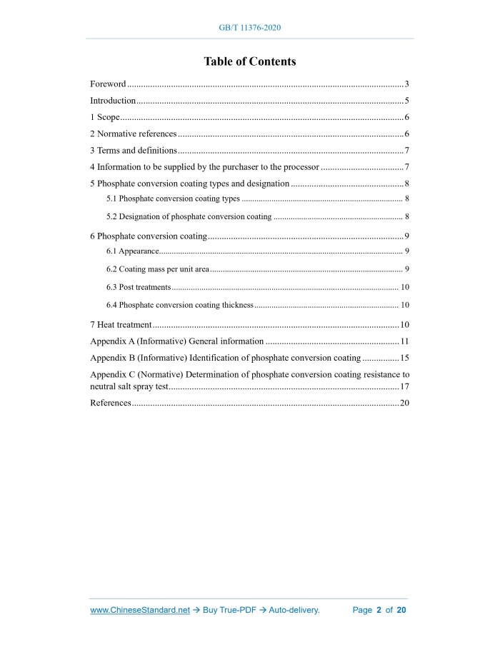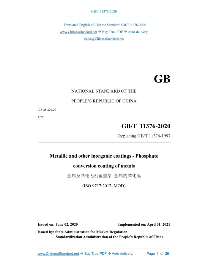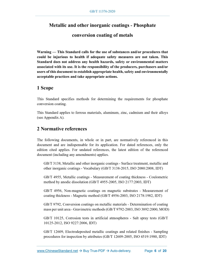 Similar standardsGB/T 11376-2020: Metallic and other inorganic coatings--Phosphate conversion coating of metals---This is an excerpt. Full copy of true-PDF in English version (including equations, symbols, images, flow-chart, tables, and figures etc.), auto-downloaded/delivered in 9 seconds, can be purchased online: https://www.ChineseStandard.net/PDF.aspx/GBT11376-2020GB NATIONAL STANDARD OF THE PEOPLE’S REPUBLIC OF CHINA ICS 25.220.20 A 29 Replacing GB/T 11376-1997 Metallic and other inorganic coatings - Phosphate conversion coating of metals (ISO 9717.2017, MOD) Issued on. JUNE 02, 2020 Implemented on. APRIL 01, 2021 Issued by. State Administration for Market Regulation; Standardization Administration of the People’s Republic of China. Table of ContentsForeword... 3 Introduction... 5 1 Scope... 6 2 Normative references... 6 3 Terms and definitions... 7 4 Information to be supplied by the purchaser to the processor... 7 5 Phosphate conversion coating types and designation... 8 5.1 Phosphate conversion coating types... 8 5.2 Designation of phosphate conversion coating... 8 6 Phosphate conversion coating... 9 6.1 Appearance... 9 6.2 Coating mass per unit area... 9 6.3 Post treatments... 10 6.4 Phosphate conversion coating thickness... 10 7 Heat treatment... 10 Appendix A (Informative) General information... 11 Appendix B (Informative) Identification of phosphate conversion coating... 15 Appendix C (Normative) Determination of phosphate conversion coating resistance to neutral salt spray test... 17 References... 20ForewordThis Standard was drafted in accordance with the rules given in GB/T 1.1-2009. This Standard replaces GB/T 11376-1997 Phosphate conversion coatings for metals. Compared with GB/T 11376-1997, the major changes of this Standard are as follows. — MODIFY “Normative references” (see Chapter 2; Chapter 2 of the 1997 edition); — ADD terms and definitions (see Chapter 3); — MODIFY “Information to be supplied by the purchaser to the processor” (see Chapter 4; Chapter 3 of the 1997 edition); — MODIFY “Phosphate conversion coating types and designation” (see Chapter 5; Chapter 4 of the 1997 edition); — MODIFY “Phosphate conversion coating” (see Chapter 6; Chapter 6 of the 1997 edition); — MODIFY the appendixes; — ADD “References”. This Standard uses the redrafting method to modify and adopt ISO 9717.2017 Metallic and other inorganic coatings - Phosphate conversion coating of metals. The technical differences between this Standard and ISO 9717.2017 and the reasons are as follows. — With regard to the normative references, this Standard makes technical adjustments to adapt to the technical conditions of China. The adjustments are concentrated in Chapter 2 “Normative references”, and the specific adjustments are as follows. ● Use GB/T 3138 which is equivalent to the international standard to replace ISO 2080 (see Chapter 3); ● Use GB/T 4955 which is equivalent to the international standard to replace ISO 2177 (see 6.4); ● Use GB/T 4956 which is equivalent to the international standard to replace ISO 2178 (see 6.4); ● Use GB/T 9792 which modifies and adopts the international standard to replace ISO 3892 (see 6.2); ● Use GB/T 10125 which is equivalent to the international standard to replace ISO 9227 (see 6.3); ● Use GB/T 12609 which is equivalent to the international standard to replace ISO 4519 (see Chapter 4); ● Use GB/T 16921 which is equivalent to the international standard to replace ISO 3497 (see 6.4). This Standard makes the following editorial changes. — ADJUST the numbers of Appendix A, Appendix B, and Appendix C according to the order mentioned in the standard text. This Standard was proposed by China Machinery Industry Federation. This Standard shall be under the jurisdiction of National Technical Committee on Metallic and Non-metallic Coating of Standardization Administration of China (SAC/TC 57). Drafting organizations of this Standard. Wuhan Research Institute of Materials Protection, Wuhan Material Protection Surface New Materials Co., Ltd., Zhaoqing University, Cwb Automotive Electronics Co., Ltd., Wenzhou Ruiming Industrial Co., Ltd., Foshan Kefu Technology Co., Ltd. Main drafters of this Standard. Li Xinli, Zhong Ping, Su Hui, Yi Juan, Wu Xiaosong, Zeng Huan, Yuan Xing, Xia Jingzhong, Xu Zhaoyu, Tan Wuyong, Lin Juan, Zhou Shuo, He Dedao, Li Ni, Lu Yang. The previous version – replaced by this Standard – of the standard is. — GB/T 11376-1989, GB/T 11376-1997.1 ScopeThis Standard specifies methods for determining the requirements for phosphate conversion coating.2 Normative referencesThe following documents, in whole or in part, are normatively referenced in this document and are indispensable for its application. For dated references, only the edition cited applies. For undated references, the latest edition of the referenced document (including any amendments) applies.3 Terms and definitionsFor the purposes of this document, the terms and definitions given in GB/T 3138 apply. ISO and IEC maintain terminological databases for use in standardization at the following addresses.4 Information to be supplied by the purchaser to the processorThe following information shall be provided by the purchaser.5 Phosphate conversion coating types and designationThe designation of the phosphate conversion coating shall consist of the following information.6 Phosphate conversion coatingThe coating mass is measured in accordance with the procedures specified in GB/T 9792. The thickness of phosphate conversion coating can be measured according to the following methods.7 Heat treatmentHeat treatment after the phosphating is not recommended, because the phosphate layer will be damaged at a temperature higher than 120 °C.Appendix A(Informative) General information Phosphate conversion coatings are produced by treatment with solutions, the main constituents of which are specified in Table A.1. ......Source: Above contents are