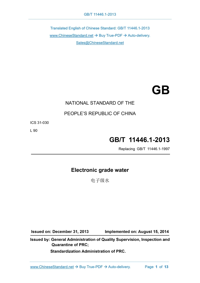 GB NATIONAL STANDARD OF THE PEOPLE’S REPUBLIC OF CHINA ICS 31-030 L 90 Replacing GB/T 11446.1-1997 Electronic grade water Issued on. DECEMBER 31, 2013 Implemented on. AUGUST 15, 2014 Issued by. General Administration of Quality Supervision, Inspection and Quarantine of PRC; Standardization Administration of PRC.