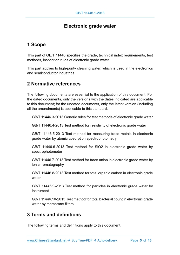 The following documents are essential to the application of this document. For the dated documents, only the versions with the dates indicated are applicable to this document; for the undated documents, only the latest version (including all the amendments) is applicable to this standard. GB/T 11446.3-2013 Generic rules for test methods of electronic grade water GB/T 11446.4-2013 Test method for resistivity of electronic grade water GB/T 11446.5-2013 Test method for measuring trace metals in electronic grade water by atomic absorption spectrophotometry GB/T 11446.6-2013 Test method for SiO2 in electronic grade water by spectrophotometer GB/T 11446.7-2013 Test method for trace anion in electronic grade water by ion chromatography